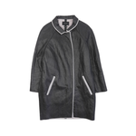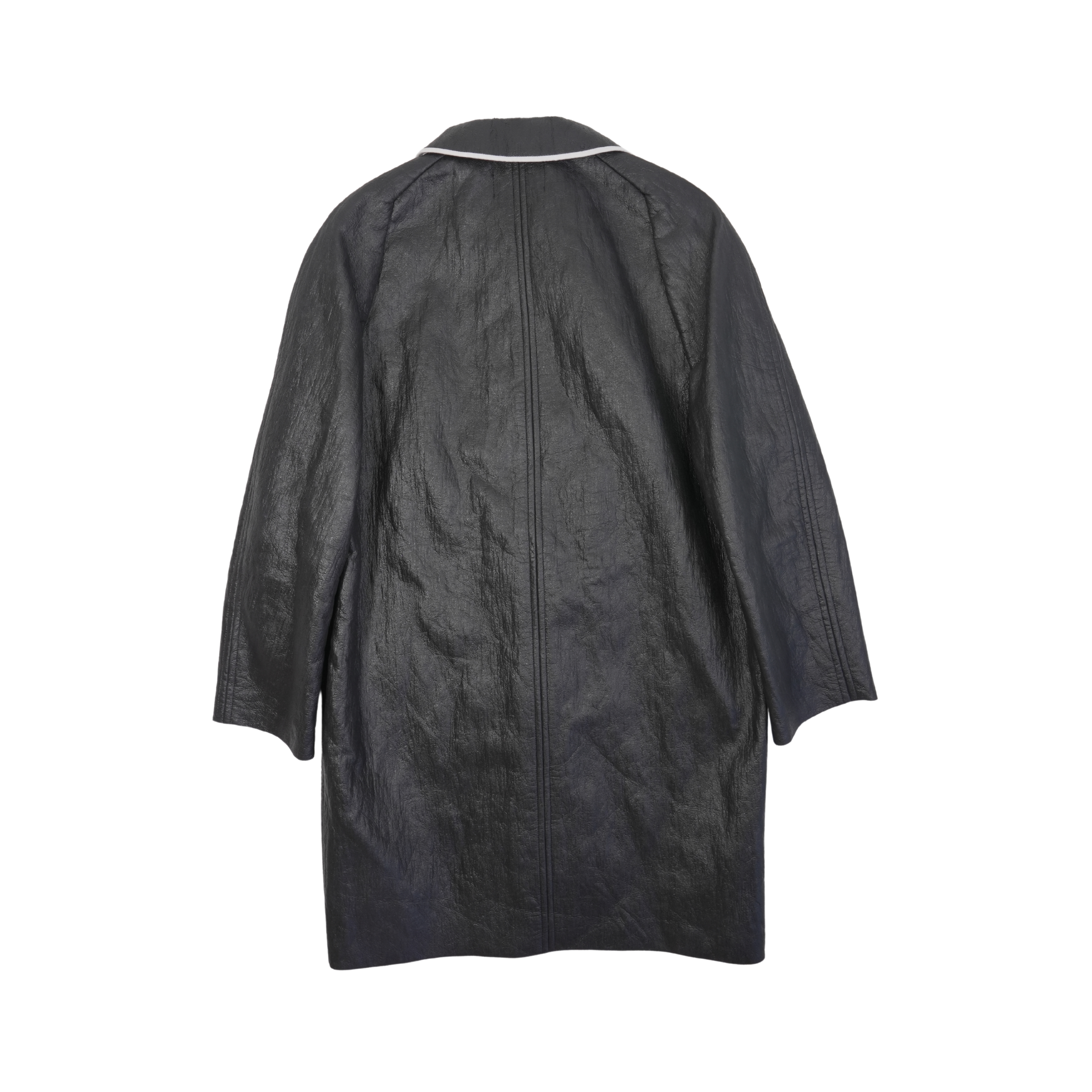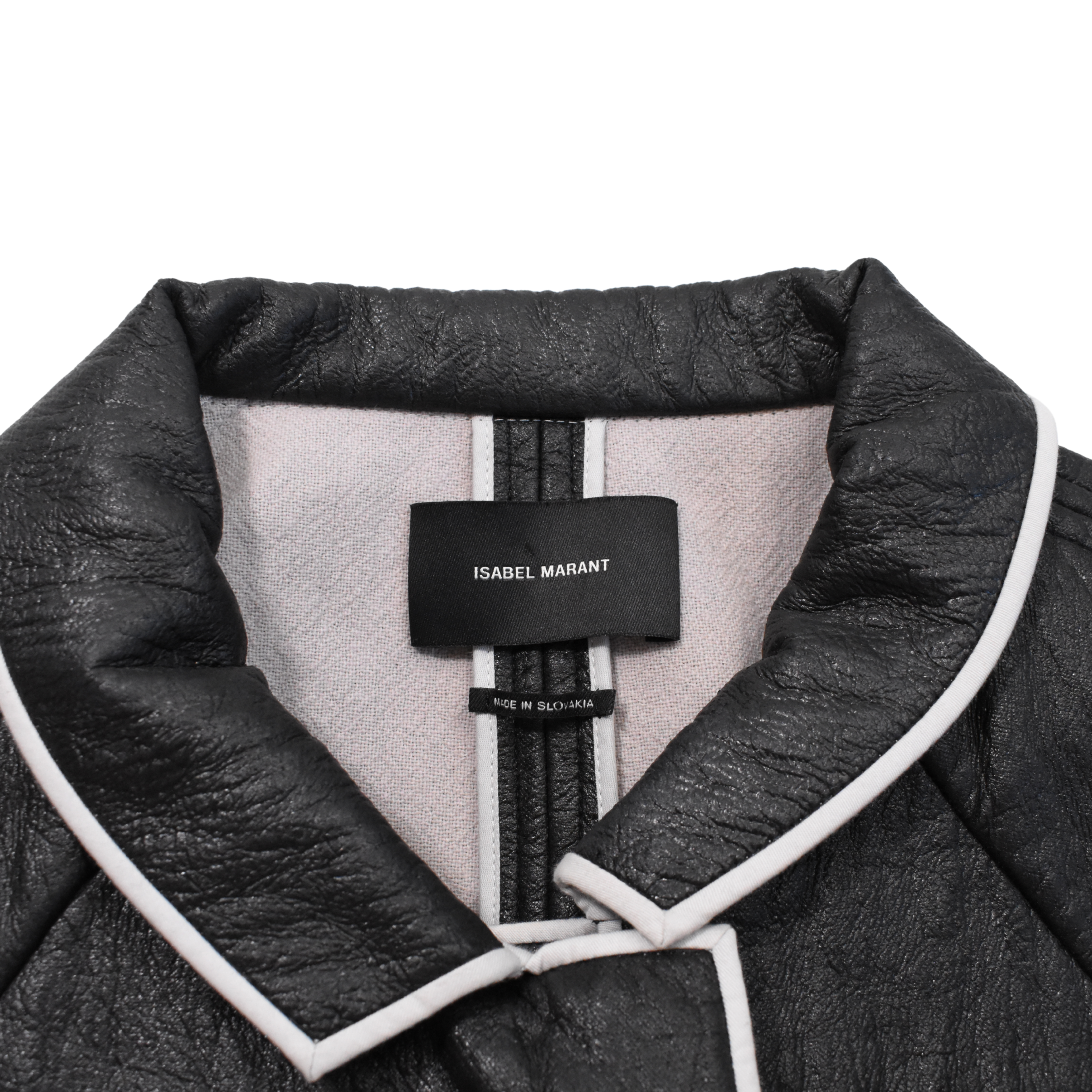 Isabel Marant raglan mid-length jacket in black waxed wool. Features white trim, contrast slip pockets, and hook and eye closures.