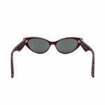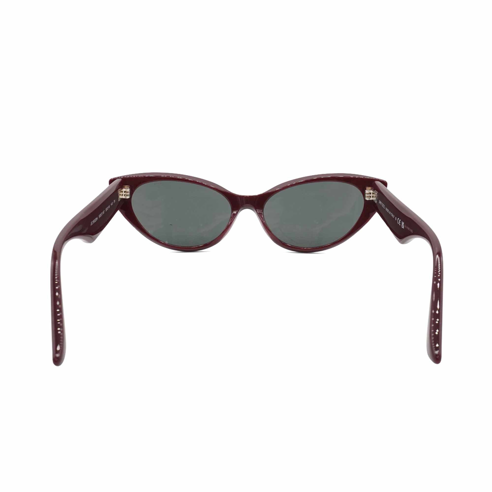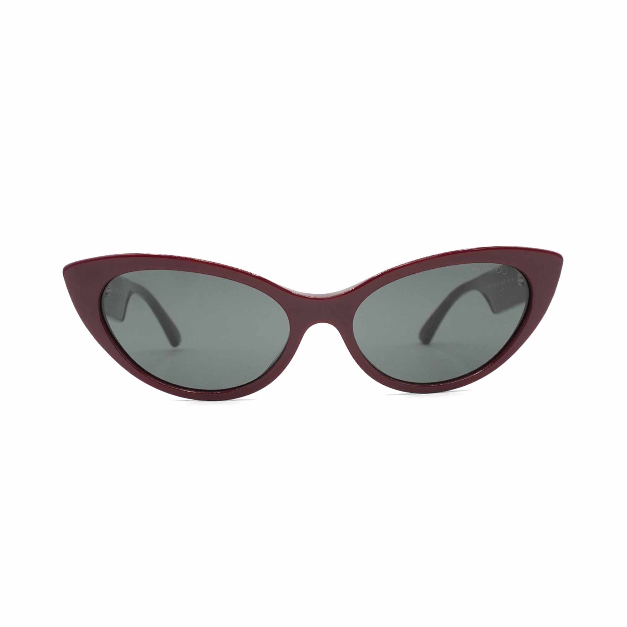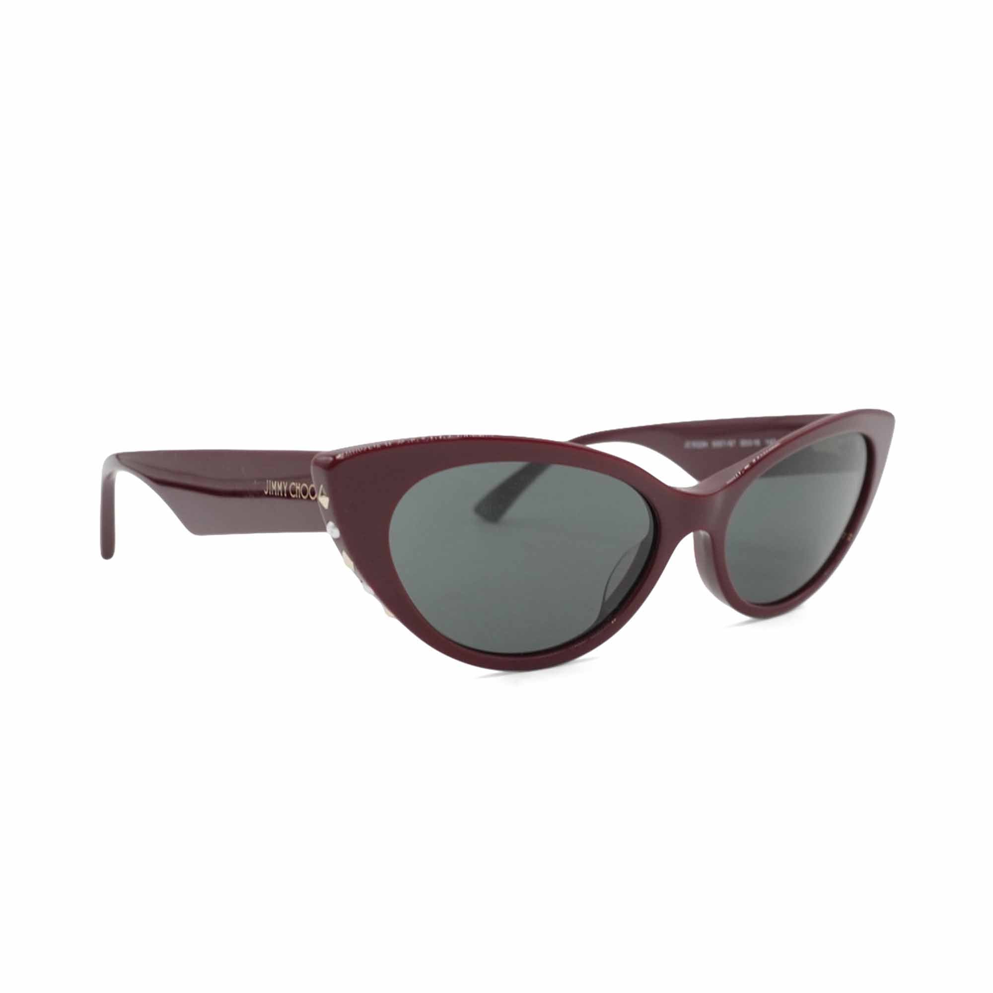 Jimmy Choo cat-eye sunglasses in burgundy acetate with black lenses and gold and pearl stud trim on the side lens.