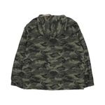 Kith 'Ginza' reversible jacket in tonal green heathered camo print with two front flap pockets, side seam pockets, hood and barrel cuffs. The reverse side features beige nylon fabric with four slip pockets and brown buttons.