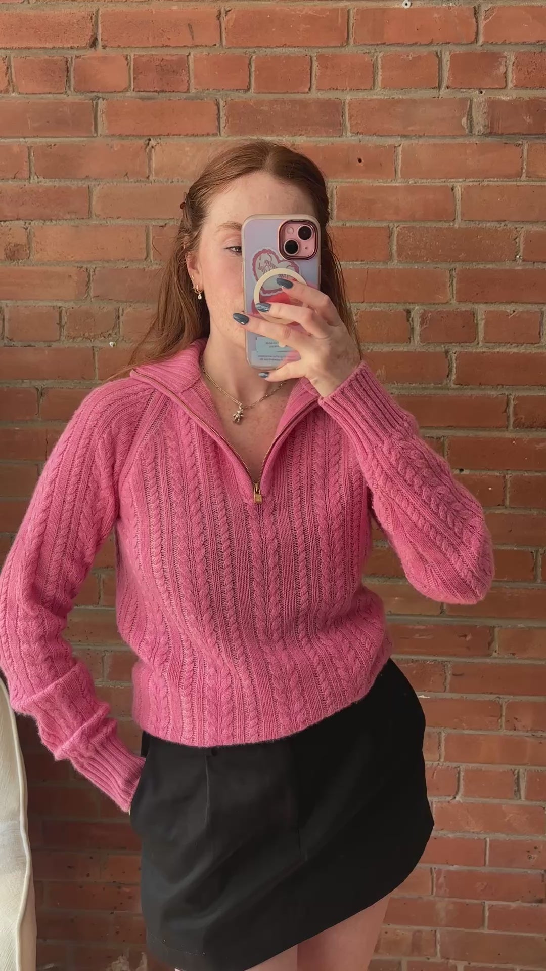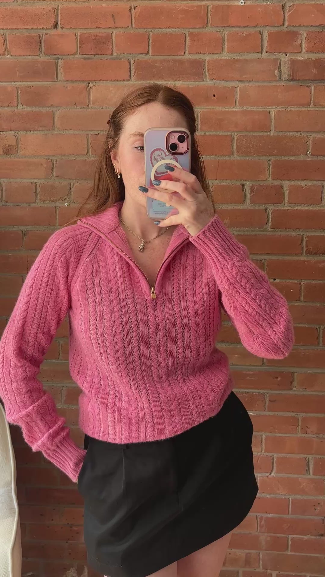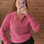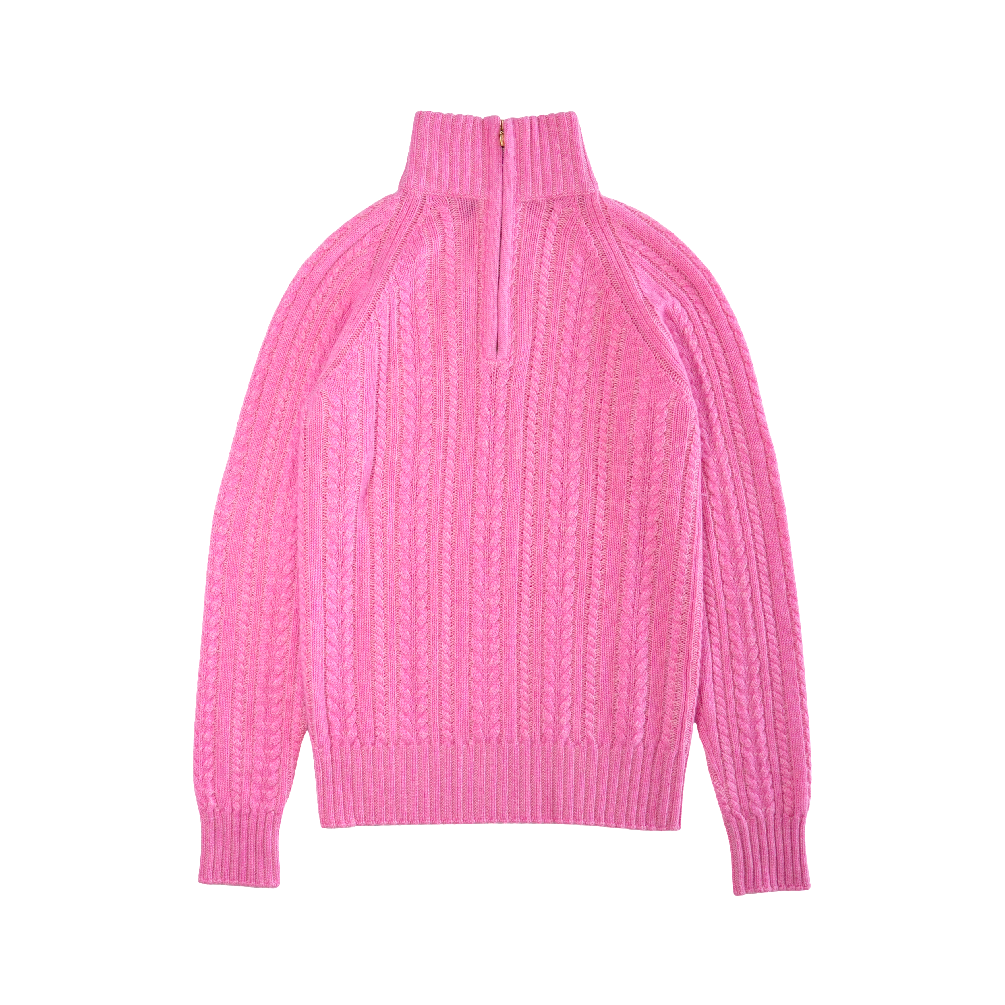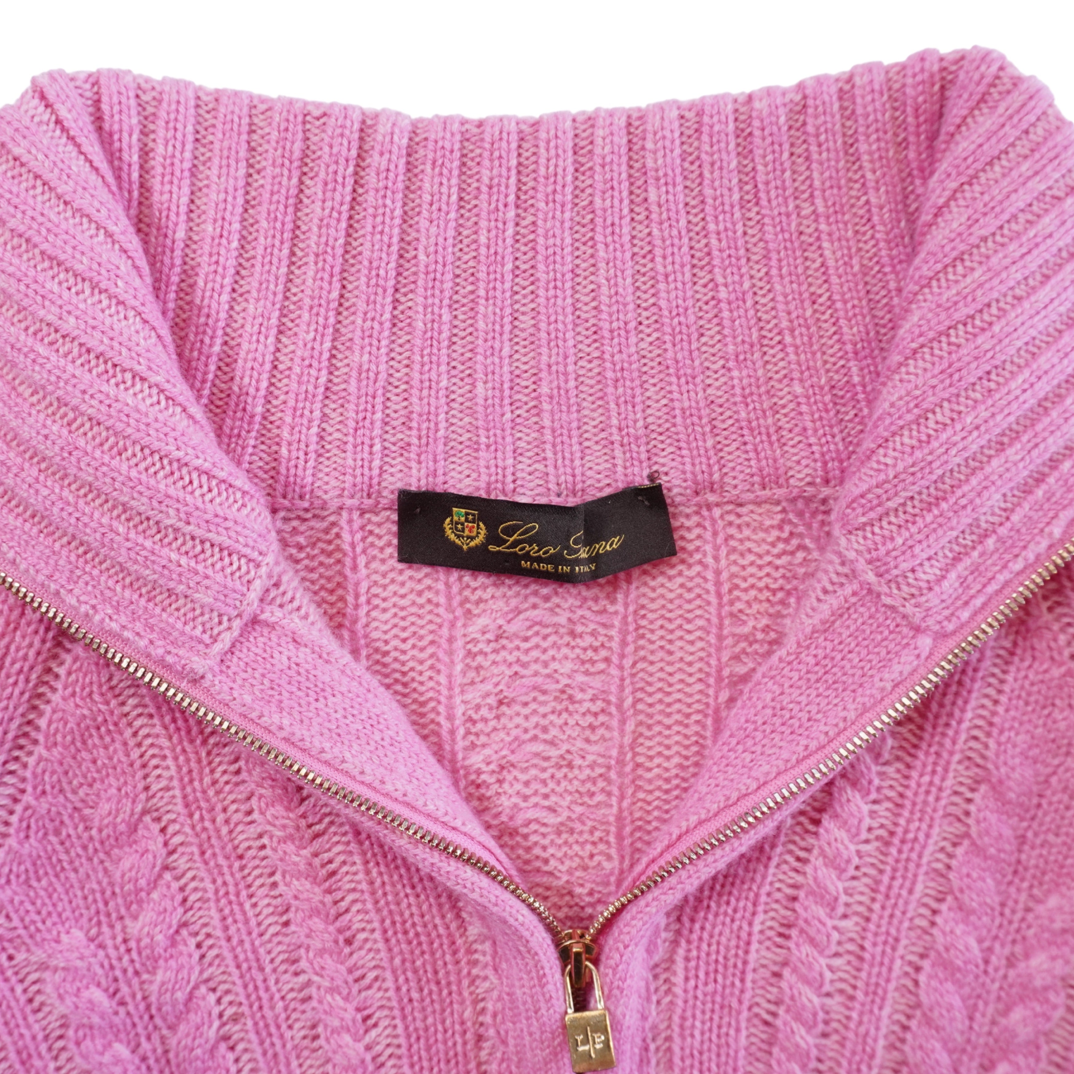 Loro Piana half-zip sweater in bright pink cable knit cashmere with a half-zip opening in gold hardware and a small lock zipper pull.