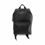 Louis Vuitton 'Discovery' backpack in black 'eclipse' monogram coated canvas with black leather trim, adjustable shoulder straps, and a large front zip pocket. The bag has a top zip opening in silver hardware, opening to reveal a black canvas interior with large slip pockets.
