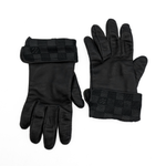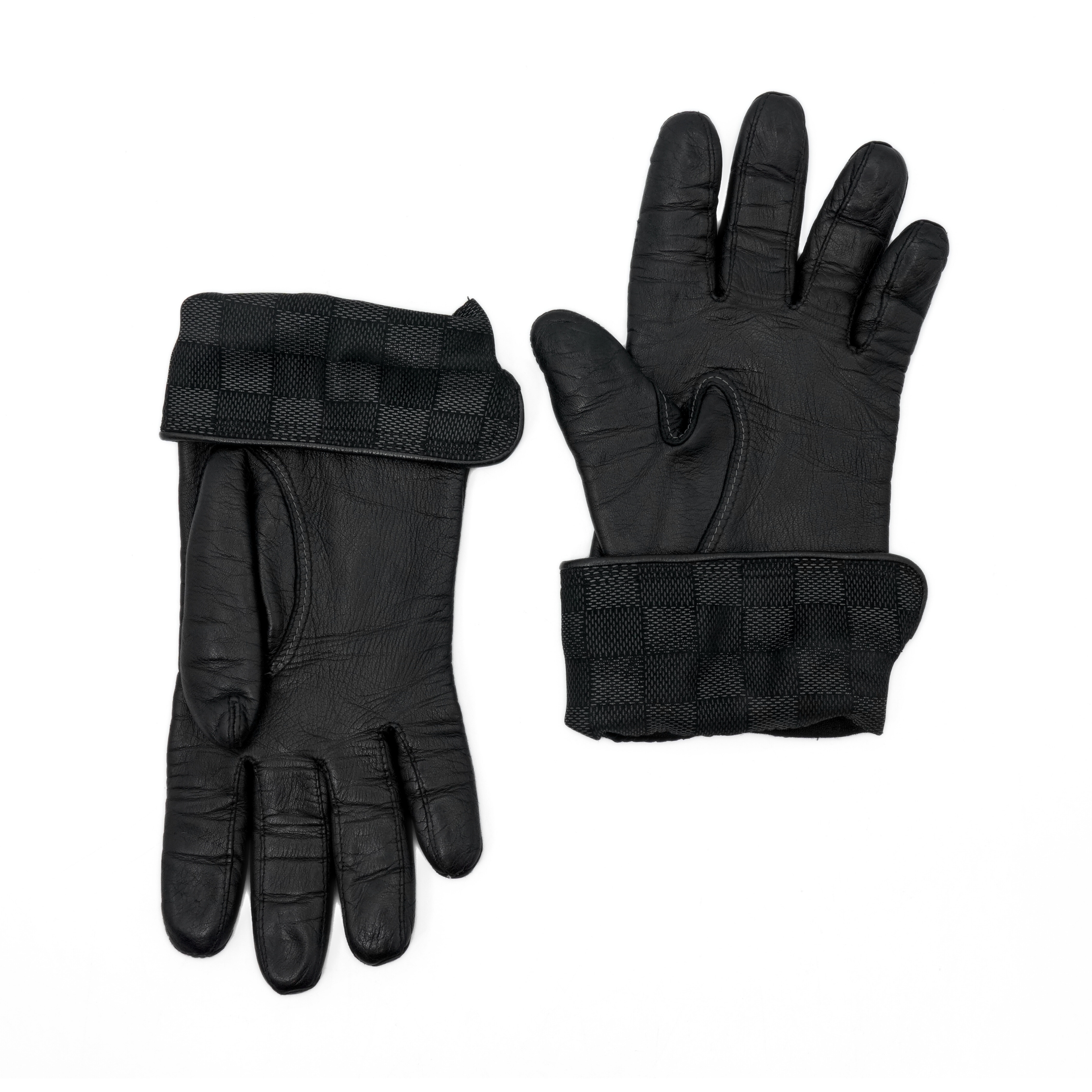 Louis Vuitton gloves in black leather with fold-over 'damier ebene' printed cuffs.