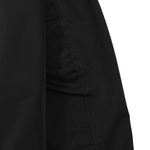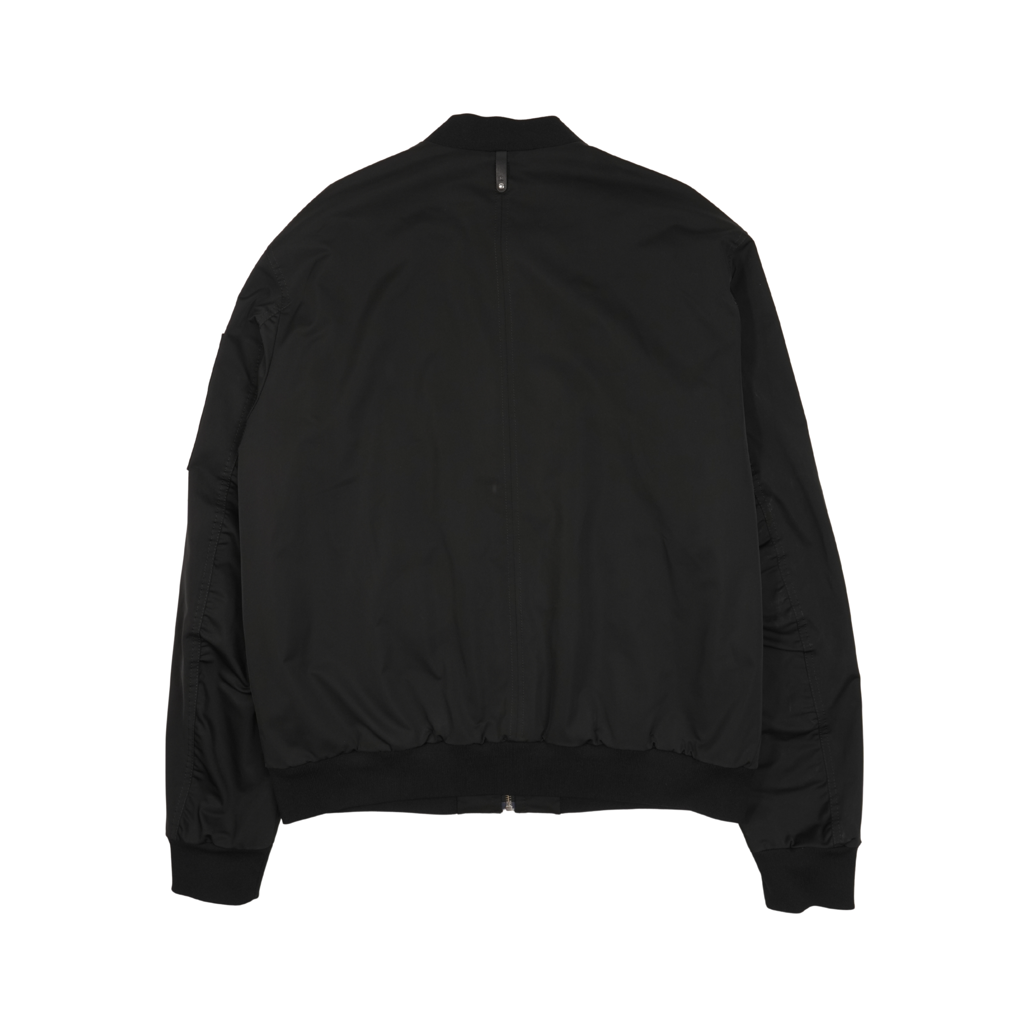 Mackage 'Ragnar R' black bomber jacket with front zip in silver hardware with leather trim, two zip and flap pockets on the front and arm pocket with rubber logo. Features ribbed collar and hem.