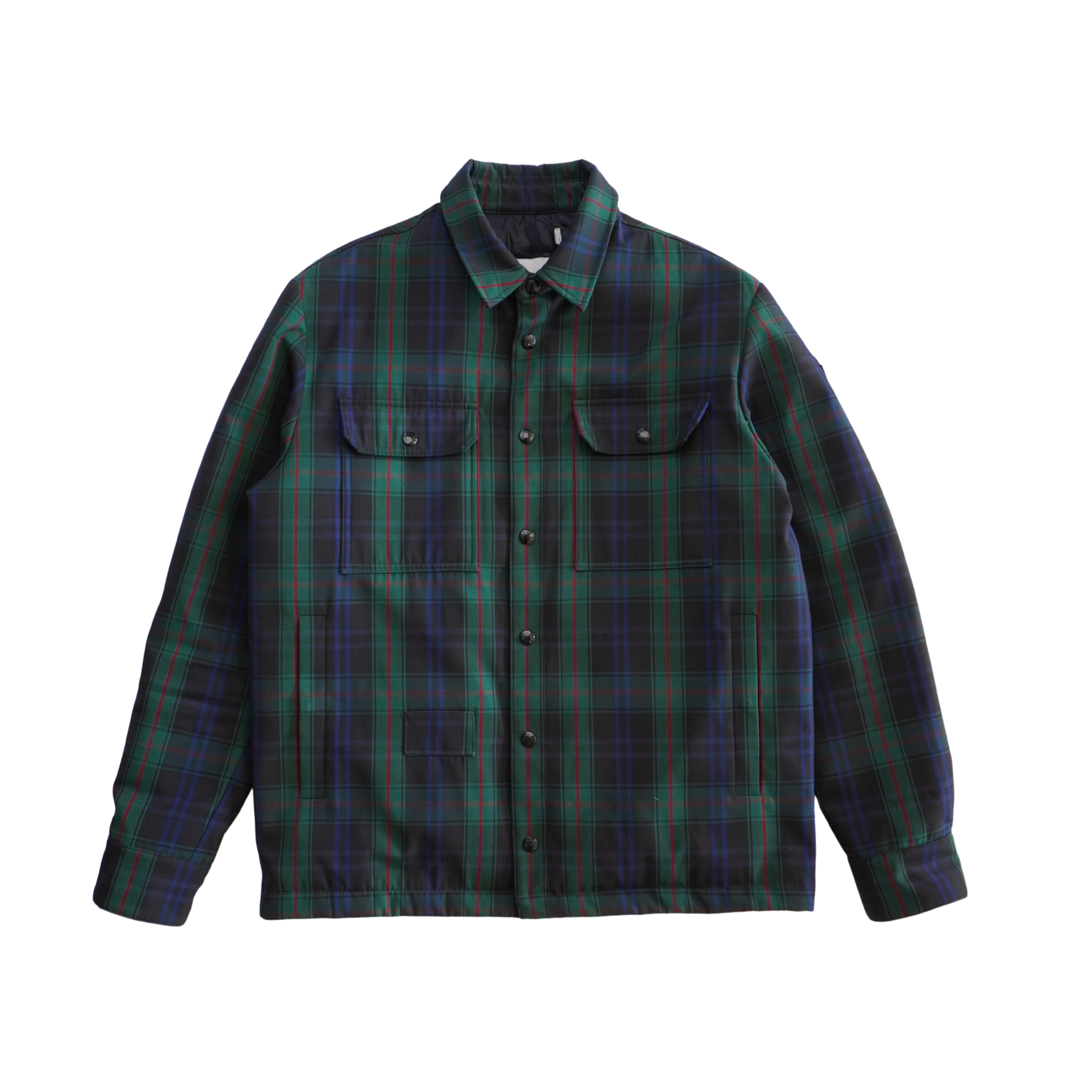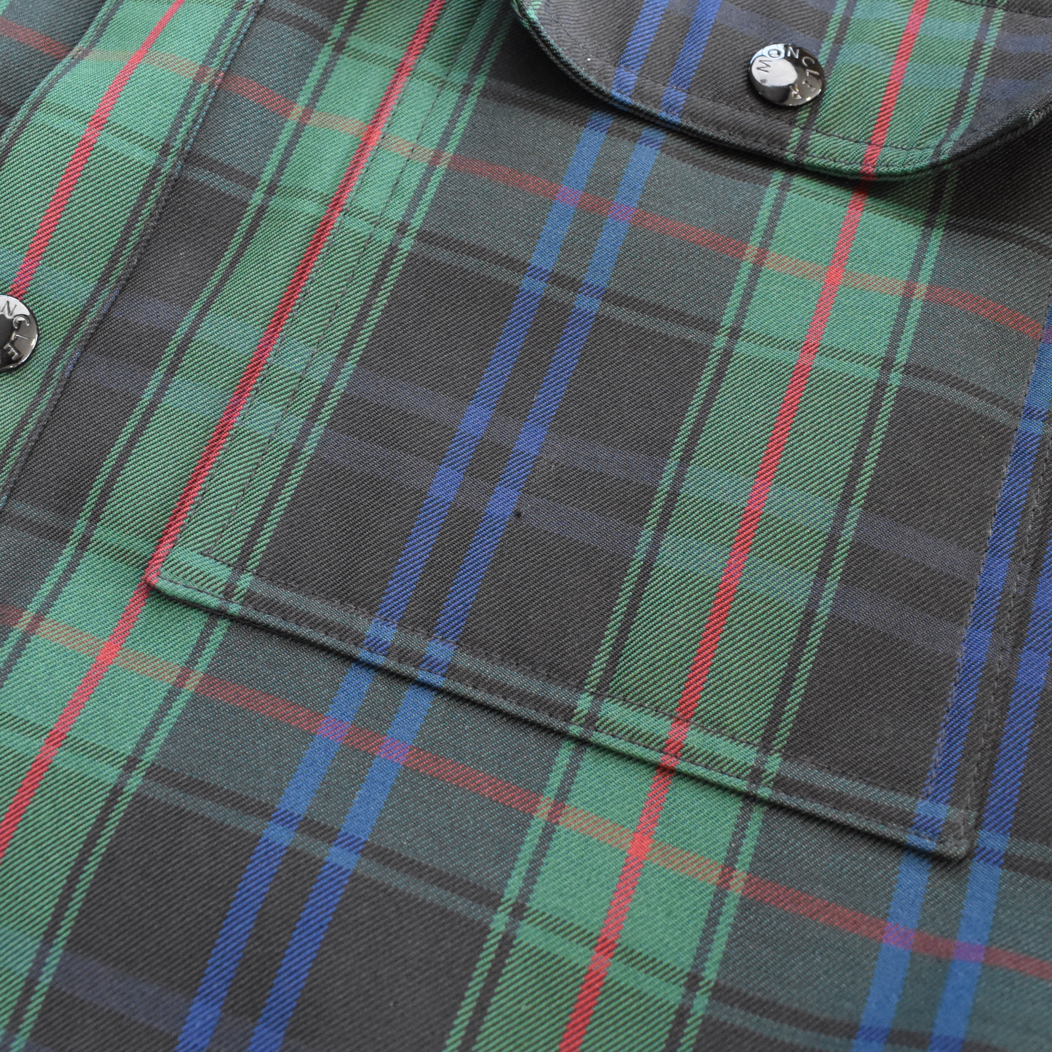Moncler 'Kosma Tartan' down filled shacket in dark green, navy, black, and red plaid with a small leather logo patch on the left sleeve. Features snap buttons down the front, flap pockets on the chest, and slit pockets at the hip.