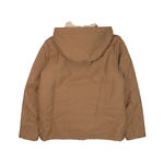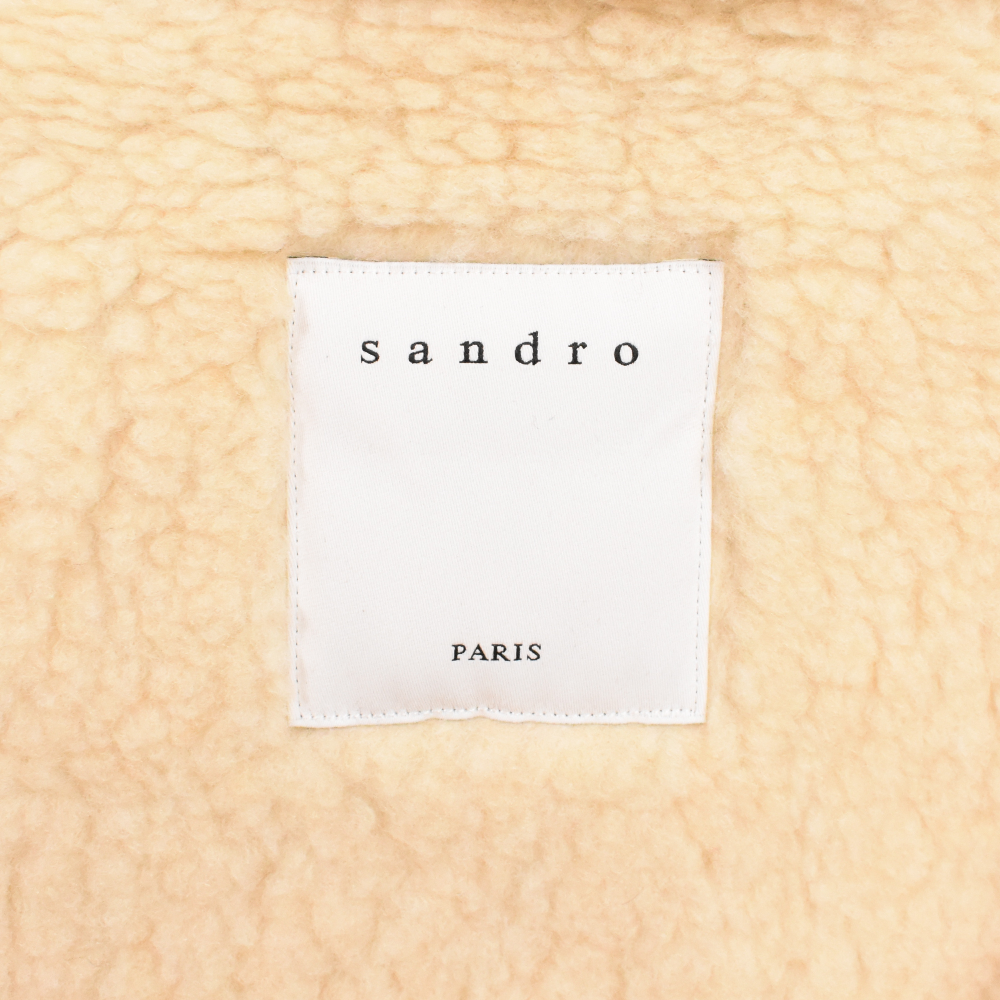 Sandro hooded tan canvas jacket with beige shearling lining, dual side slip pockets and zip and button closure in silver hardware.