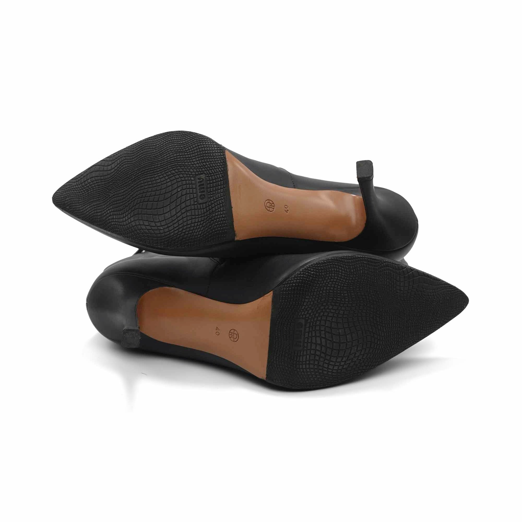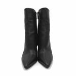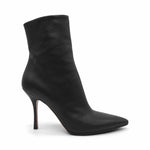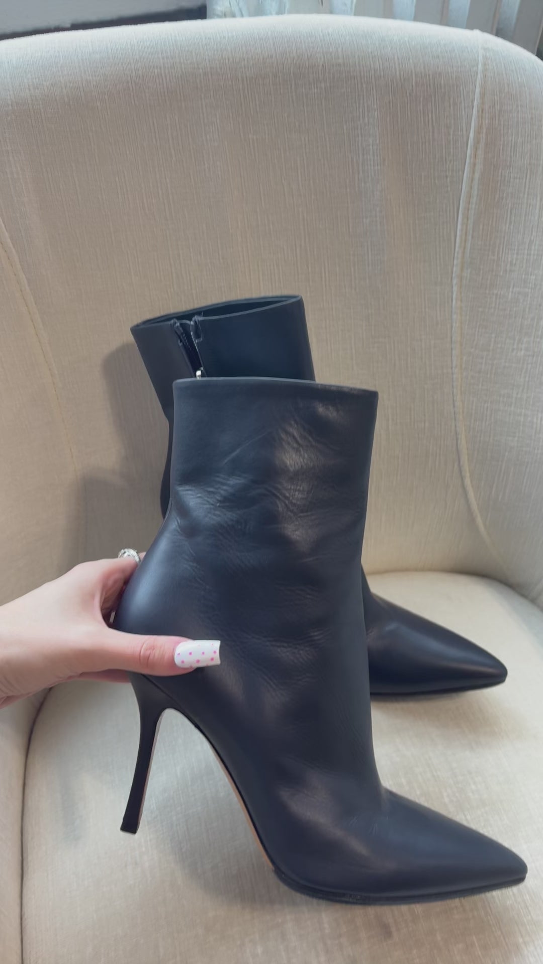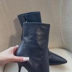 The Row heeled ankle boots in navy blue leather with a pointed toe and zipper closure.