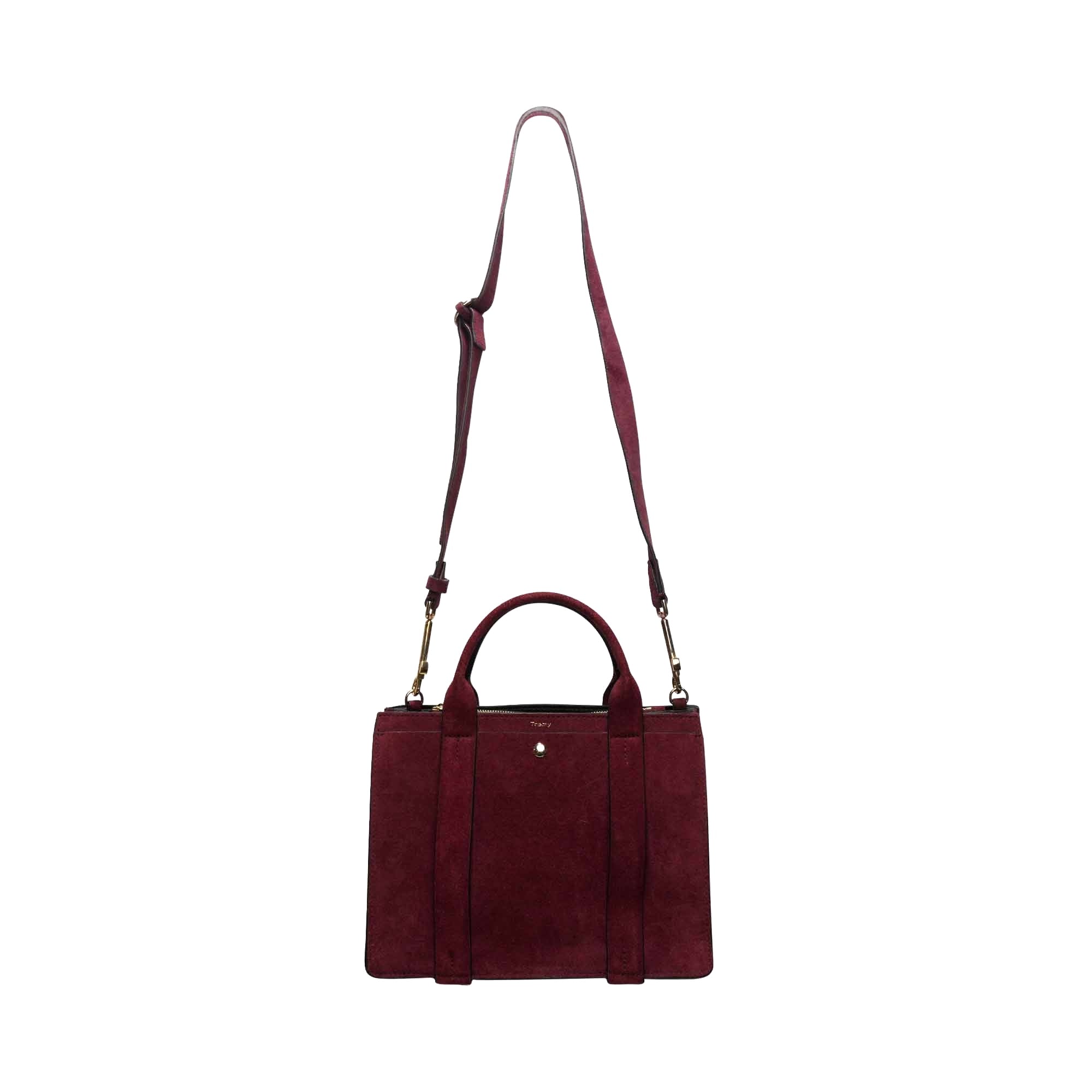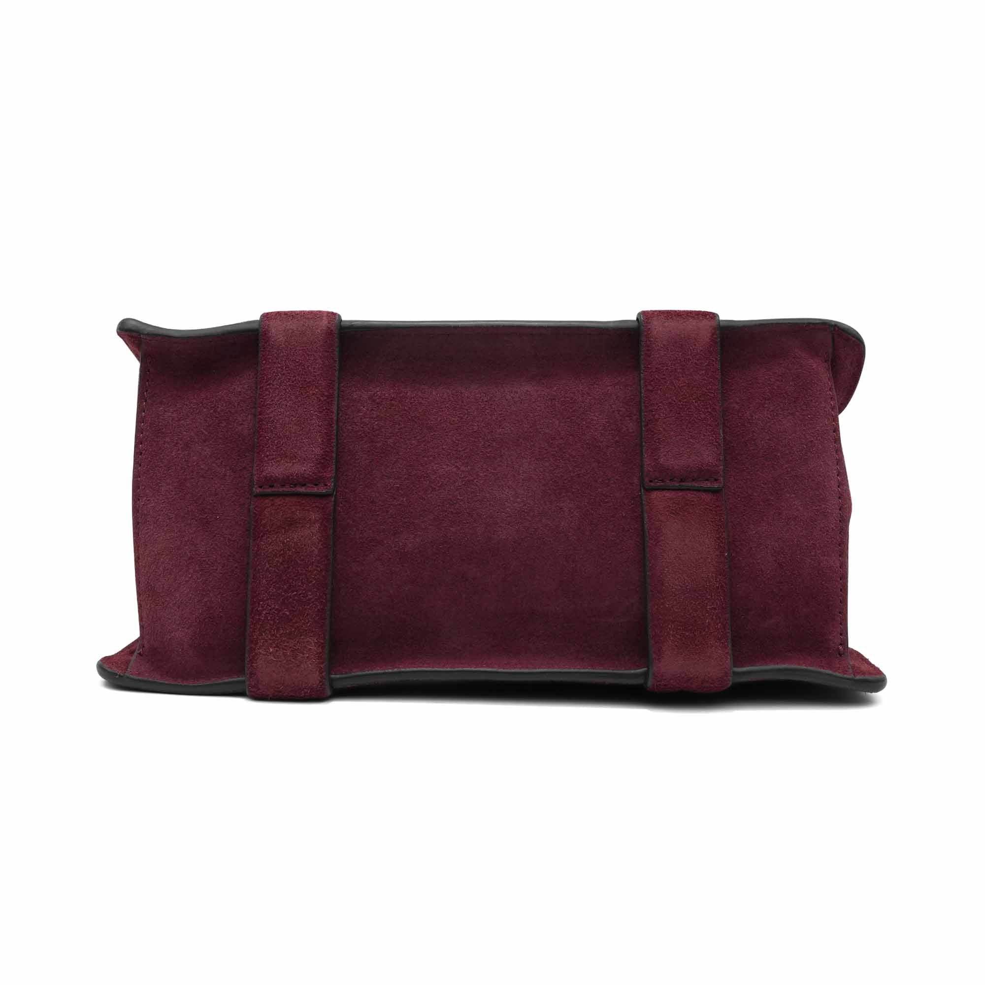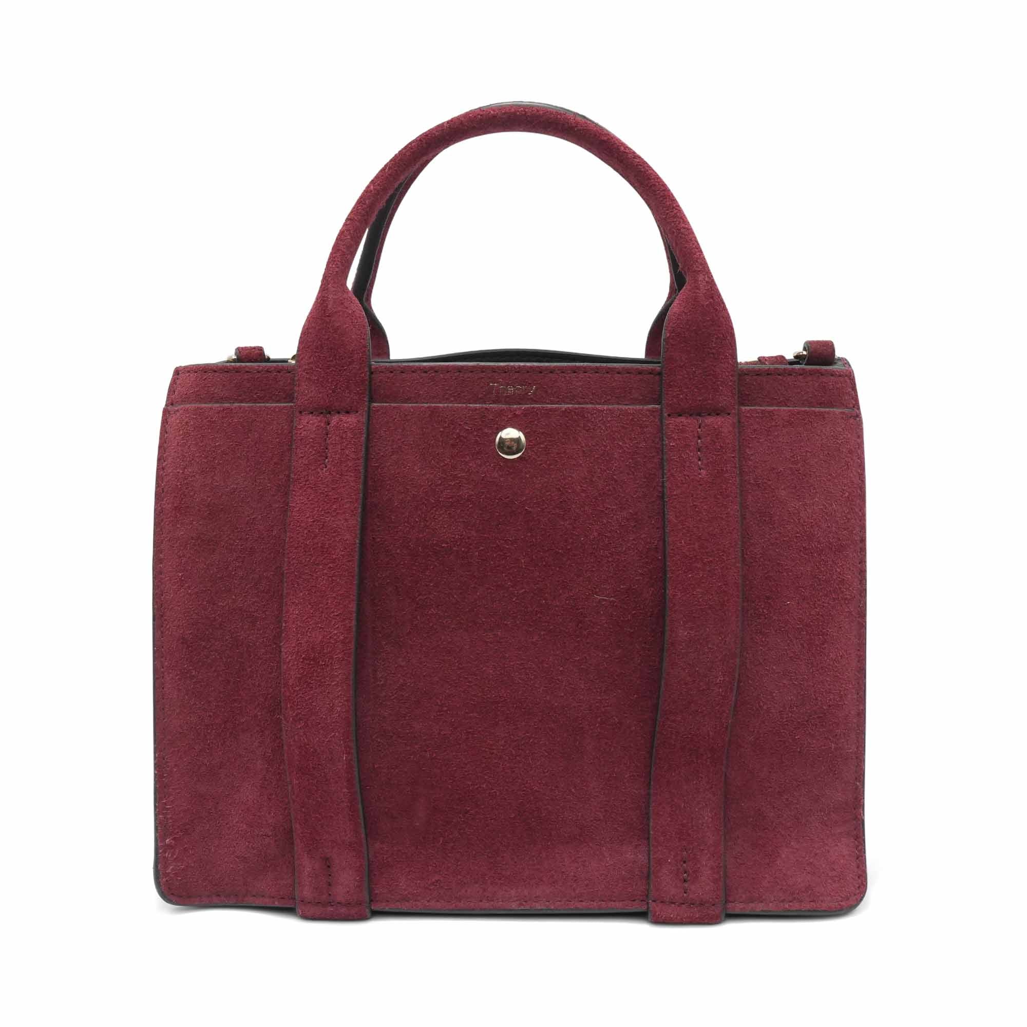 Theory 'West Mini Satchel' handbag in burgundy suede with detachable shearling crossbody strap. Features gold hardware, four compartments with snap and zipper closures, and an alternative suede crossbody strap.