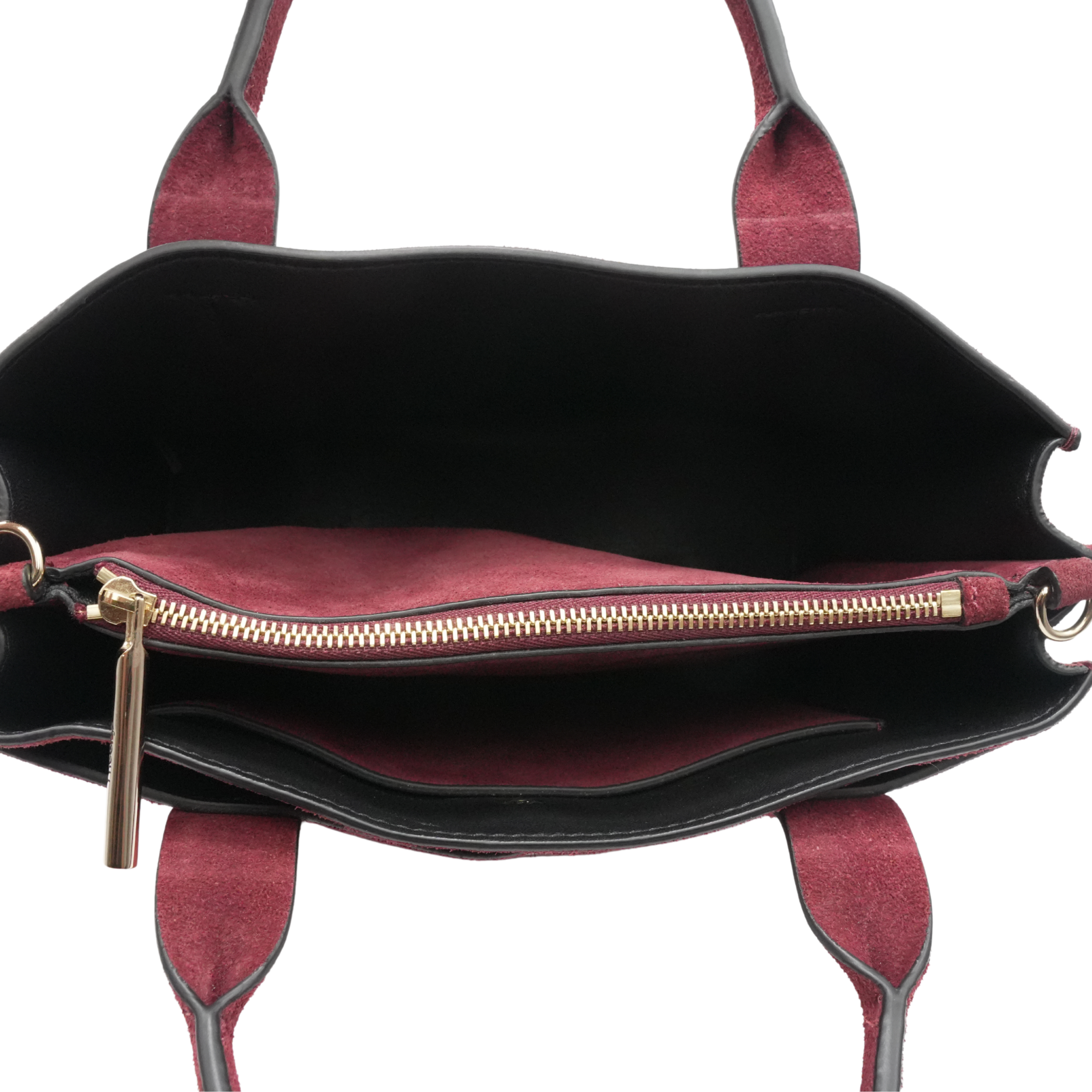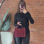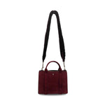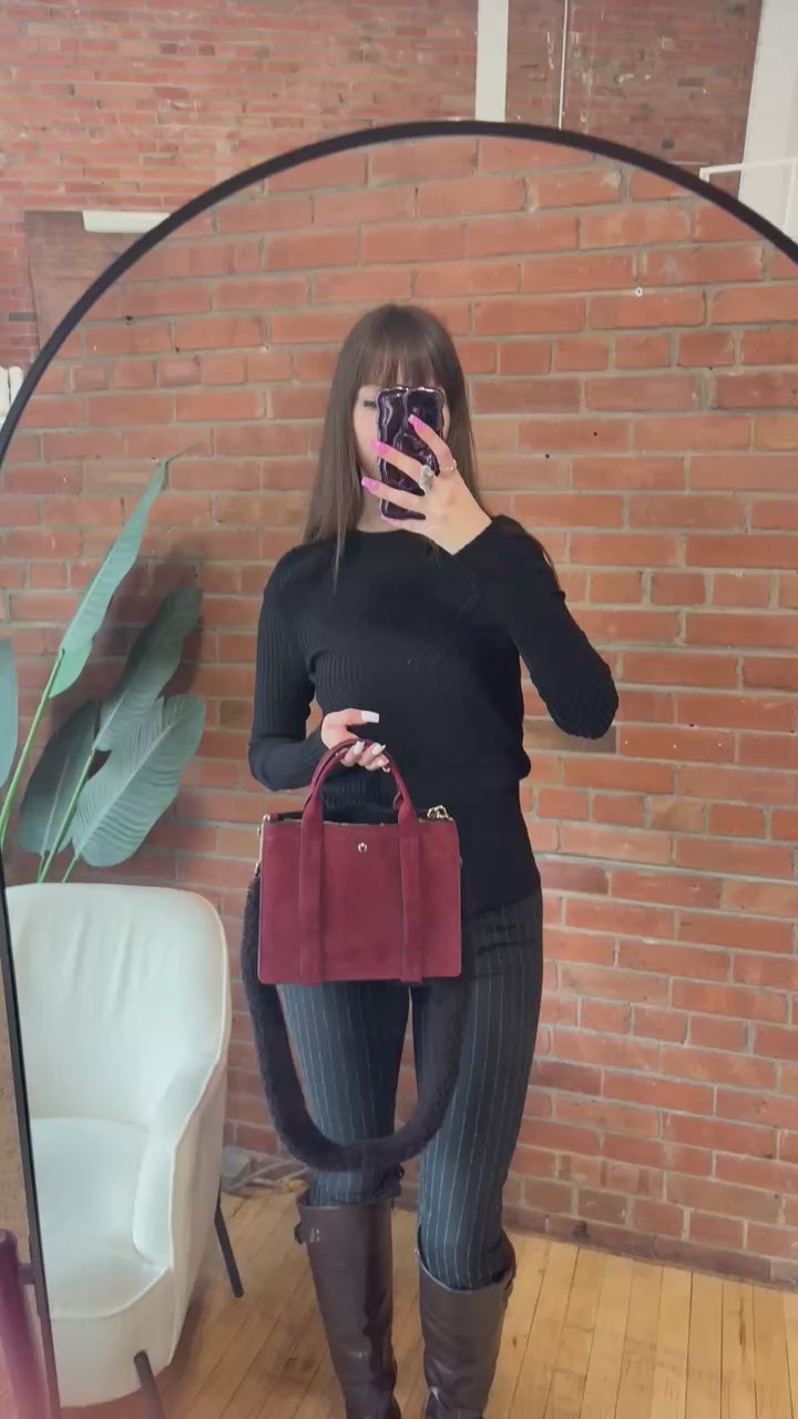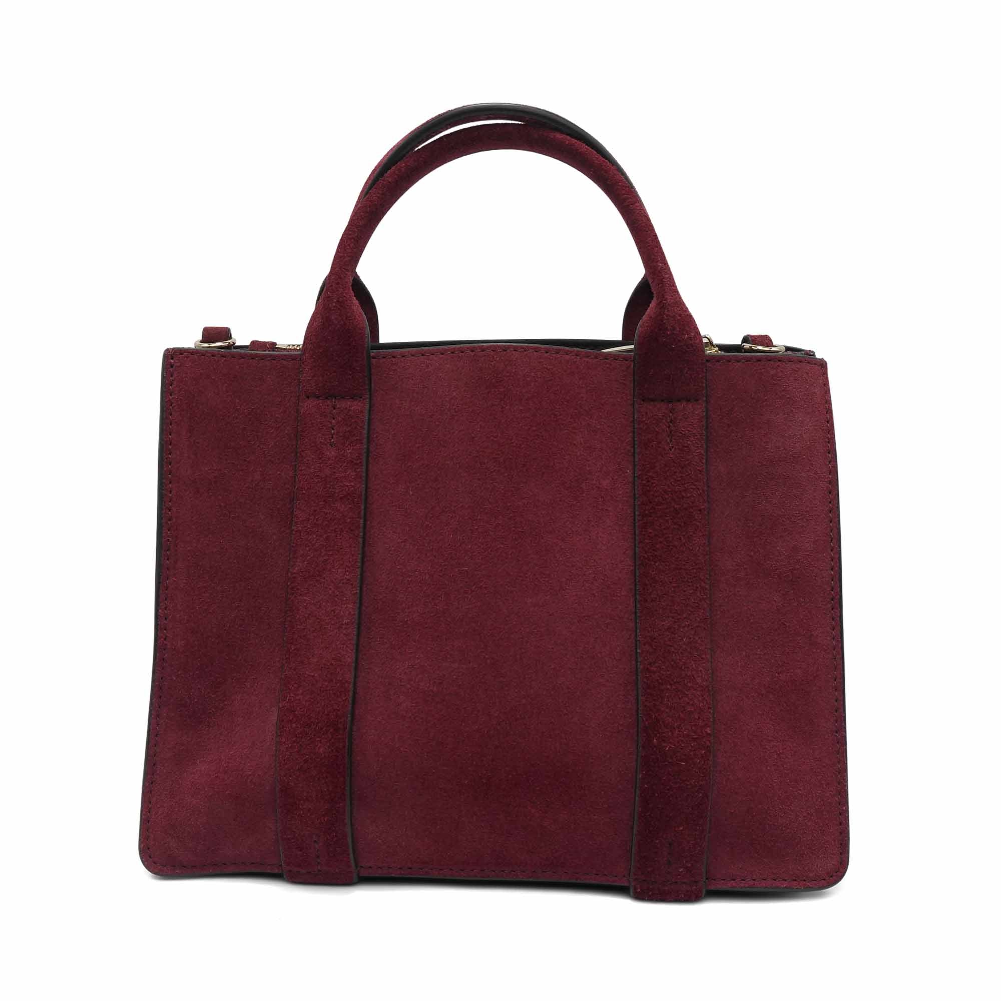 Theory 'West Mini Satchel' handbag in burgundy suede with detachable shearling crossbody strap. Features gold hardware, four compartments with snap and zipper closures, and an alternative suede crossbody strap.