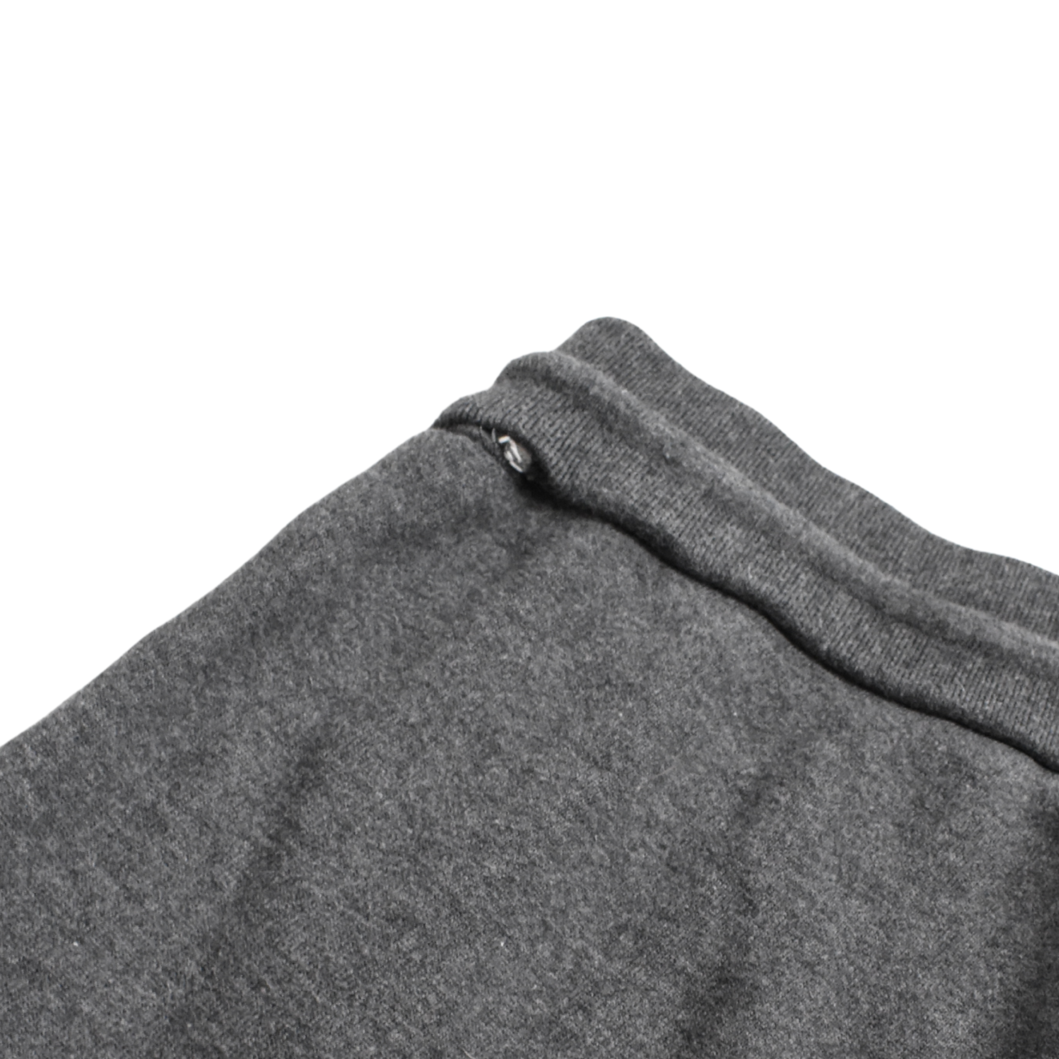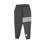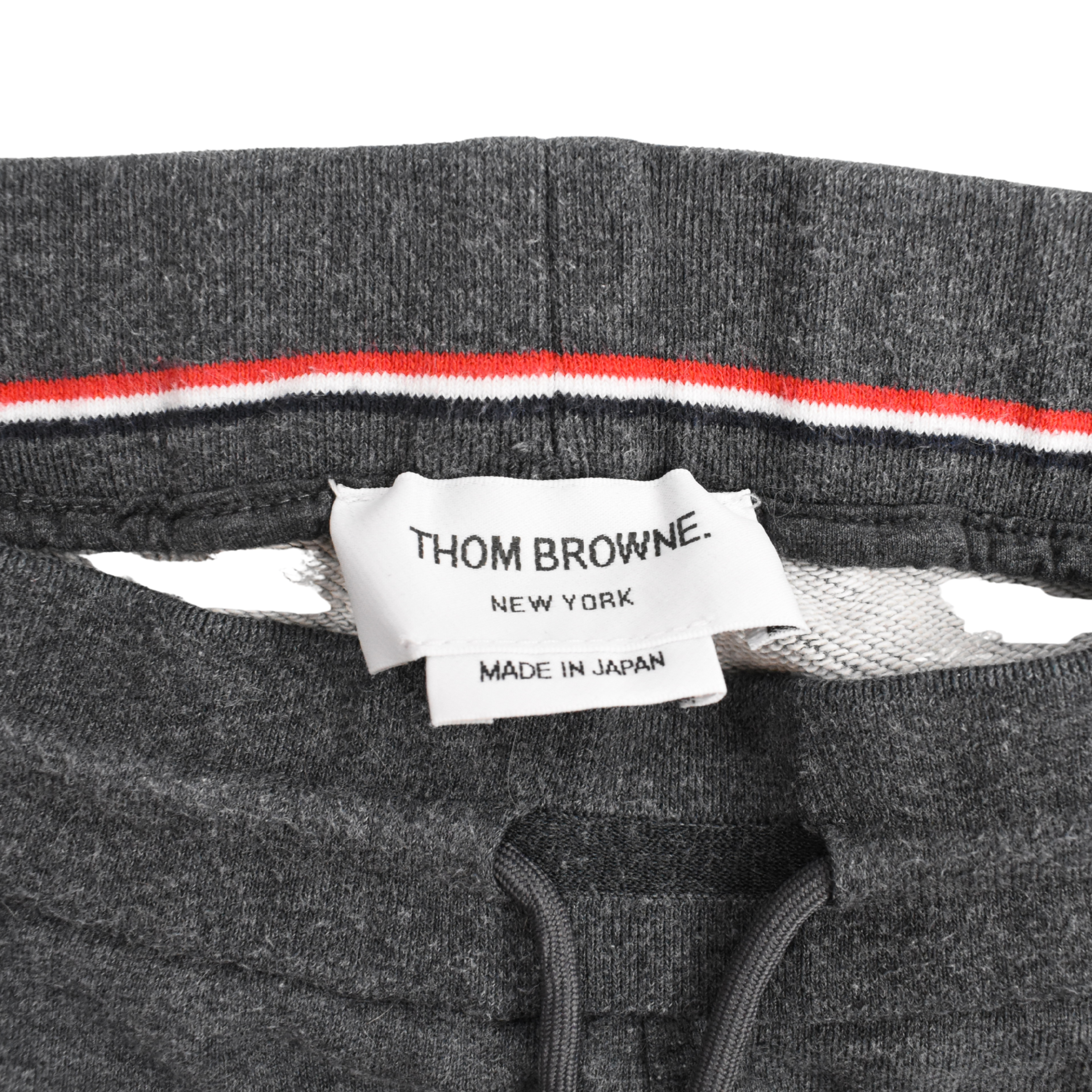 Thom Browne jogger sweatpants in a grey cotton with white stripes around the thigh, a small logo patch at the cuff, and an elastic drawstring waistband.