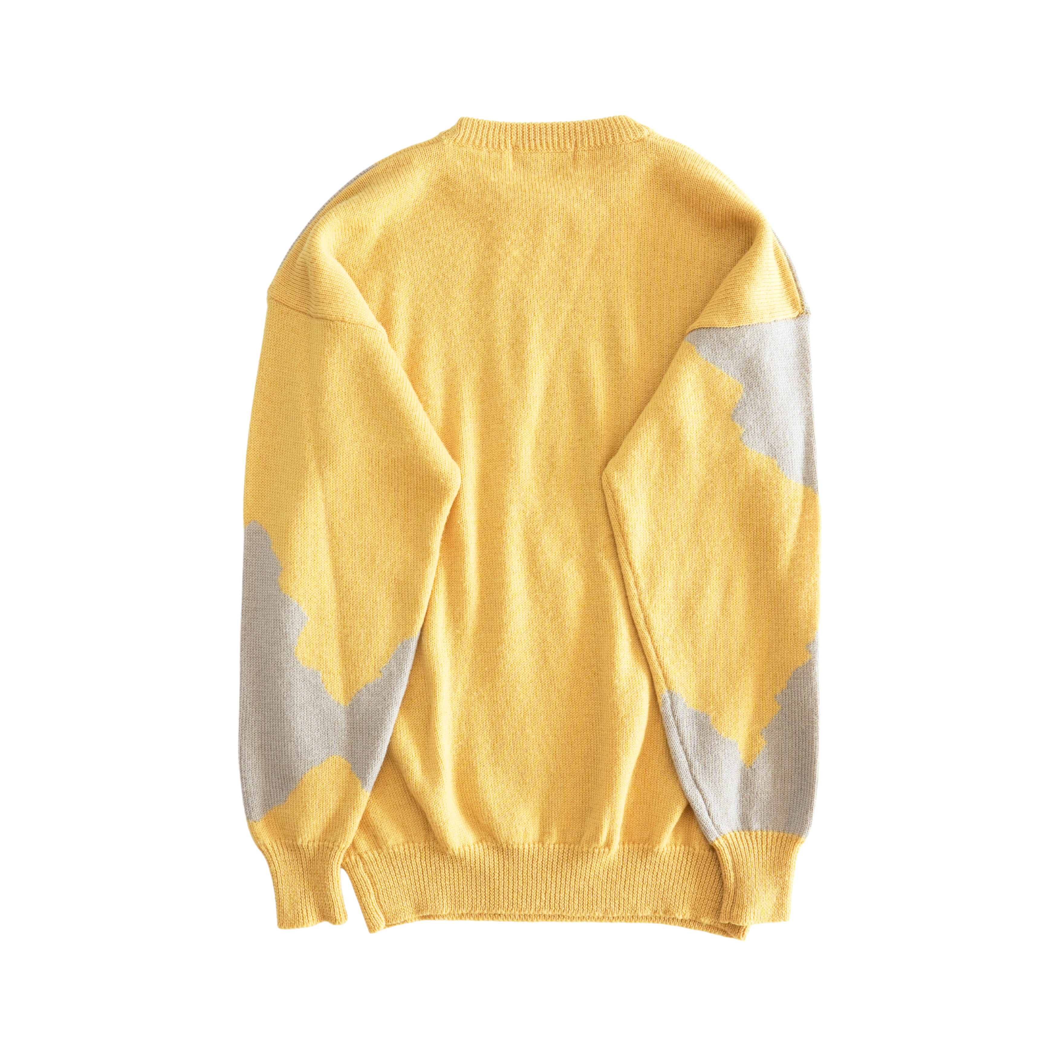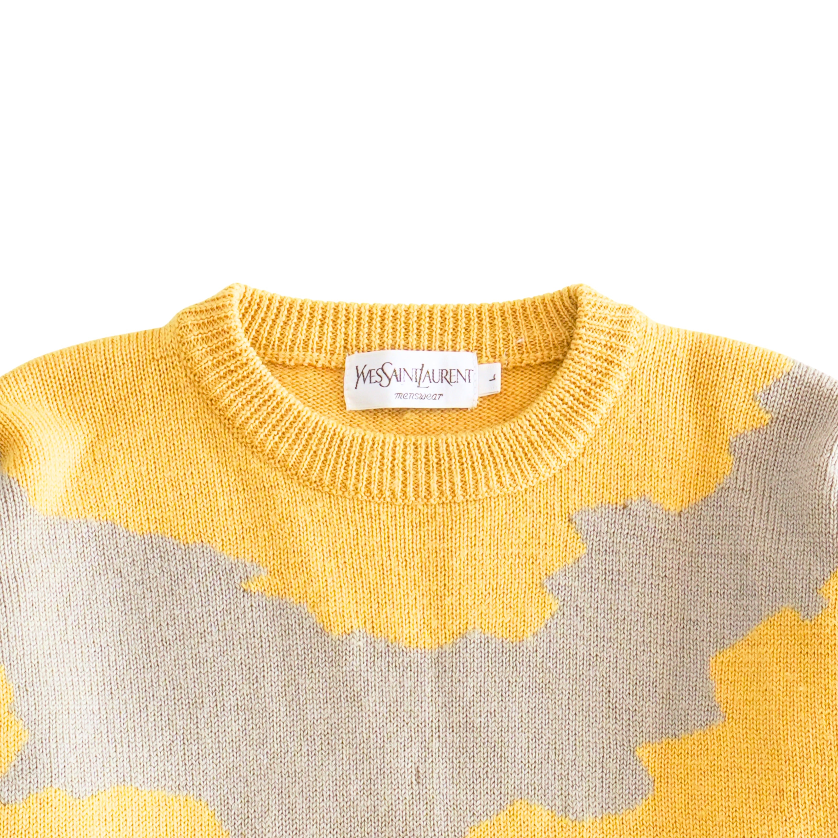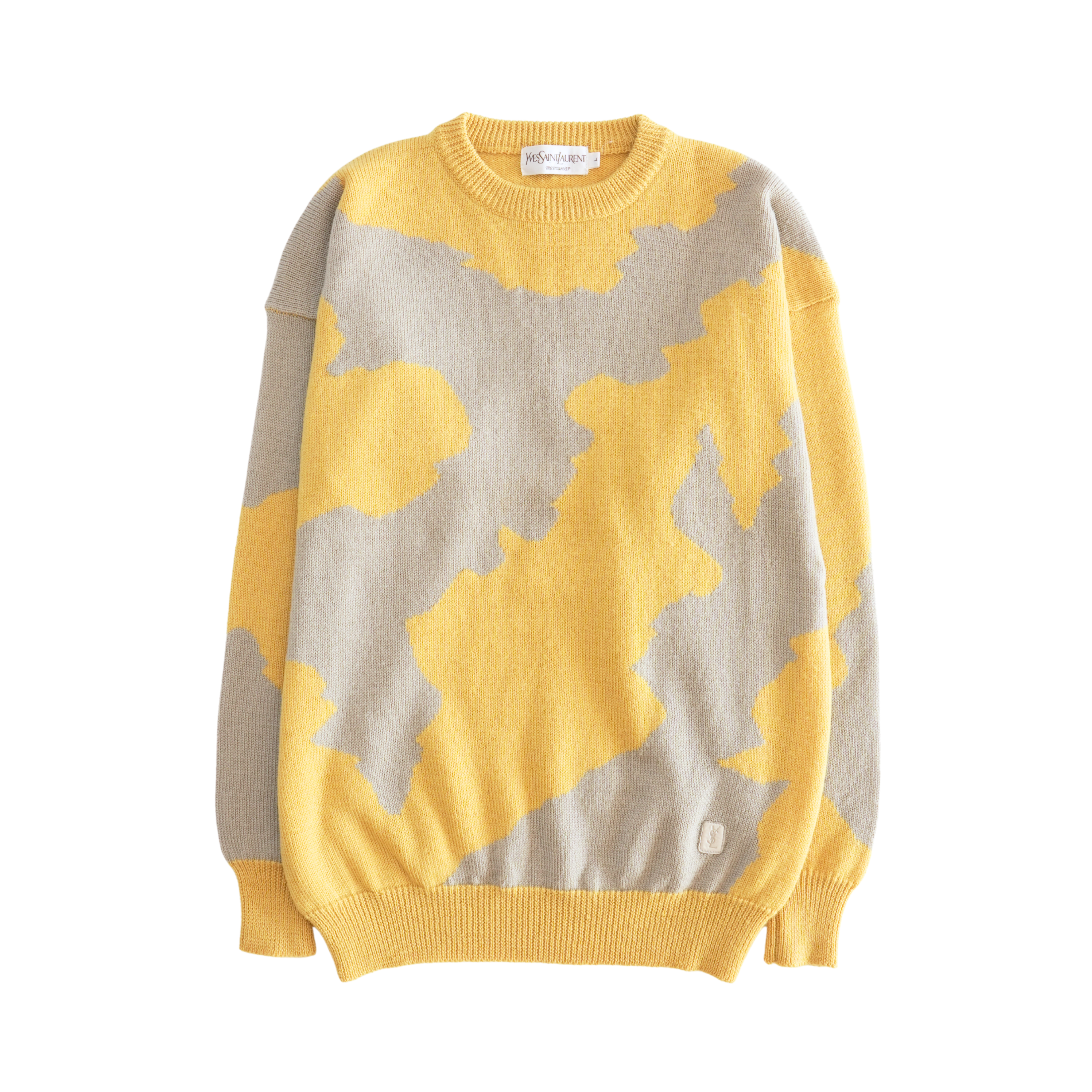 Yves Saint Laurent vintage sweater in yellow and grey knit wool with an abstract pattern throughout, a small grey leather logo patch at the waist, and a ribbed knit trim.