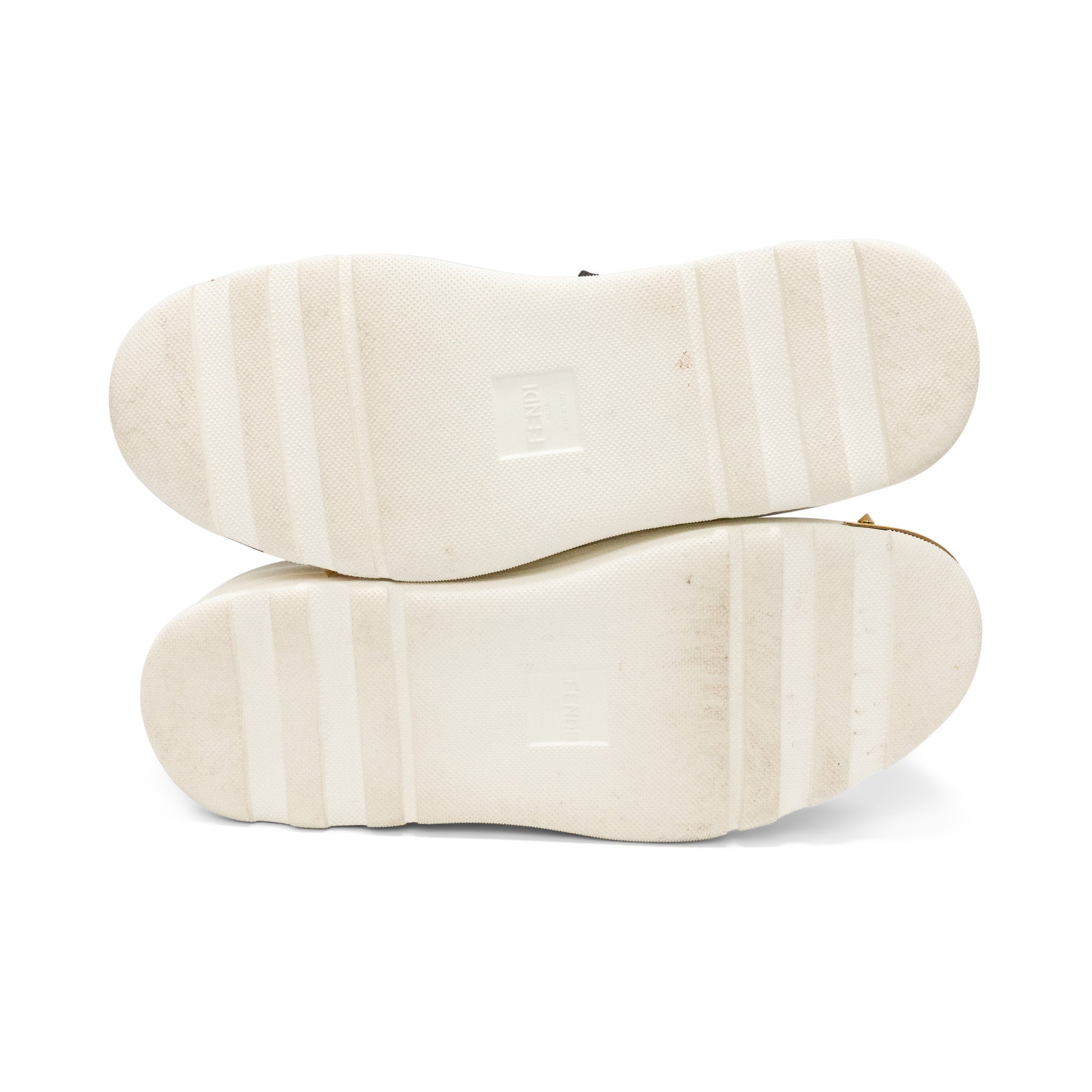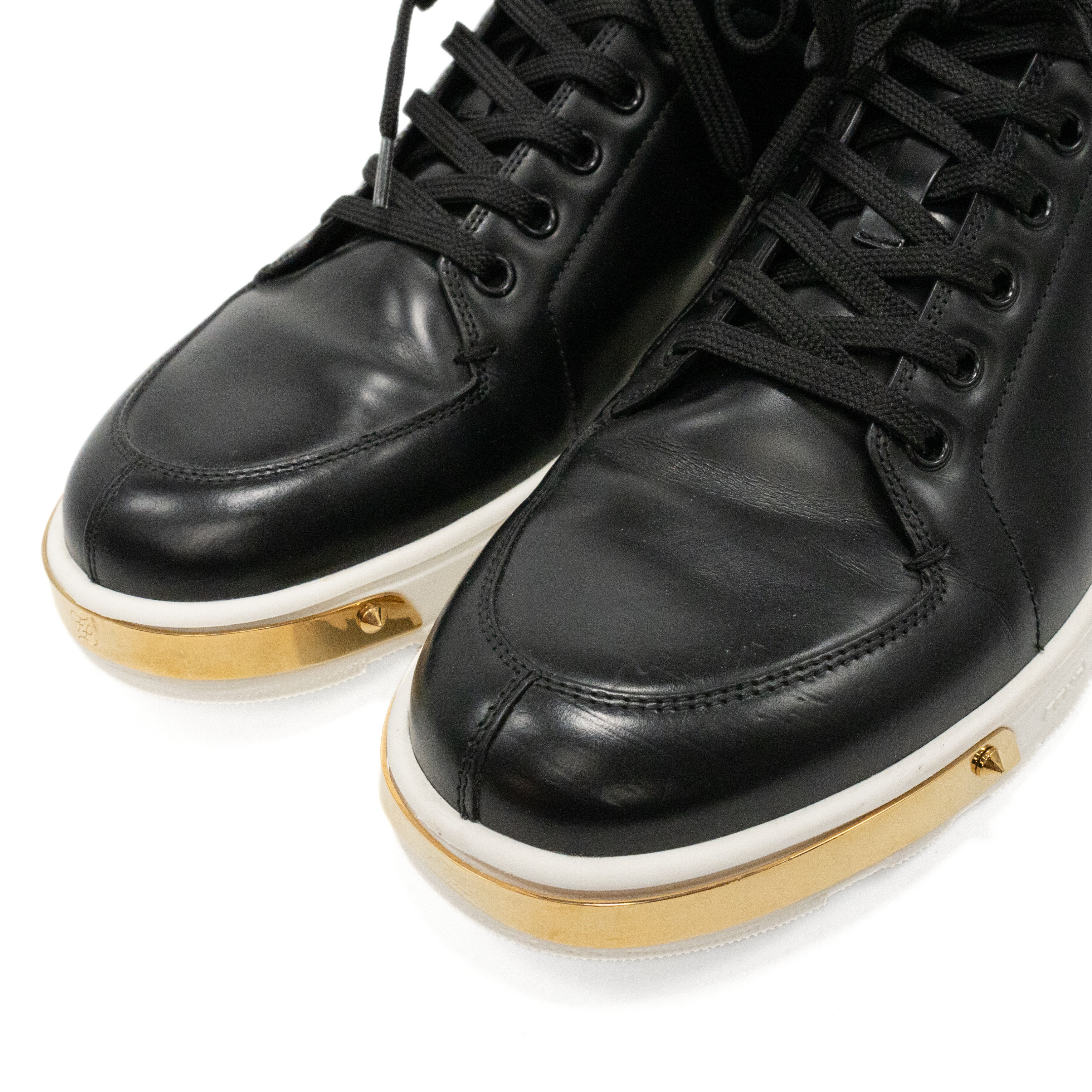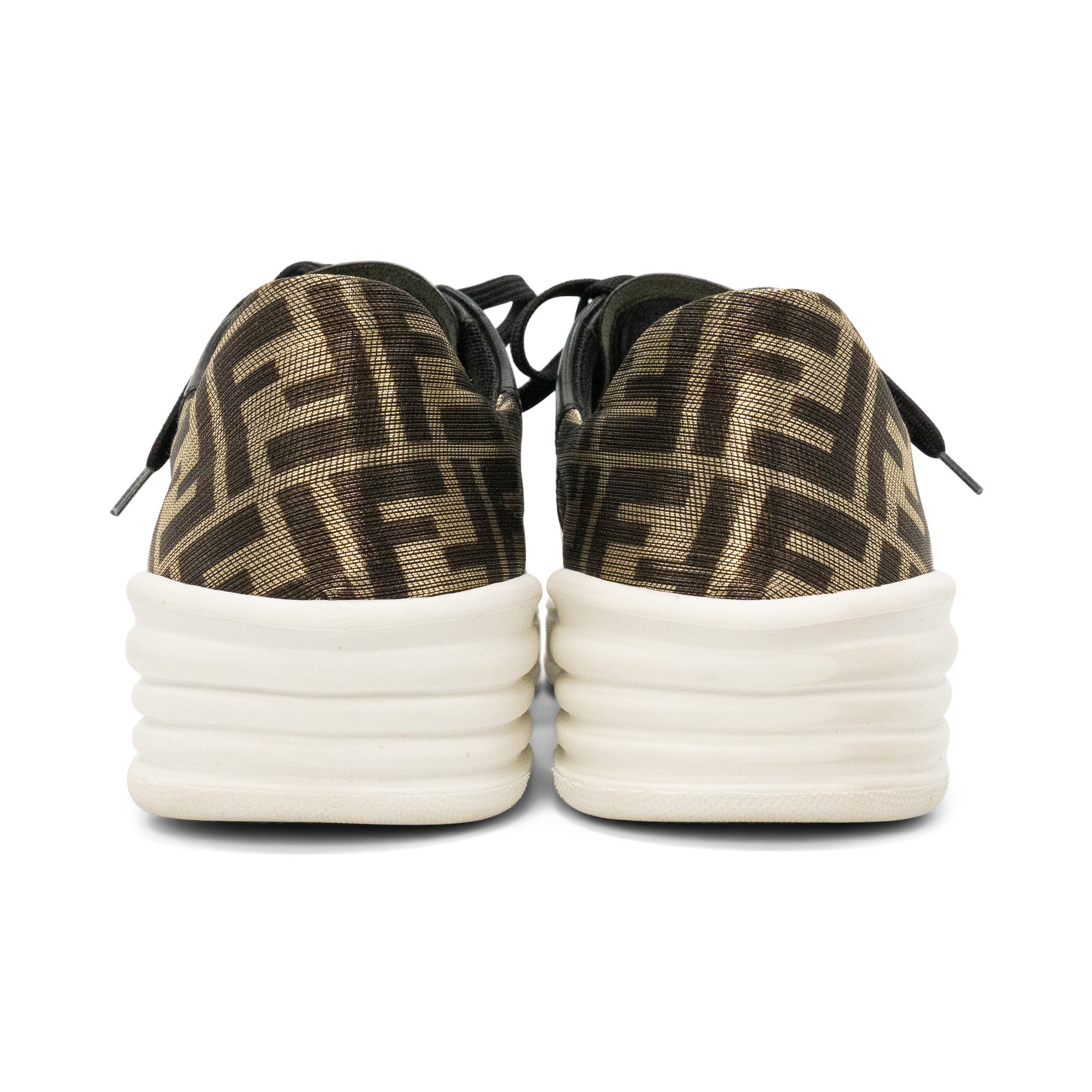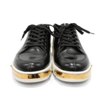Fendi low top sneakers in black leather with gold monogram heel and a gold metal lip around the toe. Features a thick white sole, little gold spikes on the toe, and black laces.