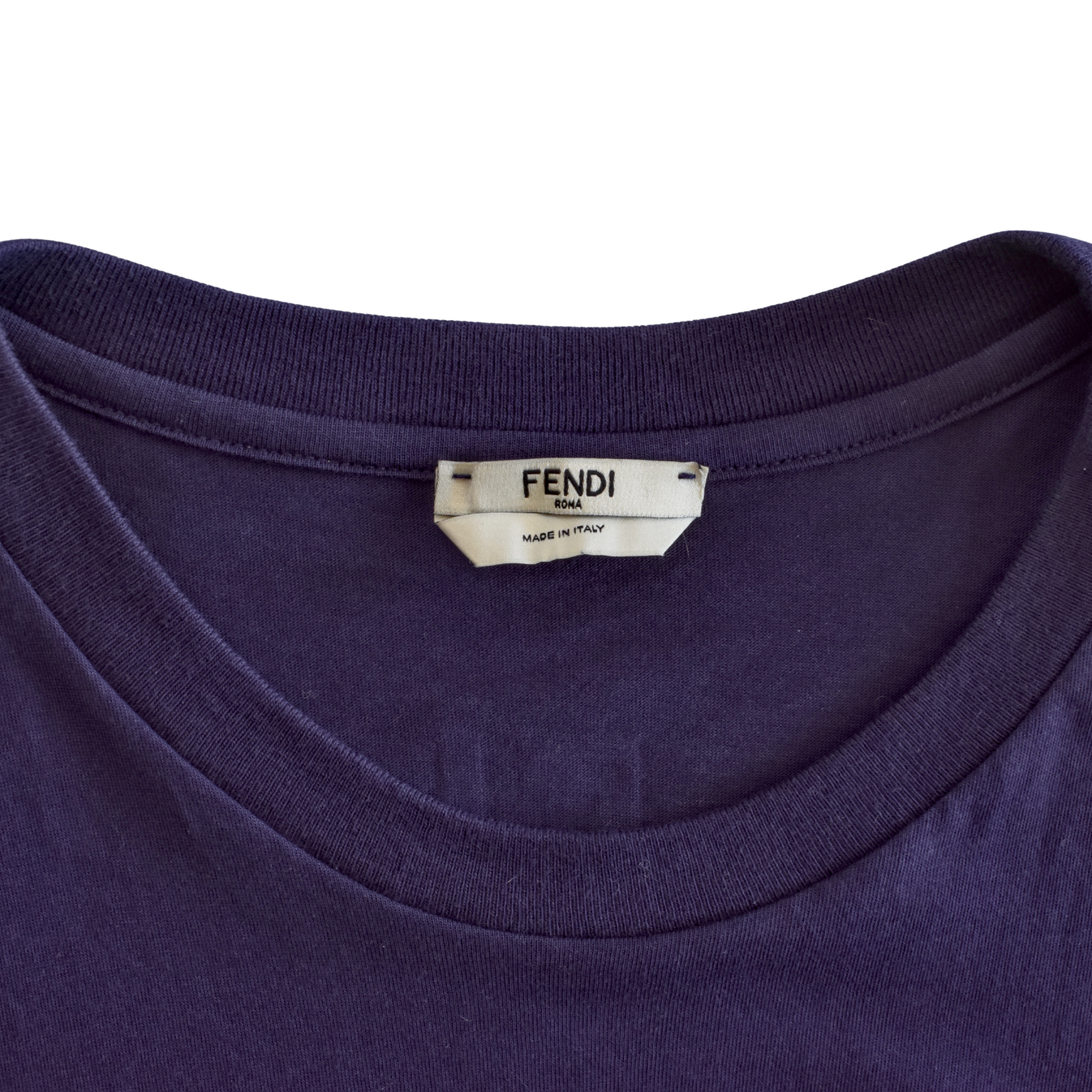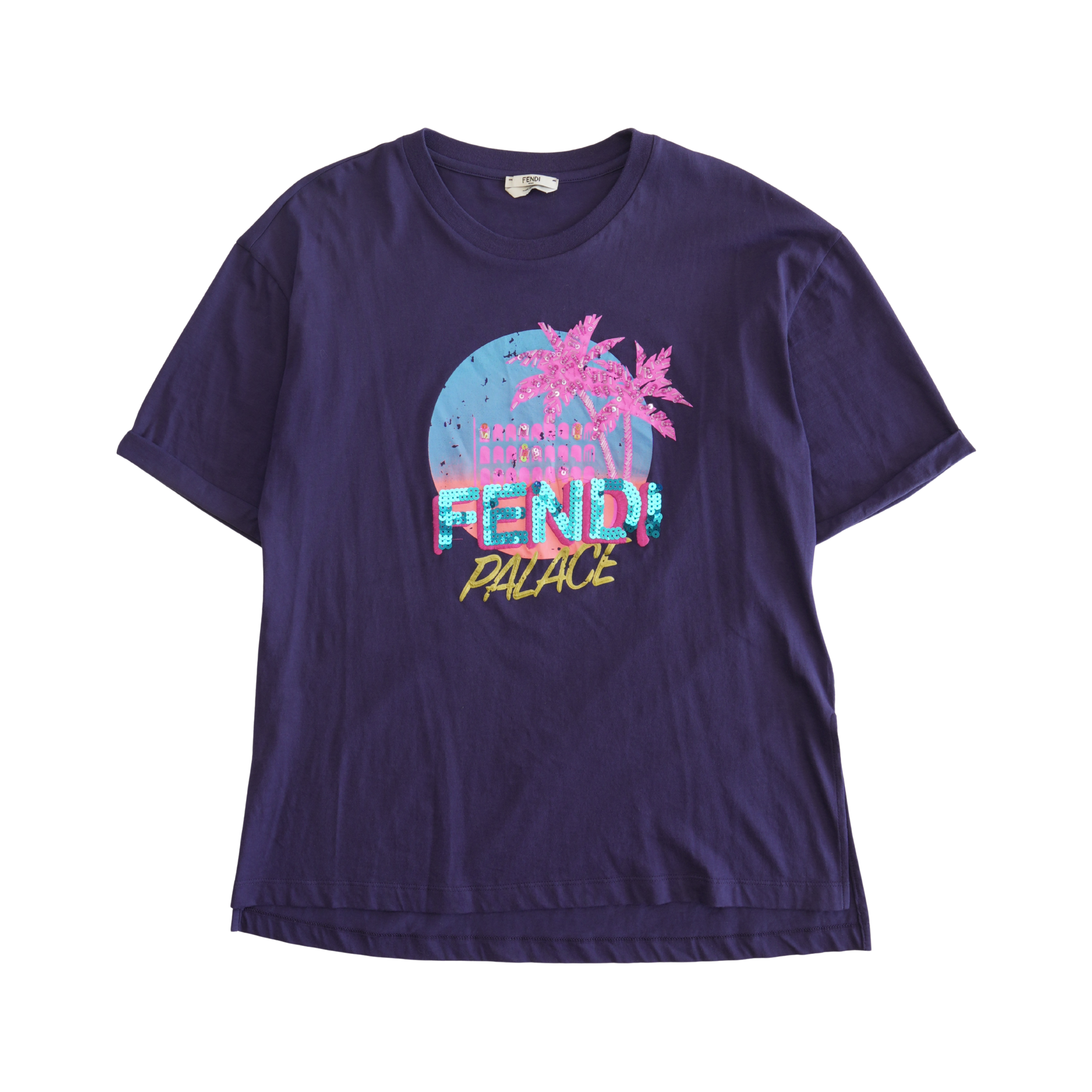 Fendi 'Palace' t-shirt in navy cotton with a large sequinned multicolour logo and palm tree graphic at the chest.