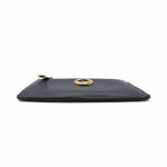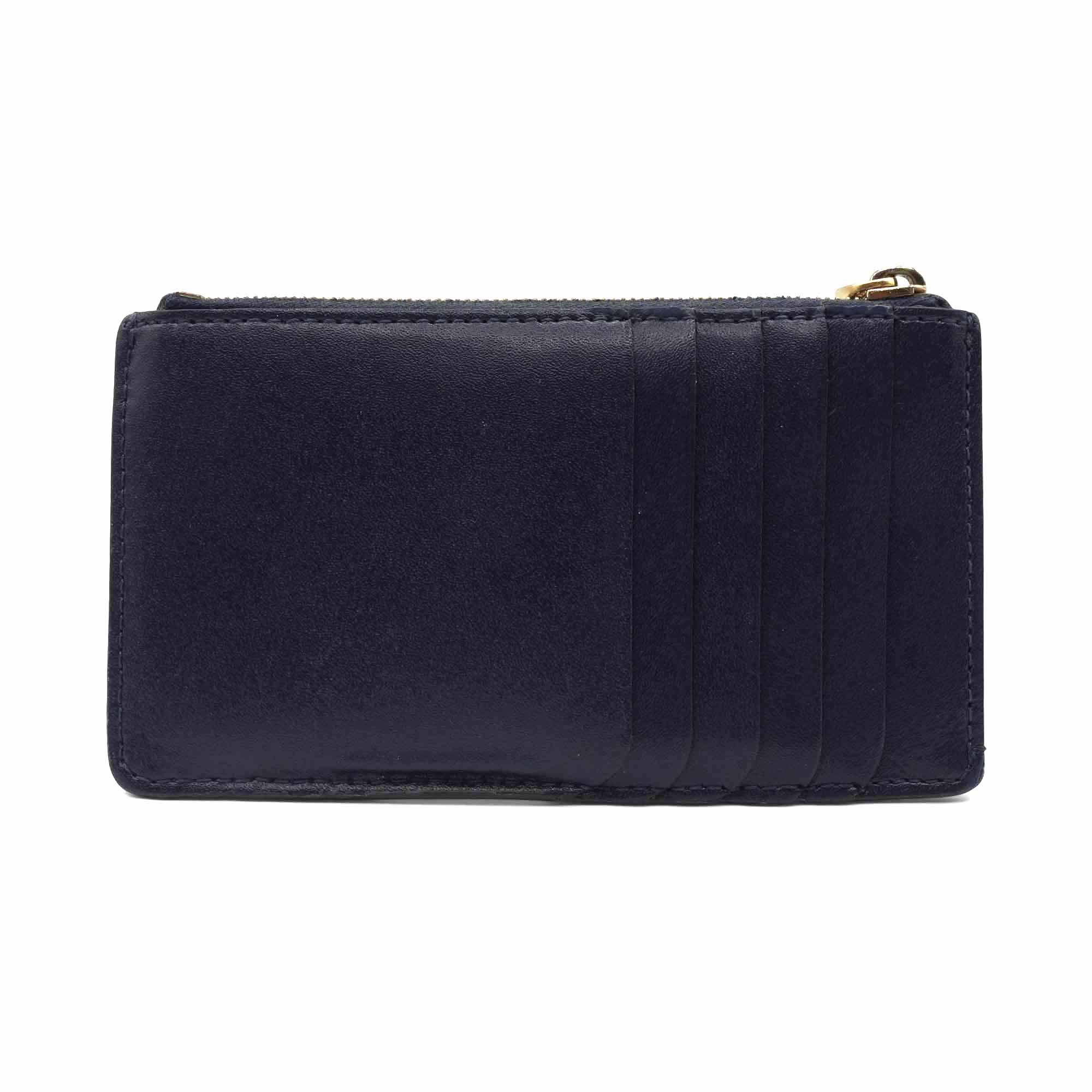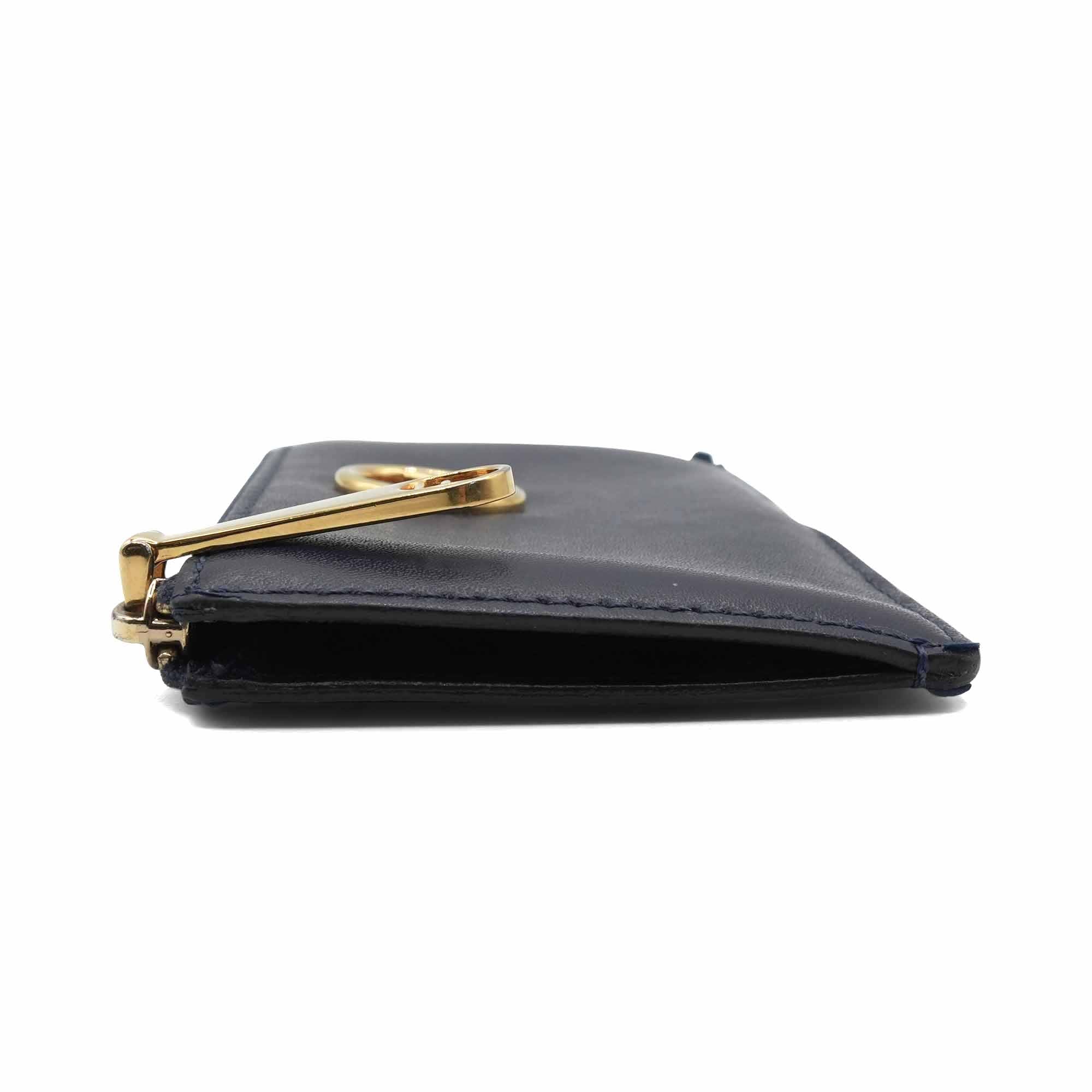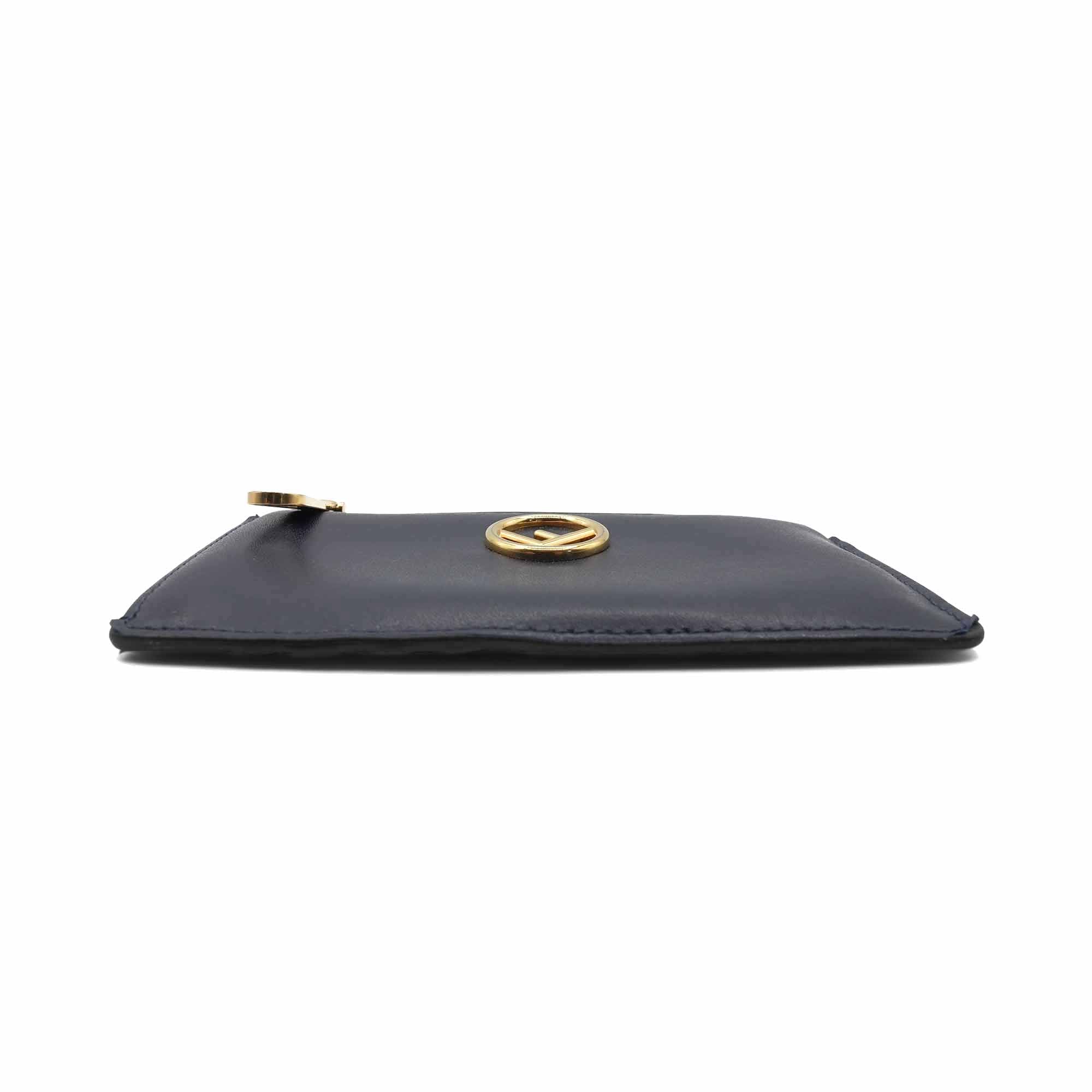 Fendi zip card case in navy leather with gold logo emblem, zip coin pouch and five card slots.
