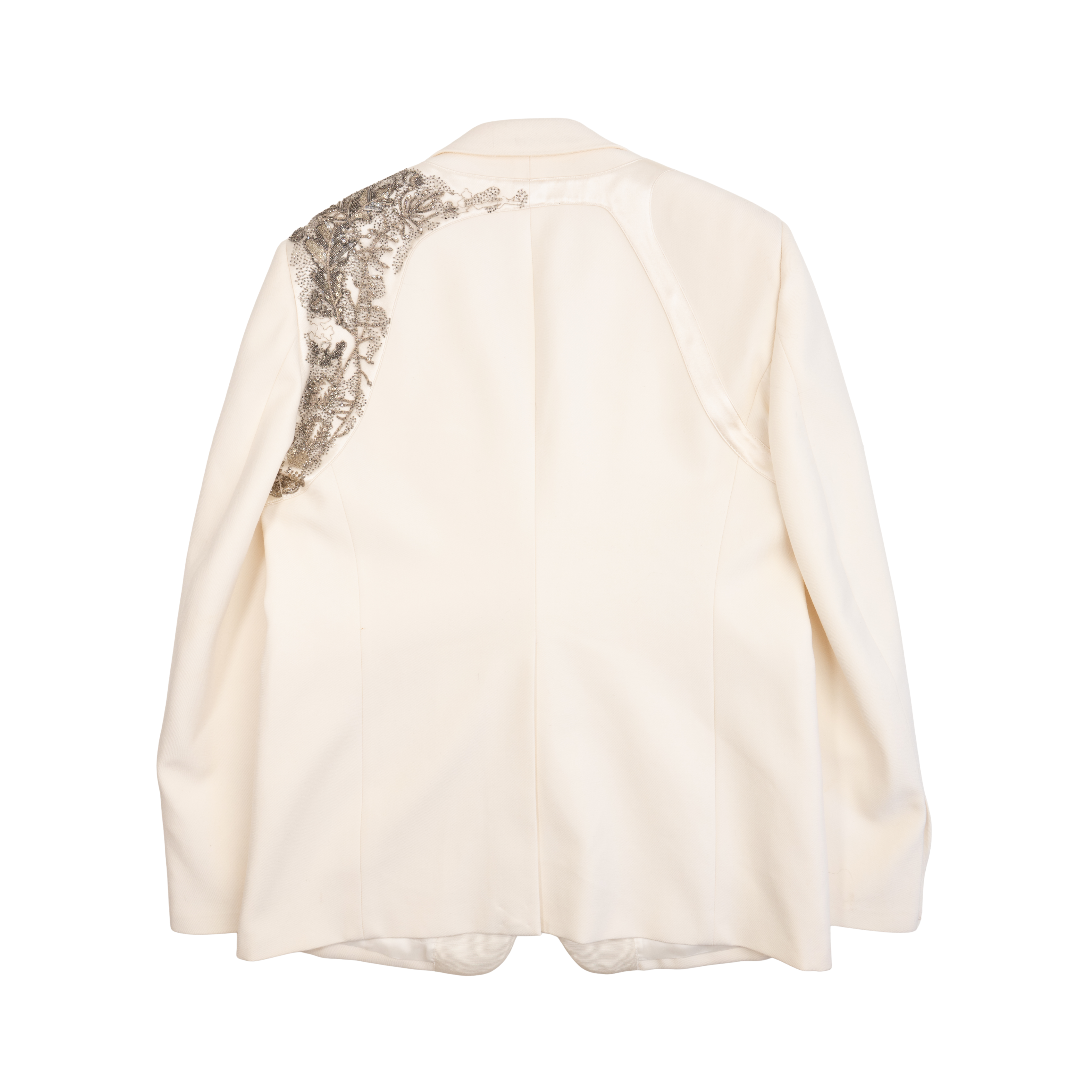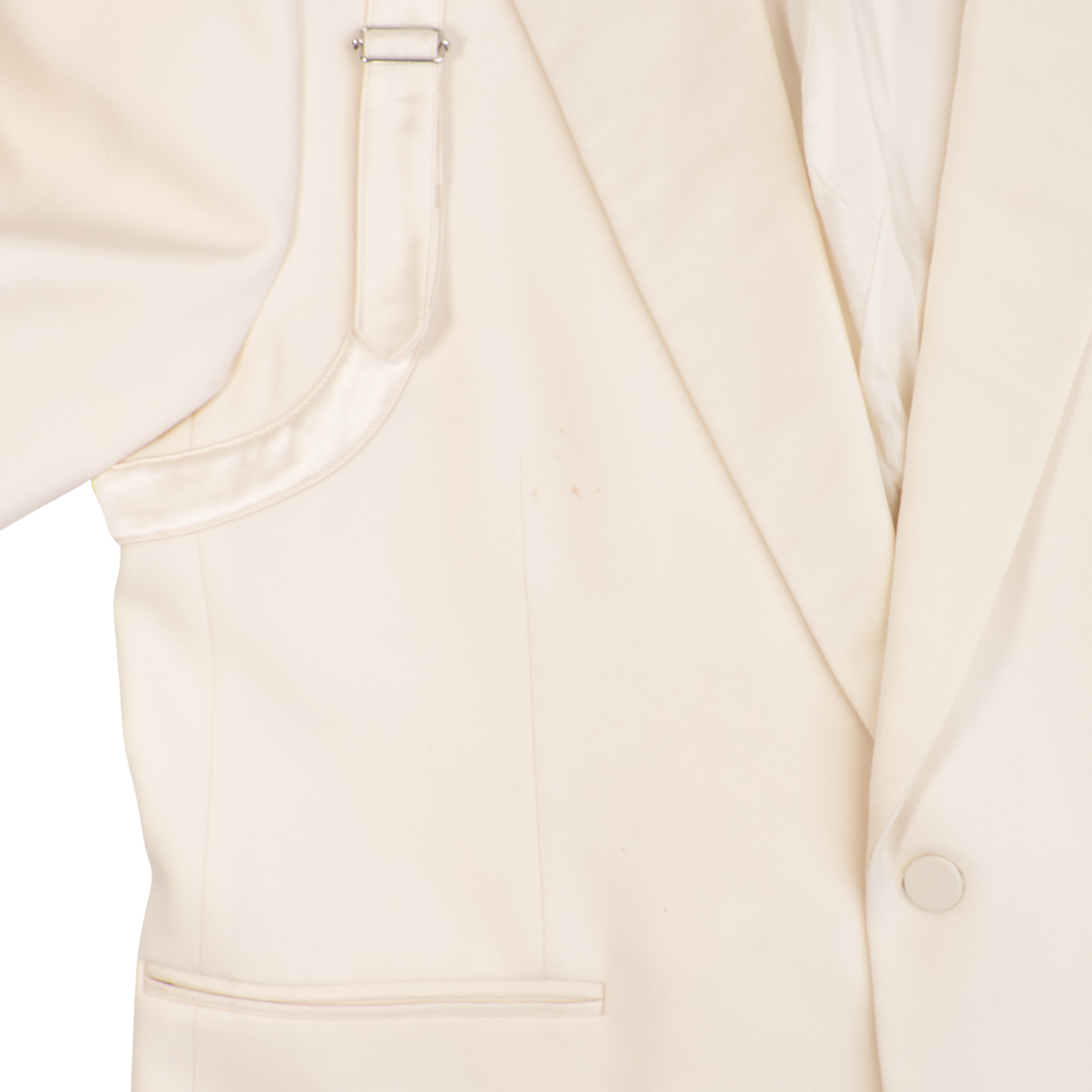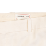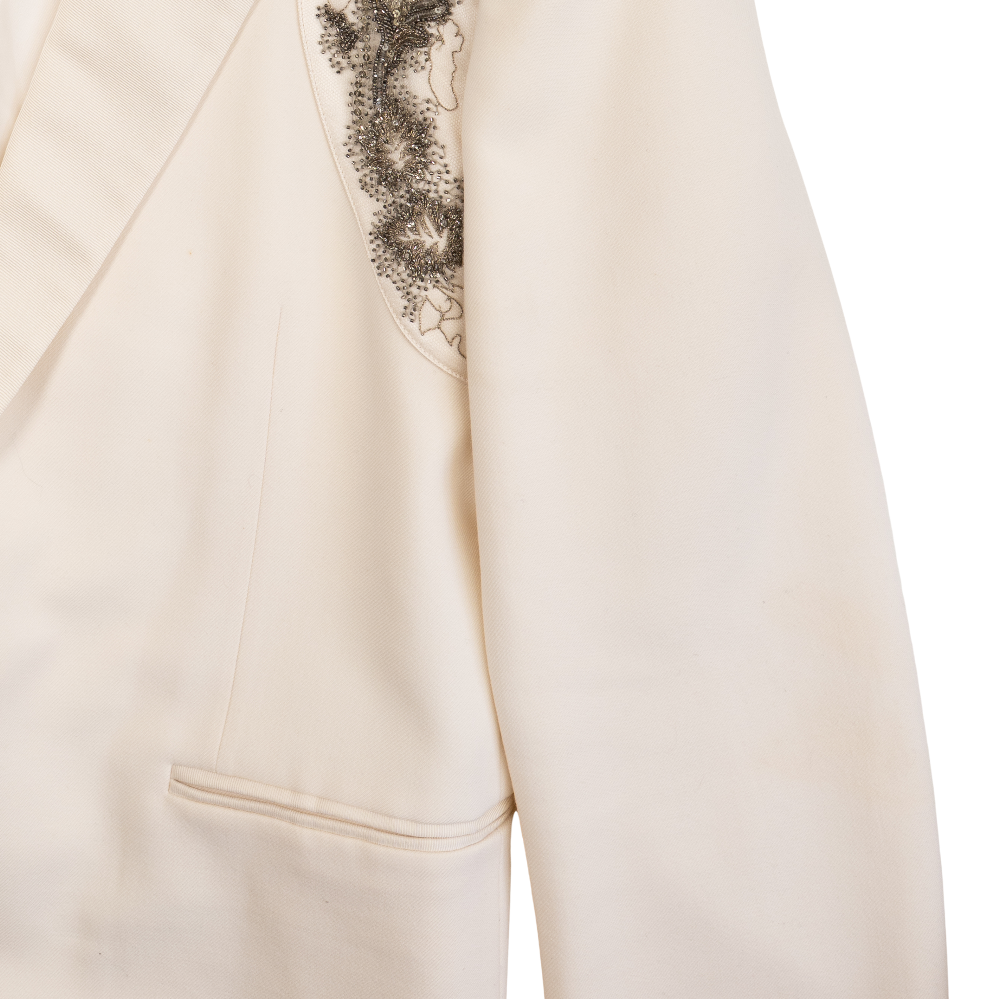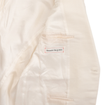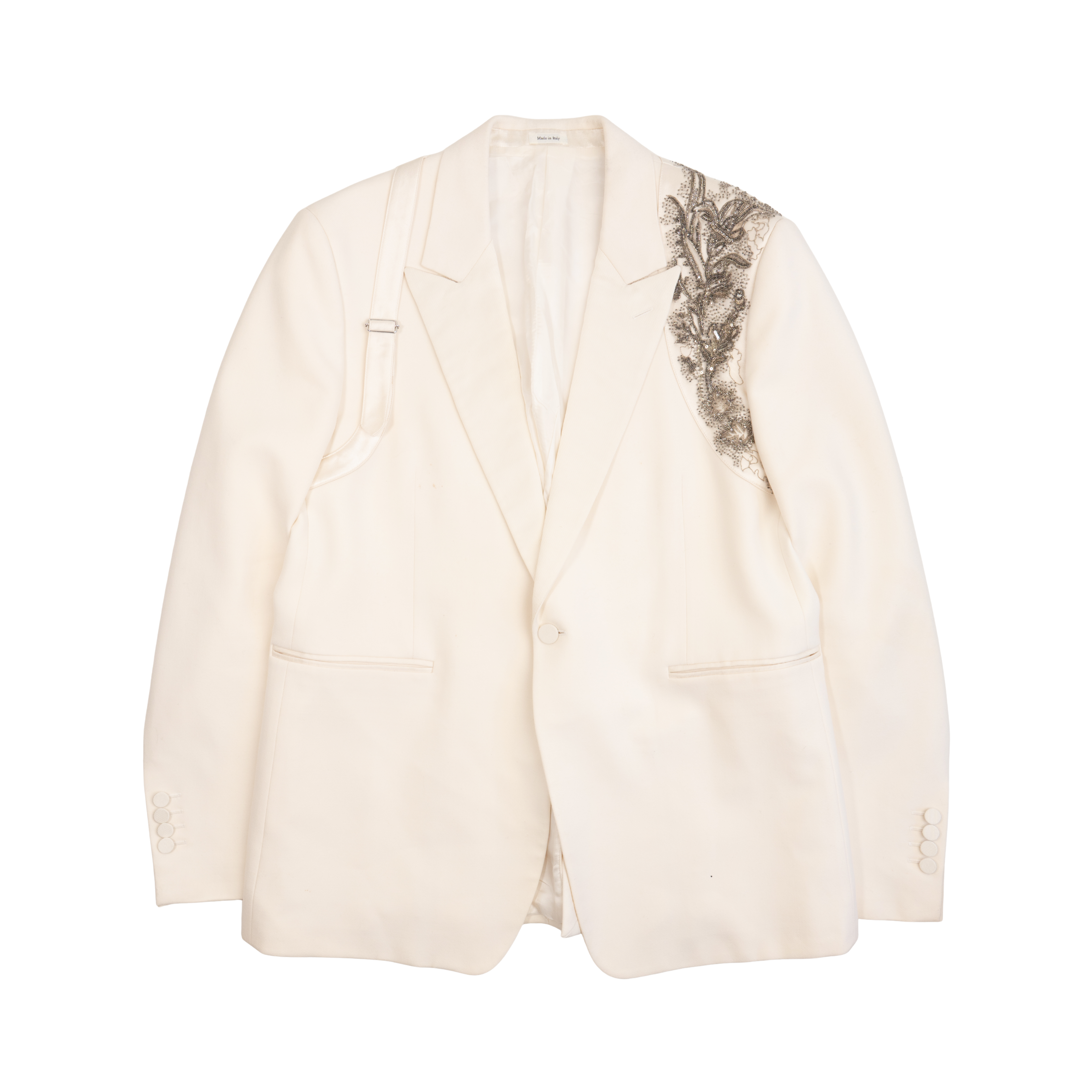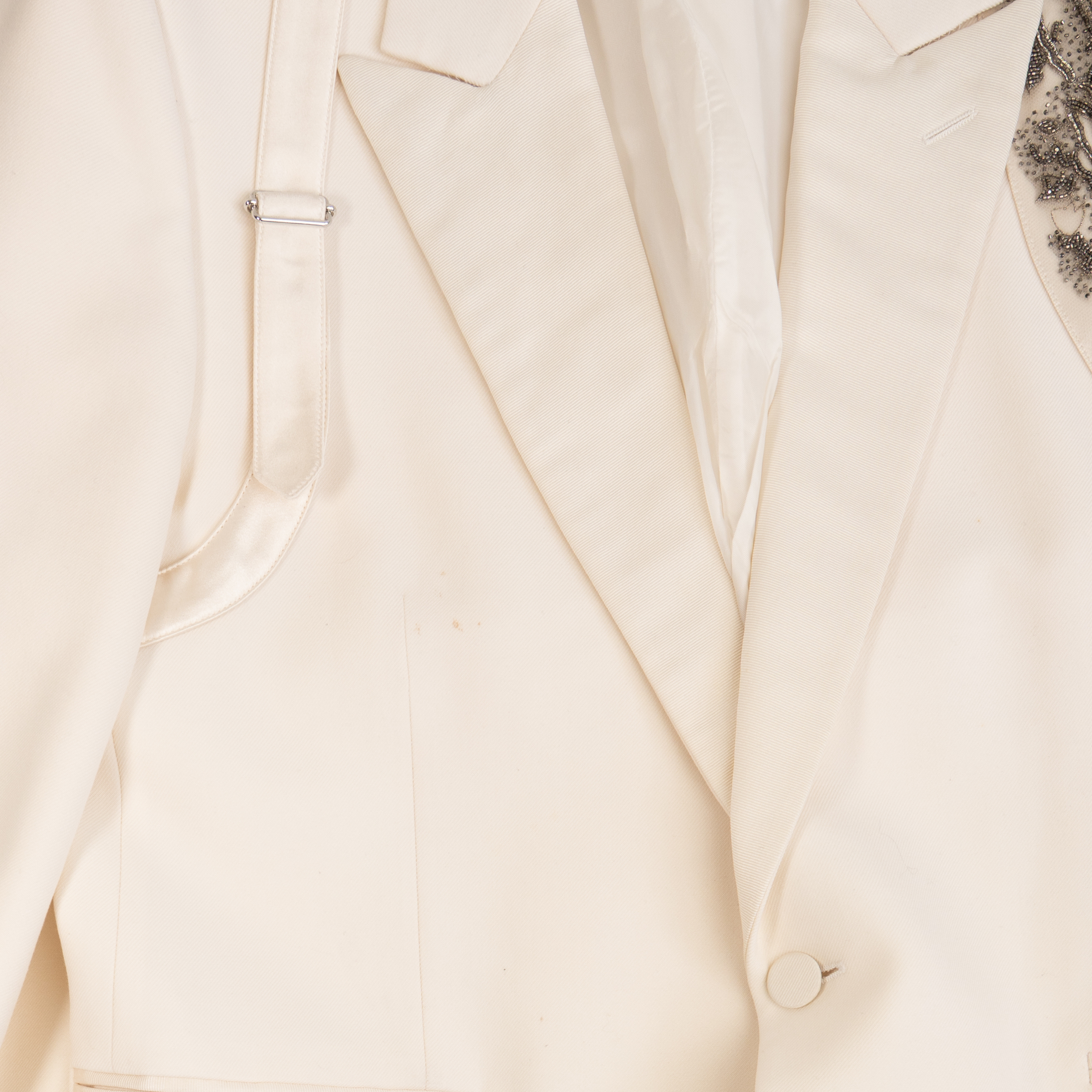 Alexander McQueen suit in cream wool with beaded satin harness on one shoulders of the tuxedo jacket. Jacket features a single button closure, peaked lapels, welt pockets on the front, and four button cuffs. Trousers are straight legged with welt pockets on the back, slip pockets in the side seams, and tonal silk stripes down the sides.