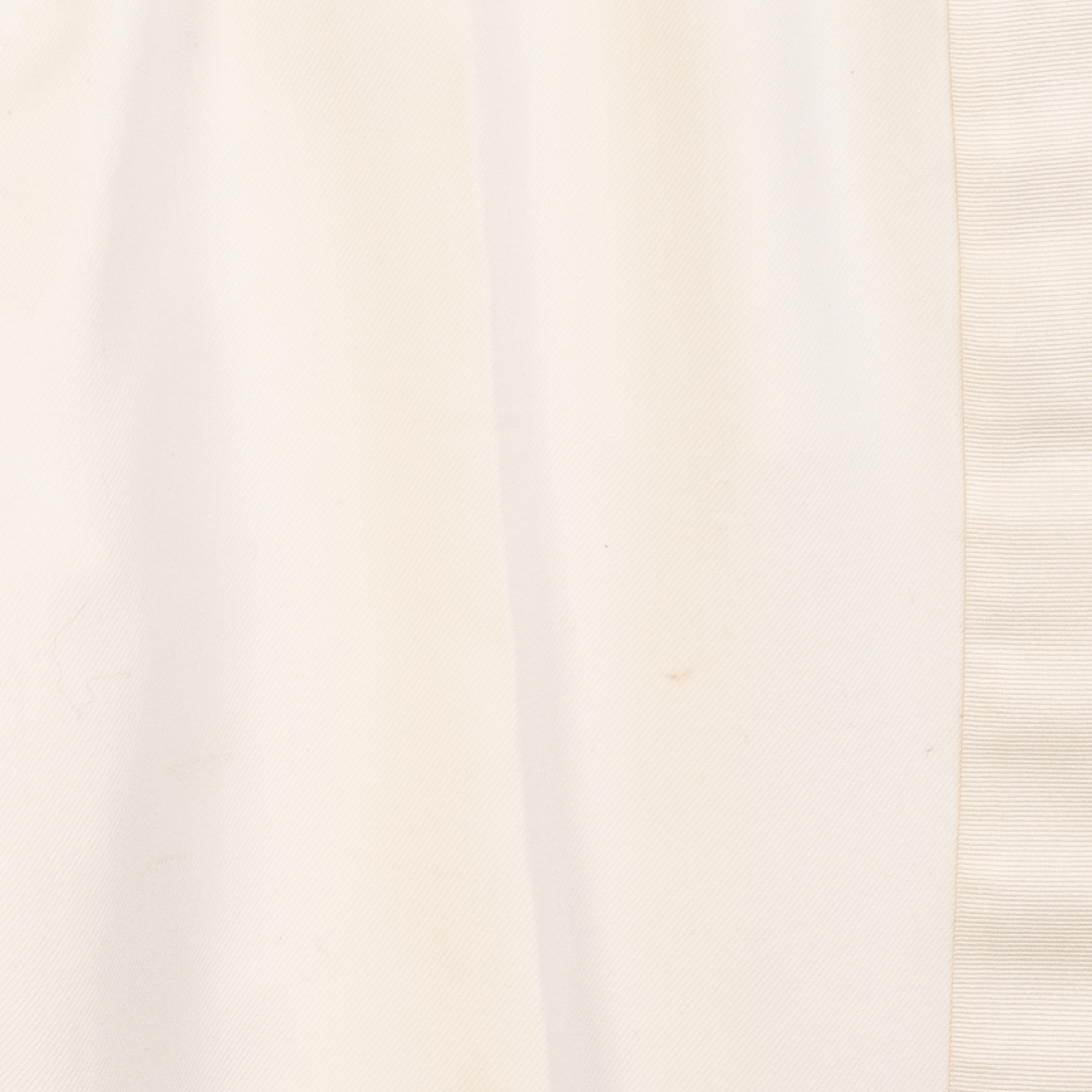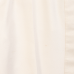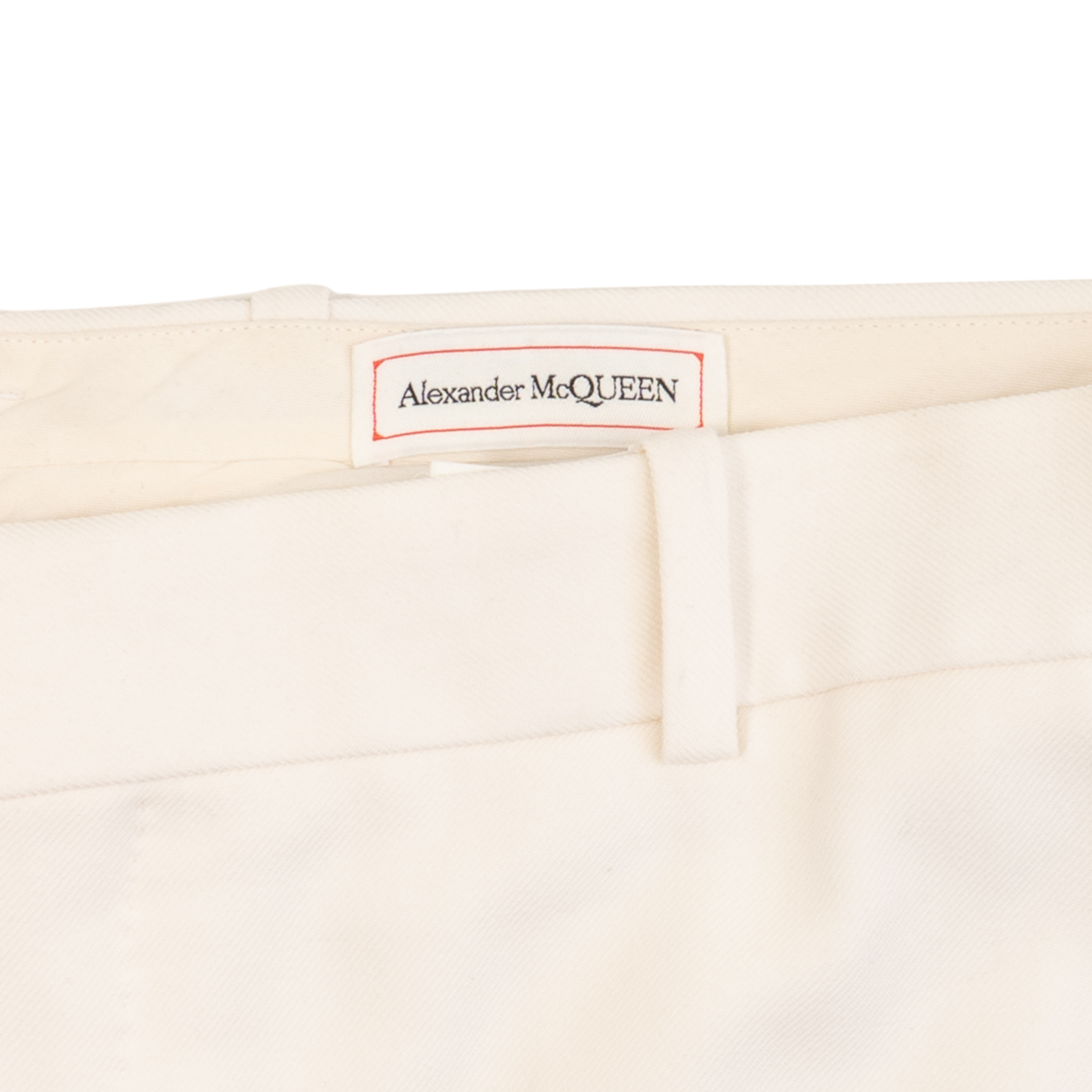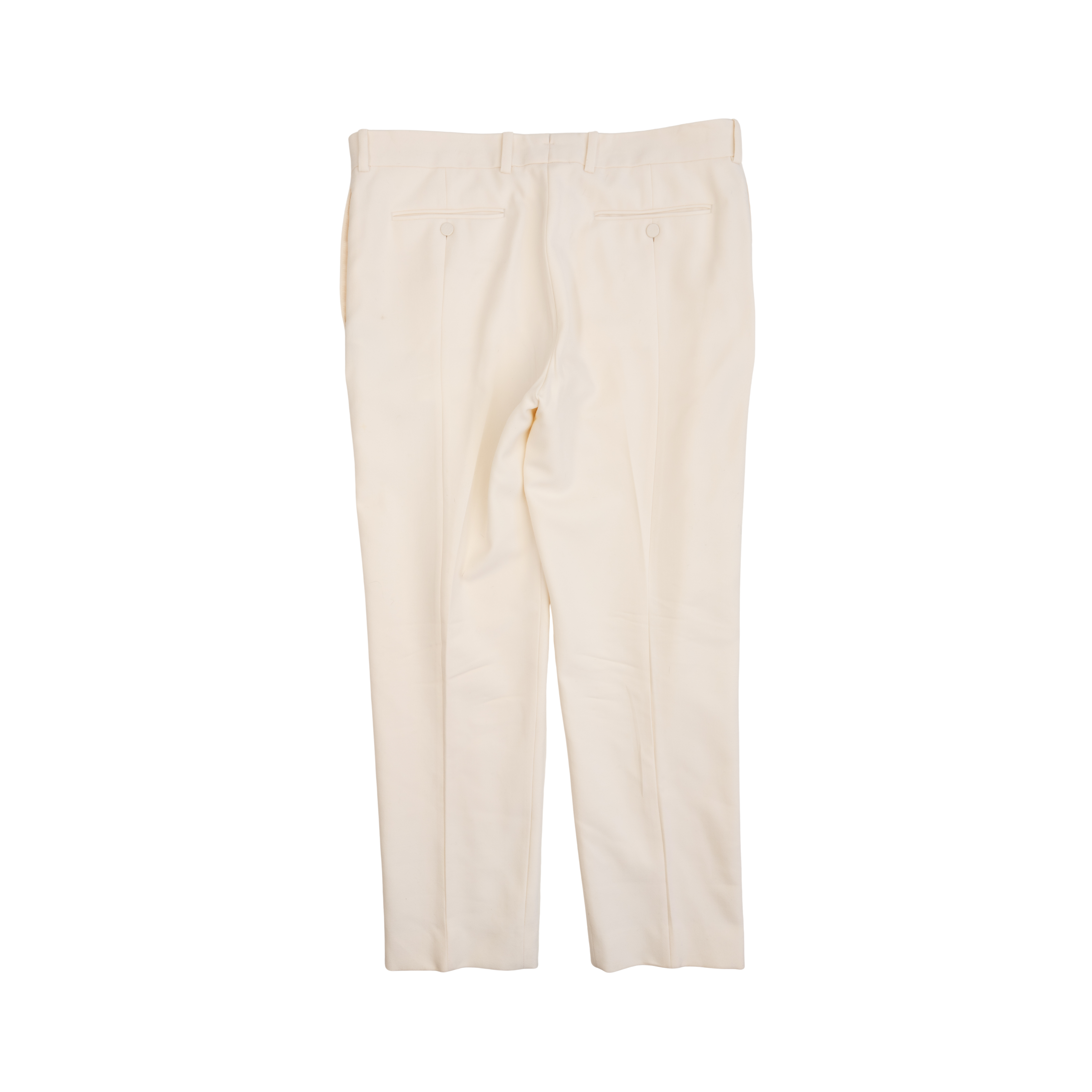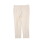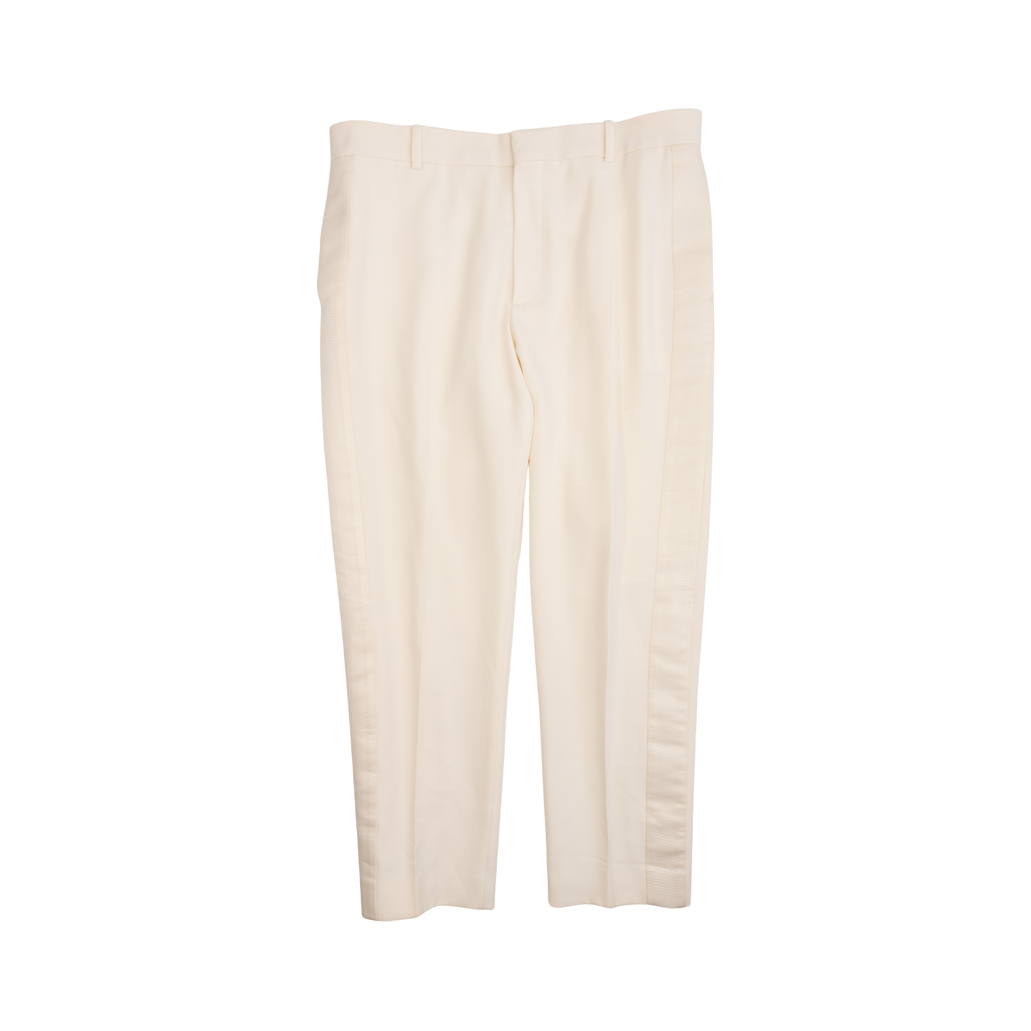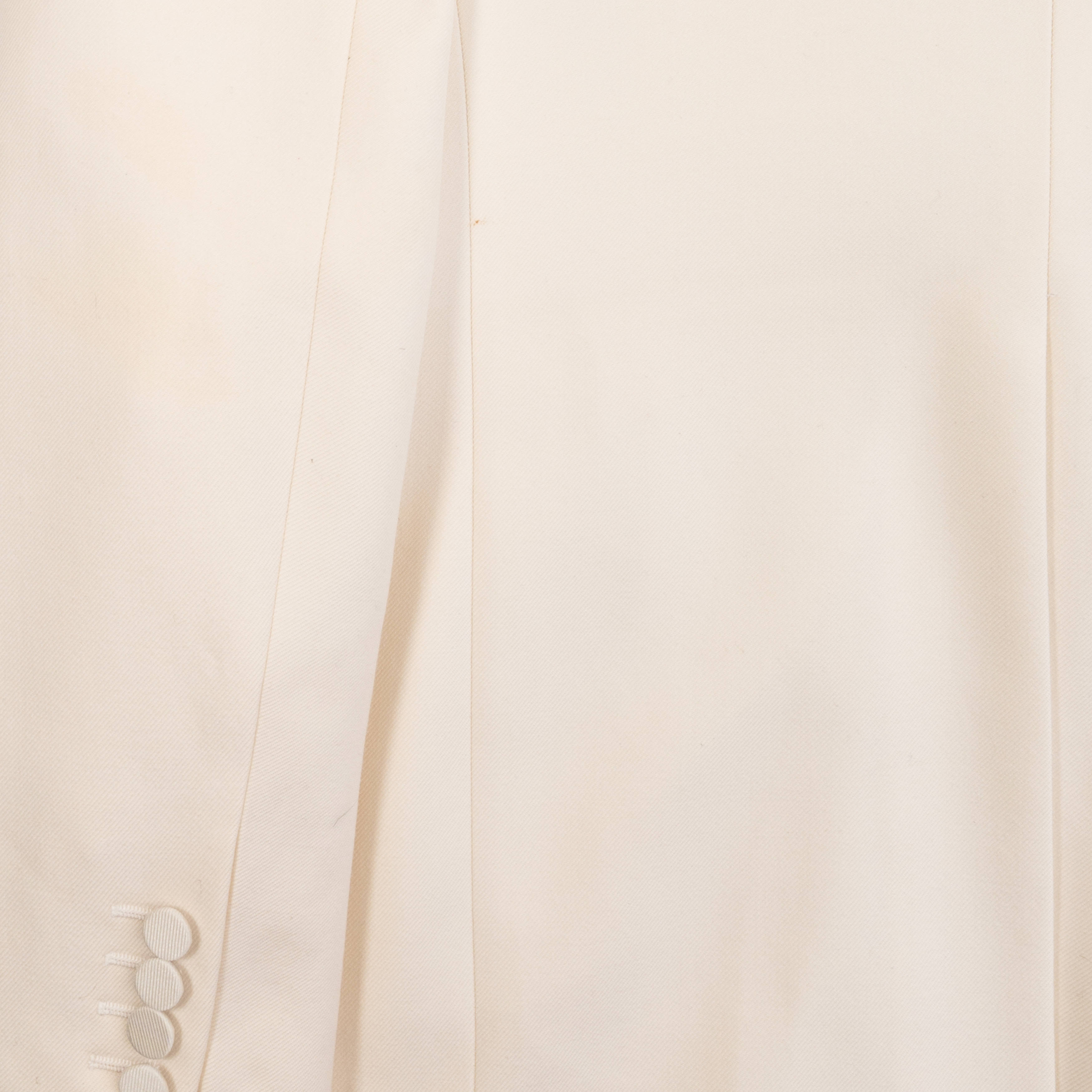 Alexander McQueen suit in cream wool with beaded satin harness on one shoulders of the tuxedo jacket. Jacket features a single button closure, peaked lapels, welt pockets on the front, and four button cuffs. Trousers are straight legged with welt pockets on the back, slip pockets in the side seams, and tonal silk stripes down the sides.