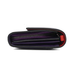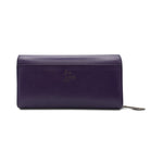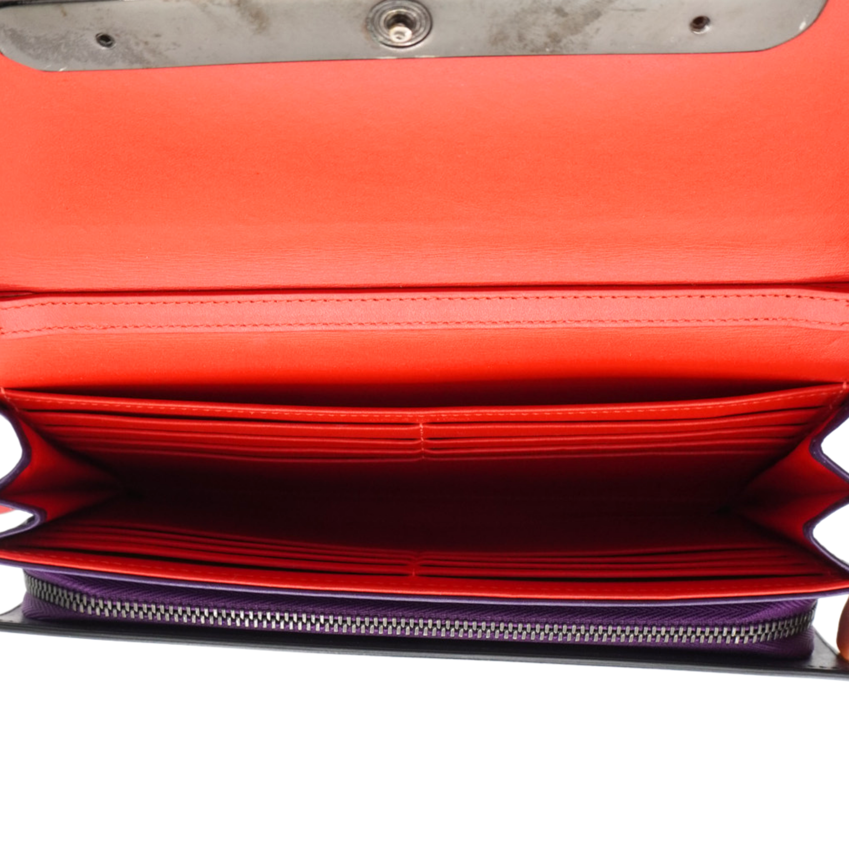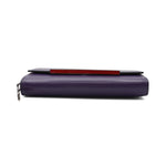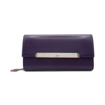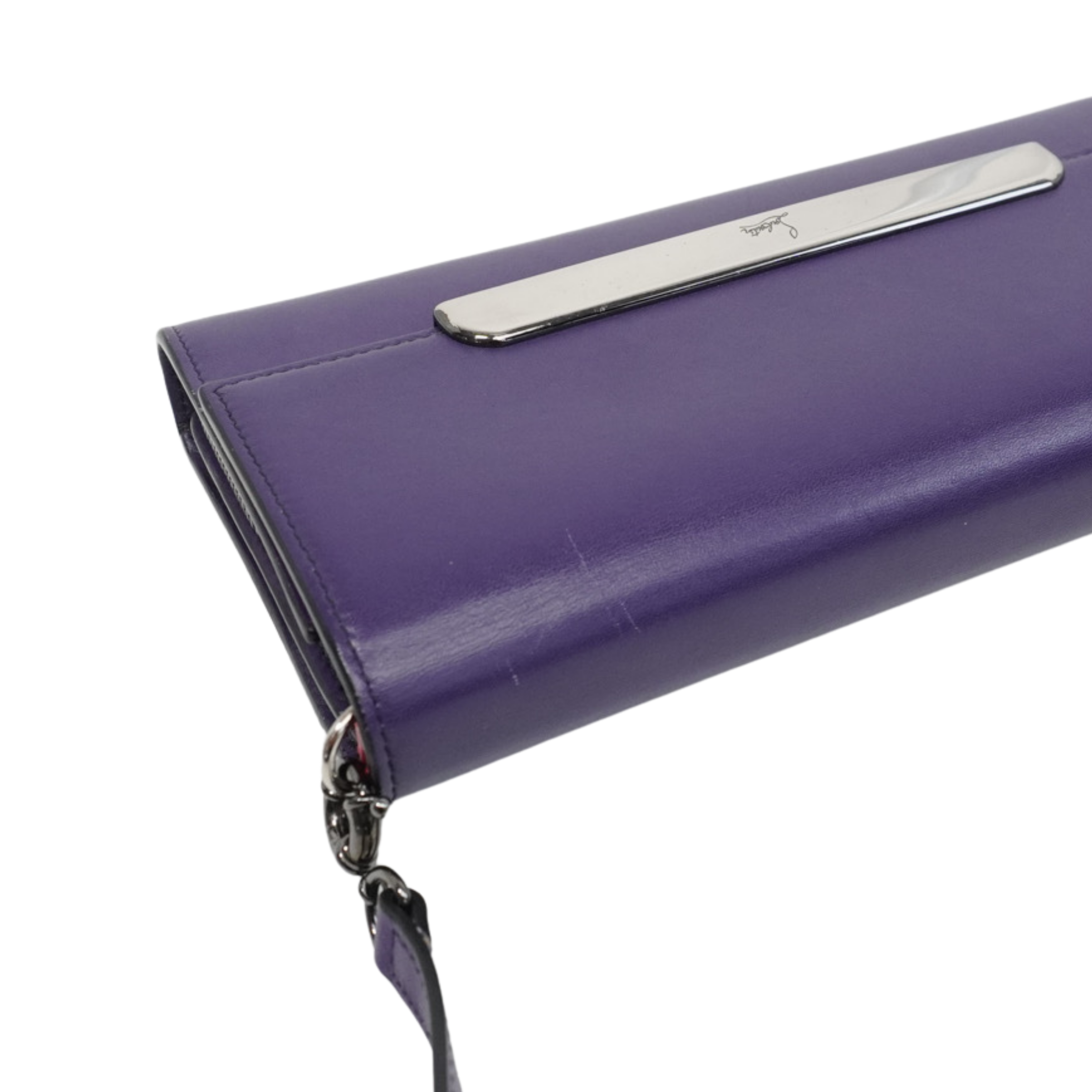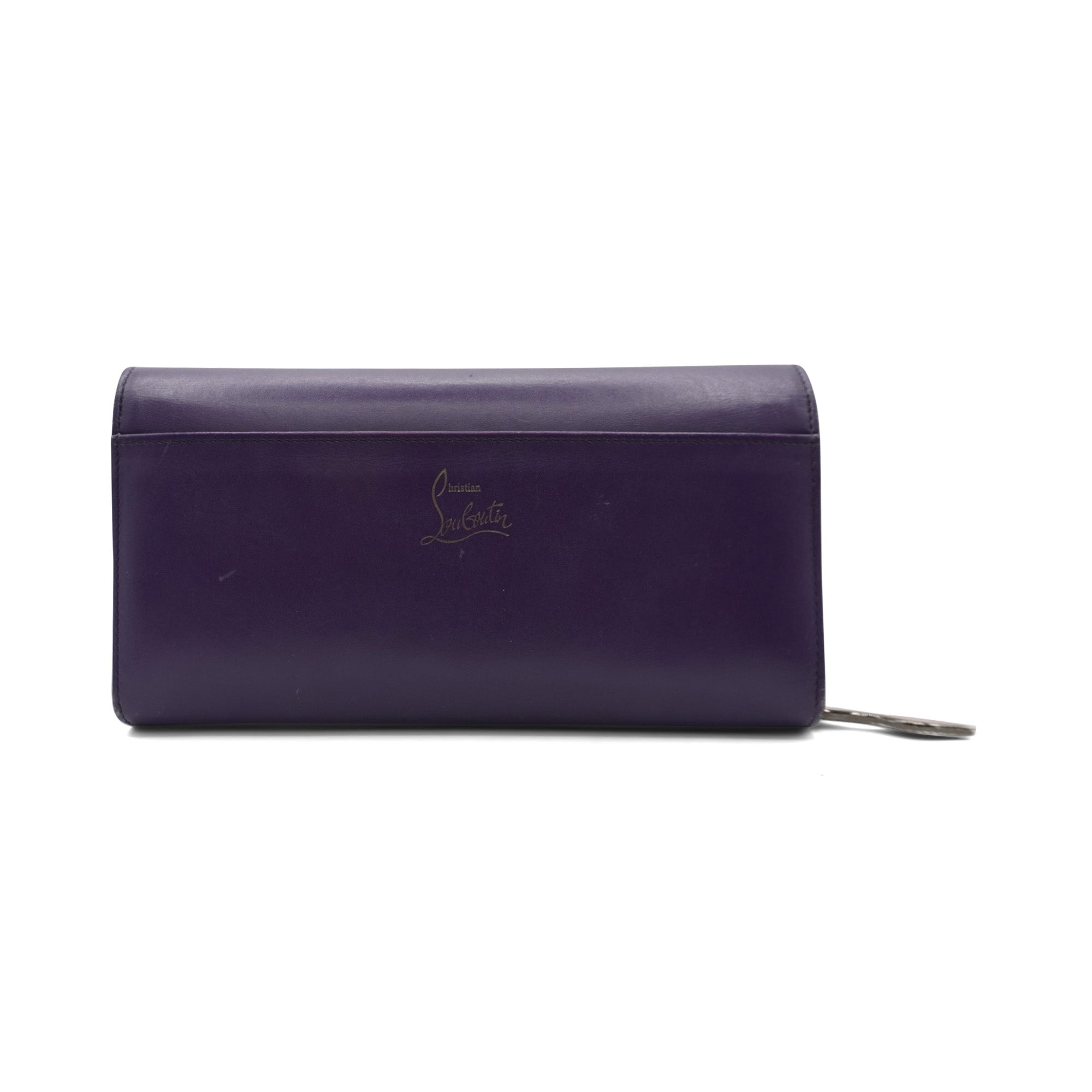 Christian Louboutin 'Rougissime' wallet on chain in violet smooth leather with a front flap snap closure, embossed logo bar on the front in gunmetal hardware and removable crossbody strap. Features a red lining with main comparment with multiple card slots and a zip pouch with a red pointed zipper pull.