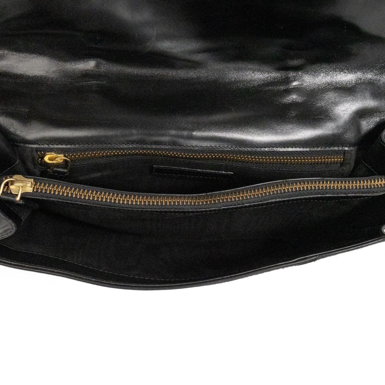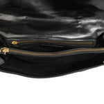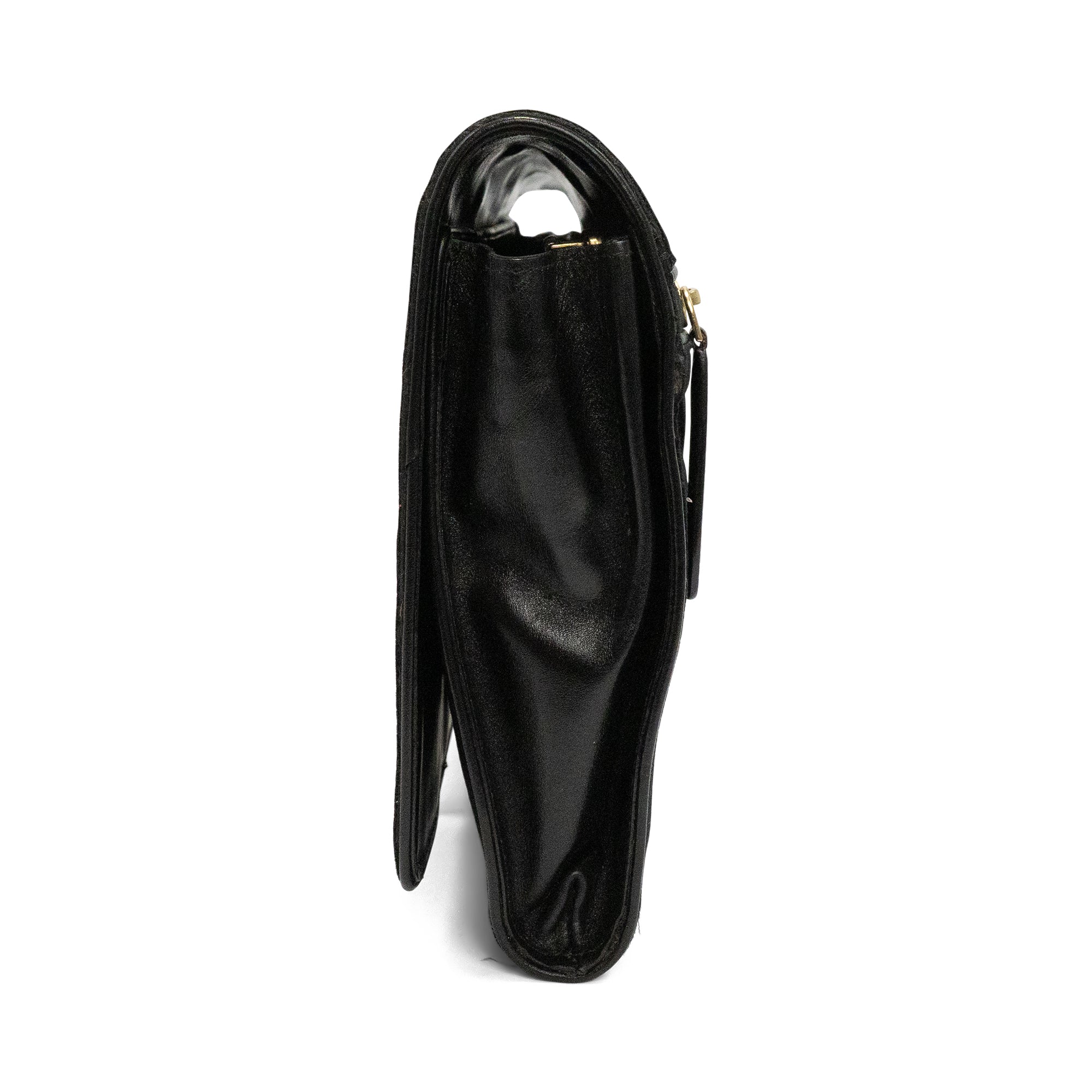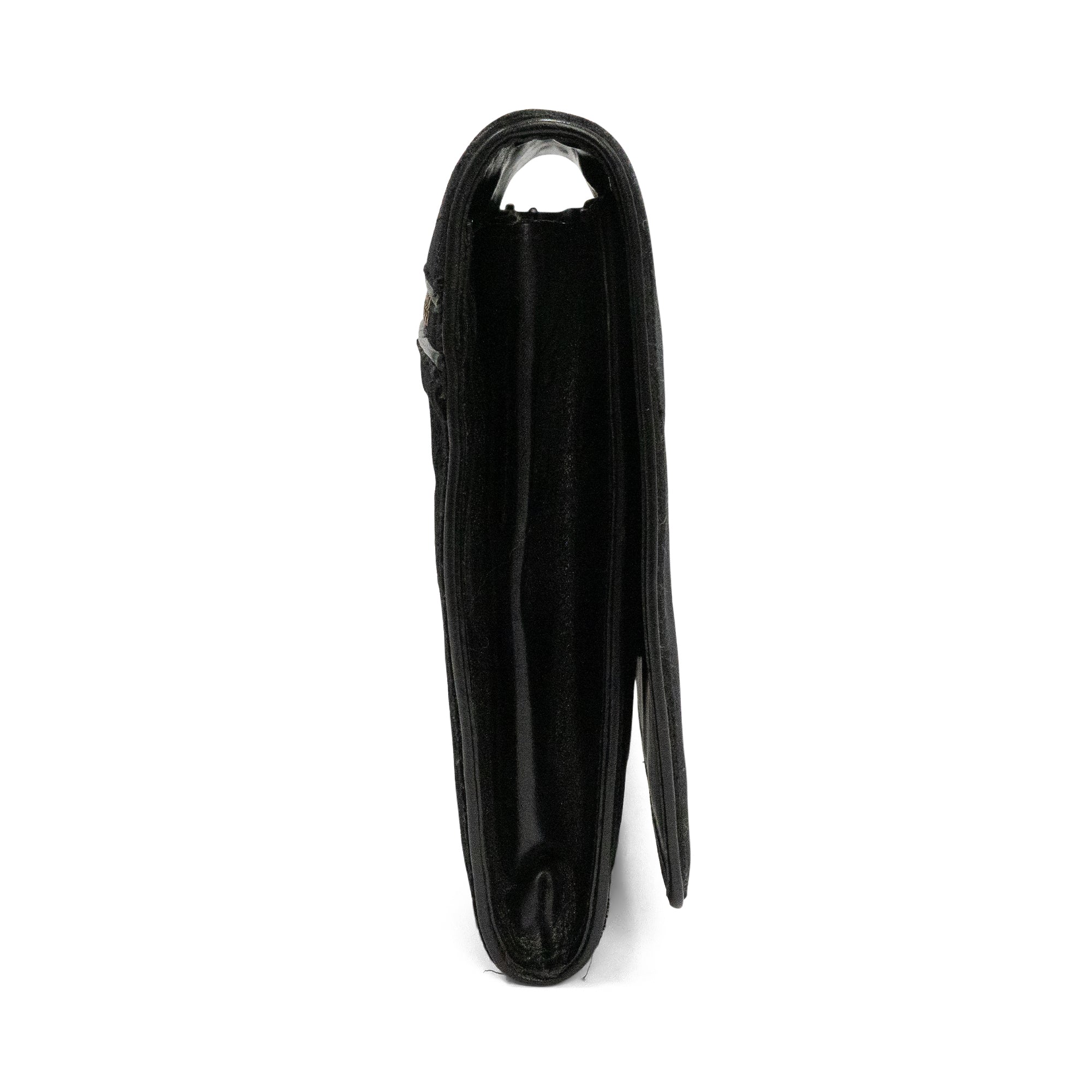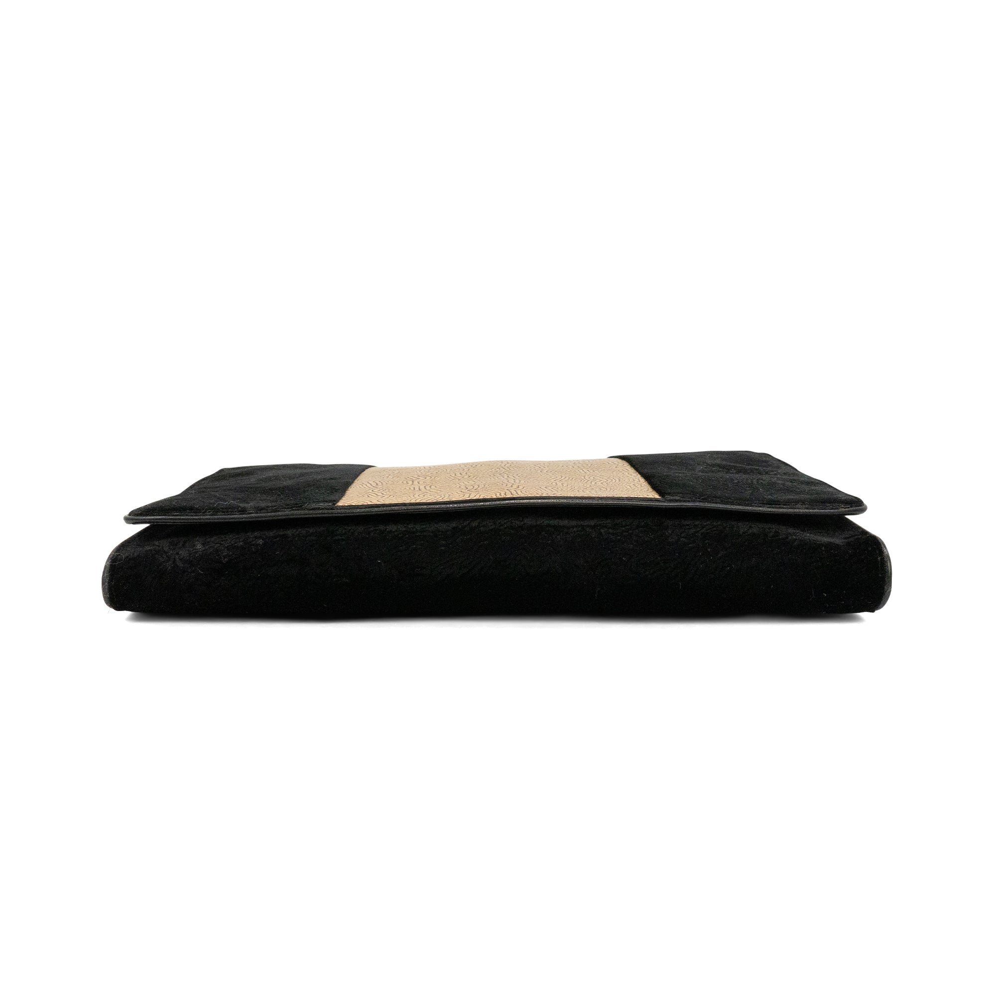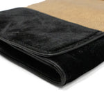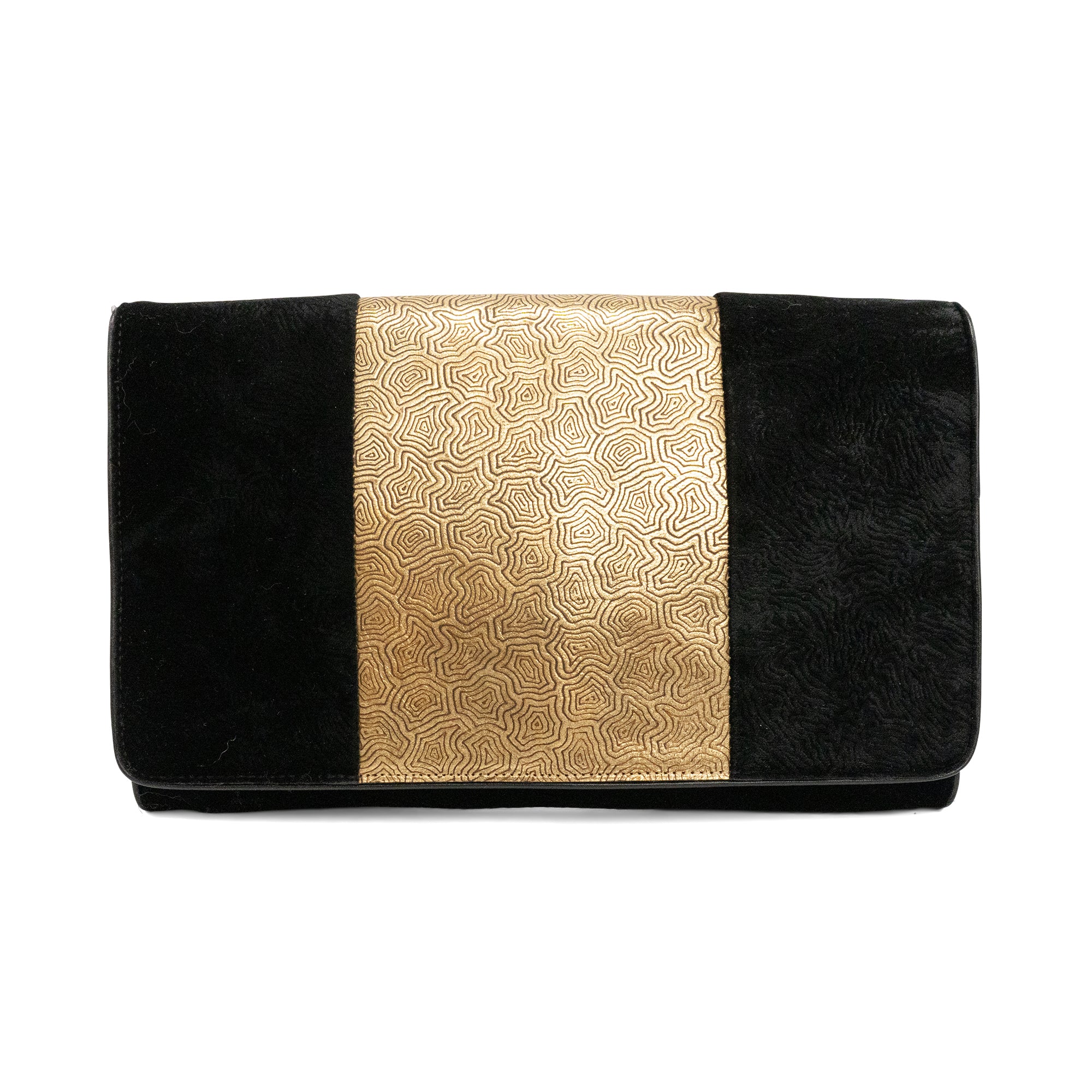 Dries Van Noten clutch in black velvet with gold metallic geometric embossed panel and back zipper pocket. Opens to two interior compartments with two zip pockets.