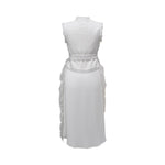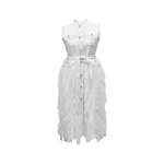 Huishan Zhang long dress in white tweed with white ostrich feathers and pearl buttons.