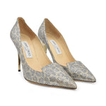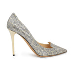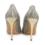 Jimmy Choo heels in gold and silver glitter with a subtle leopard print, a pointed toe, and a metallic gold heel.