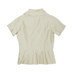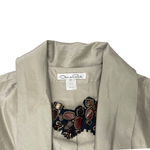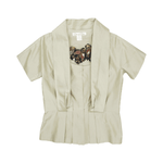 Oscar De La Renta short sleeve top in reflective taupe silk with a knit and gems appliqué on the rounded neckline and pleated detailing.