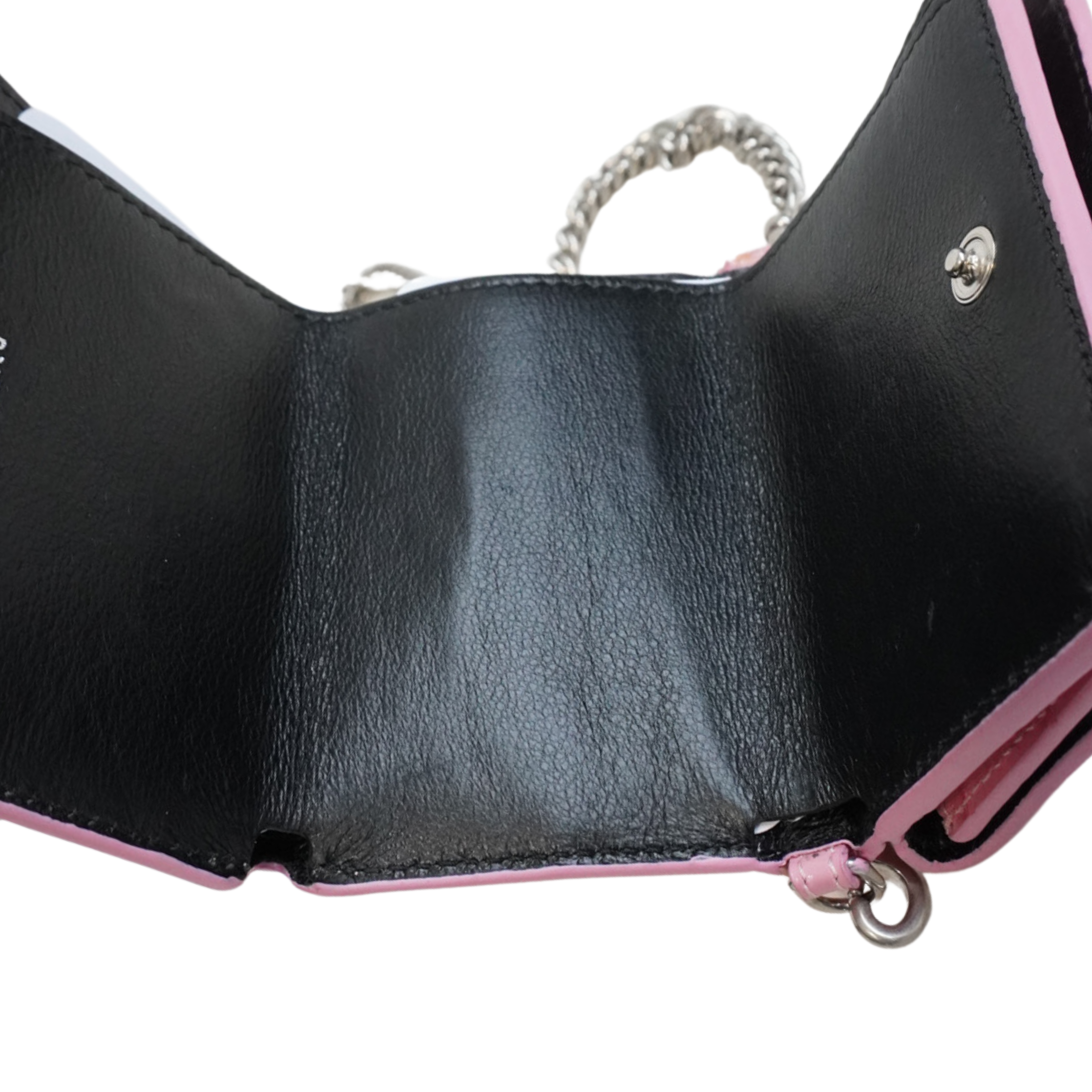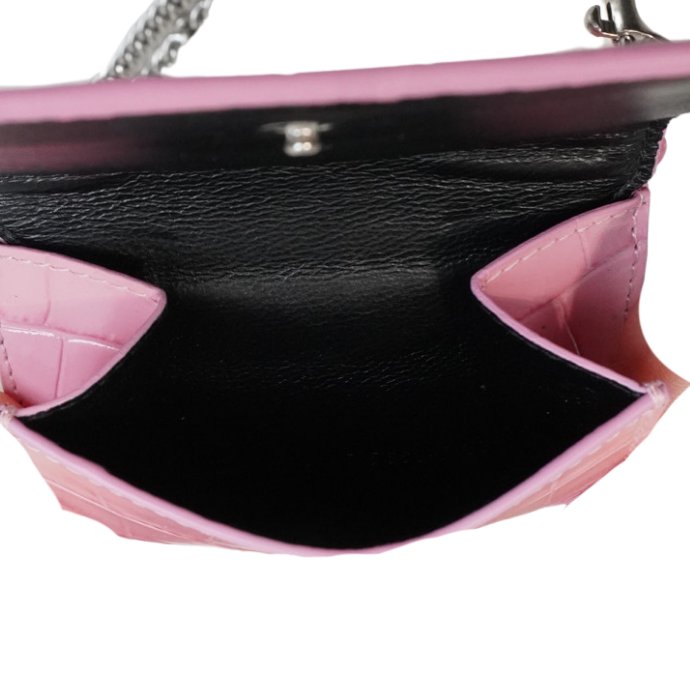 Balenciaga compact wallet on chain in pink croc embossed leather with black logo print and a removable silver chain crossbody strap. Features 3 card slots, a cash pocket, and coin pocket with snap button flap closure.