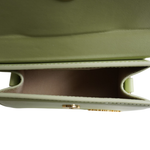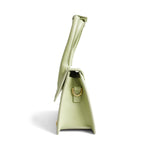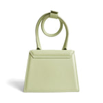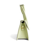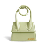 Jacquemus 'Le Chiquito Noeud' handbag in pistachio green smooth leather with gold logo hardware. Feature signature looped handle and removable crossbody strap. The bag is lined with beige fabric and has a magnetic closure.