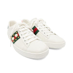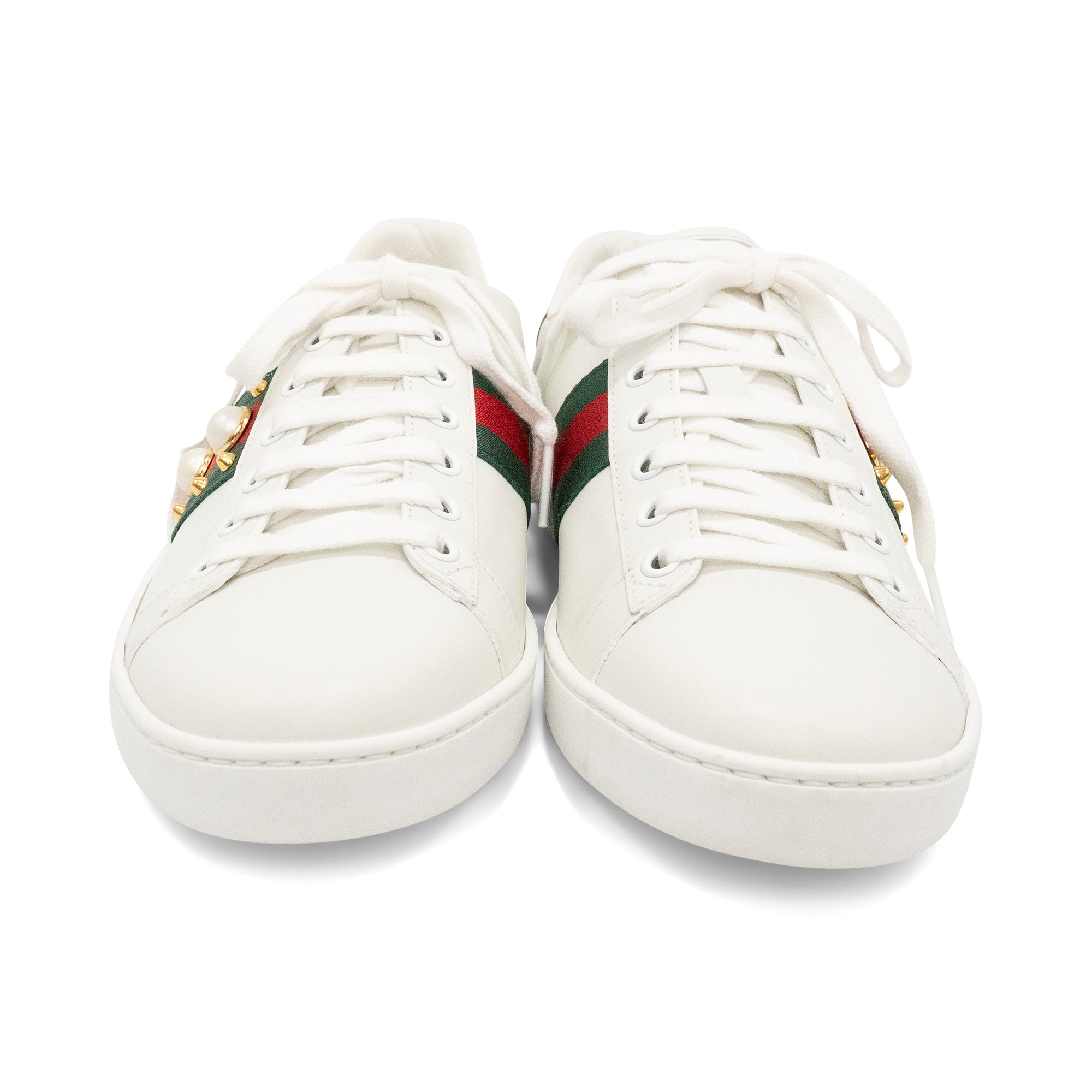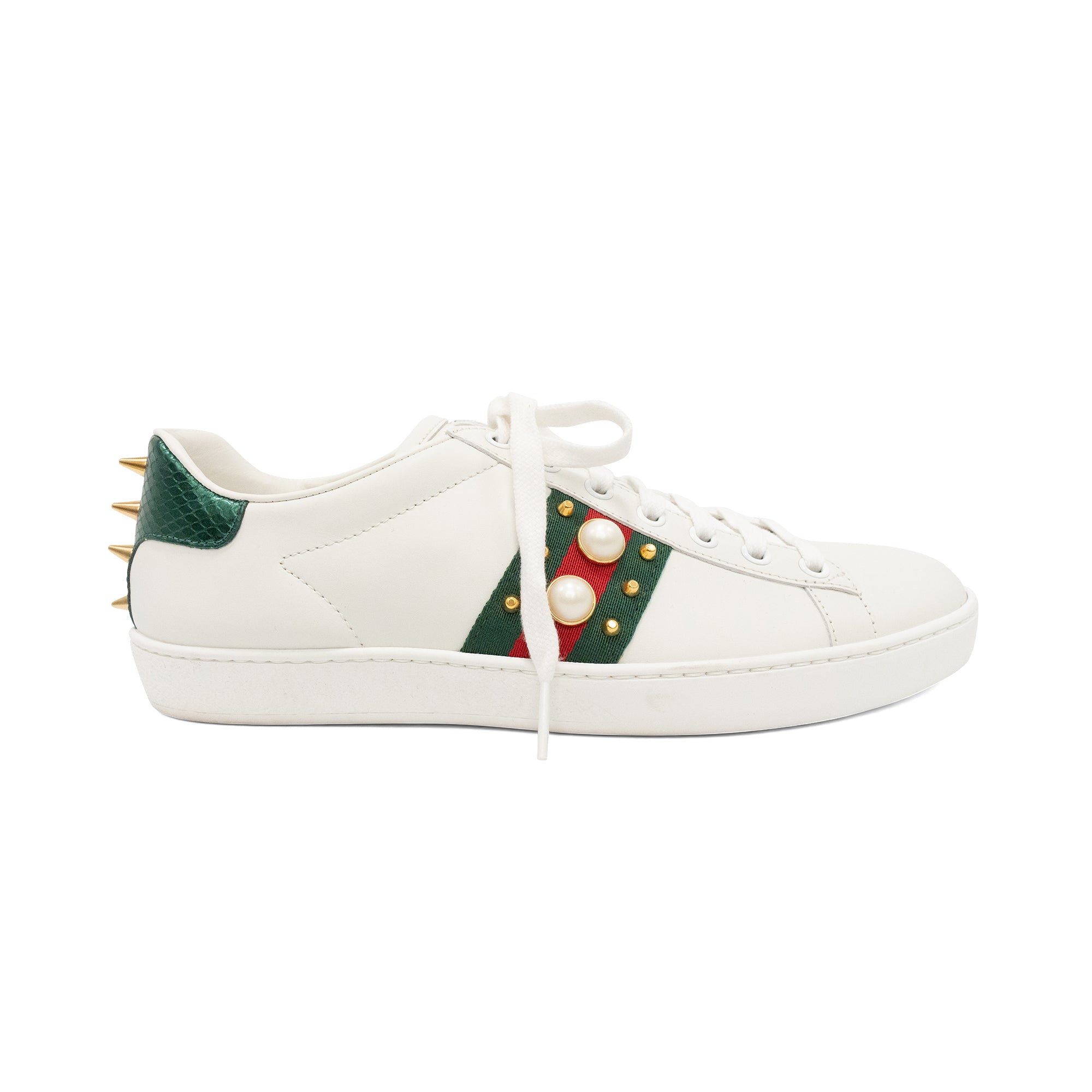 Gucci 'Ace Studded' low top sneakers in white leather with canvas racing stripe on the side with pearl and gold stud details. Features green and red metallic, embossed heel details with gold spikes down the back, and white laces.