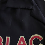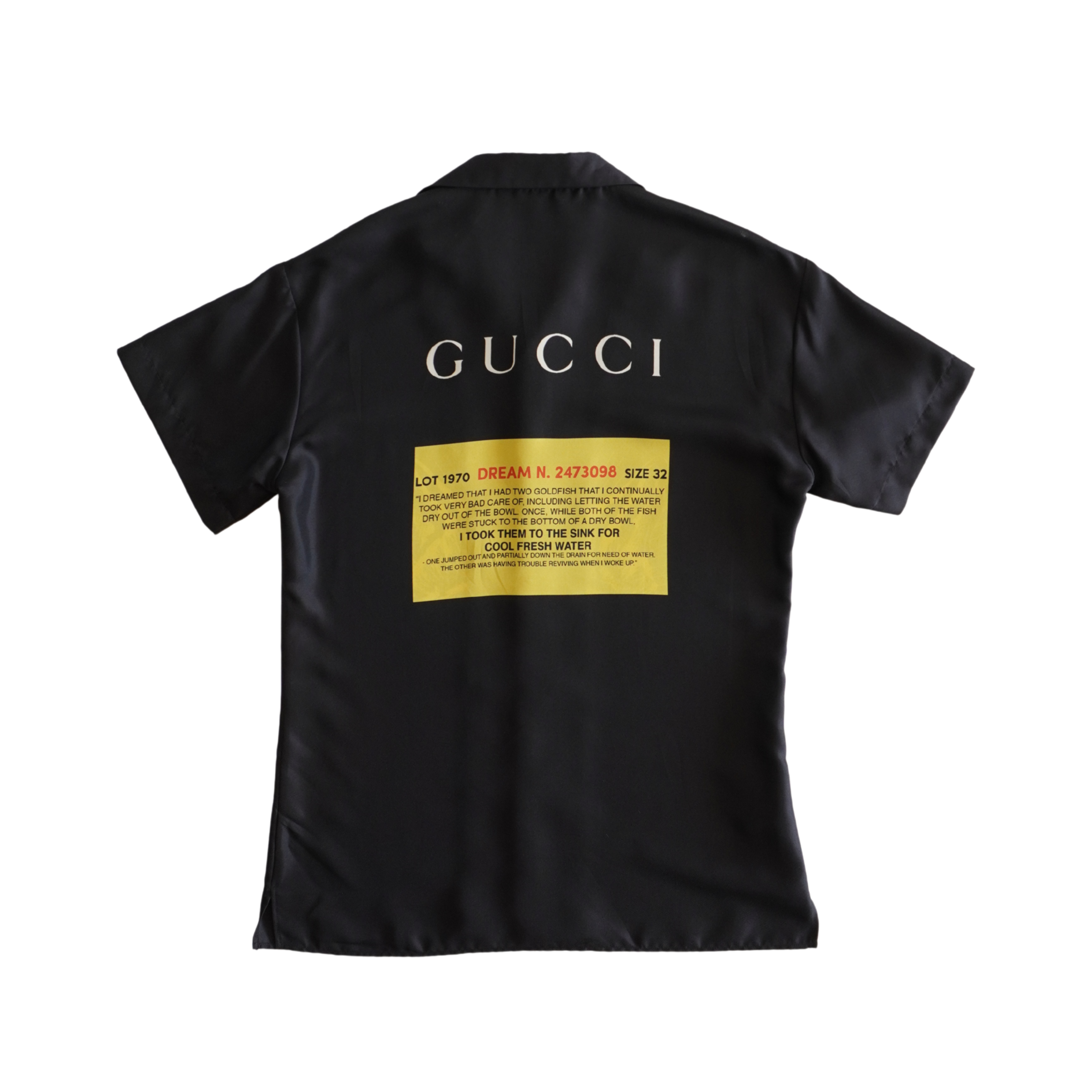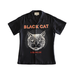 Gucci 'Black Cat' short-sleeve button-down shirt in black silk with white cat graphic and red lettering on the front. The back features yellow rectangle poem graphic and Gucci logo.