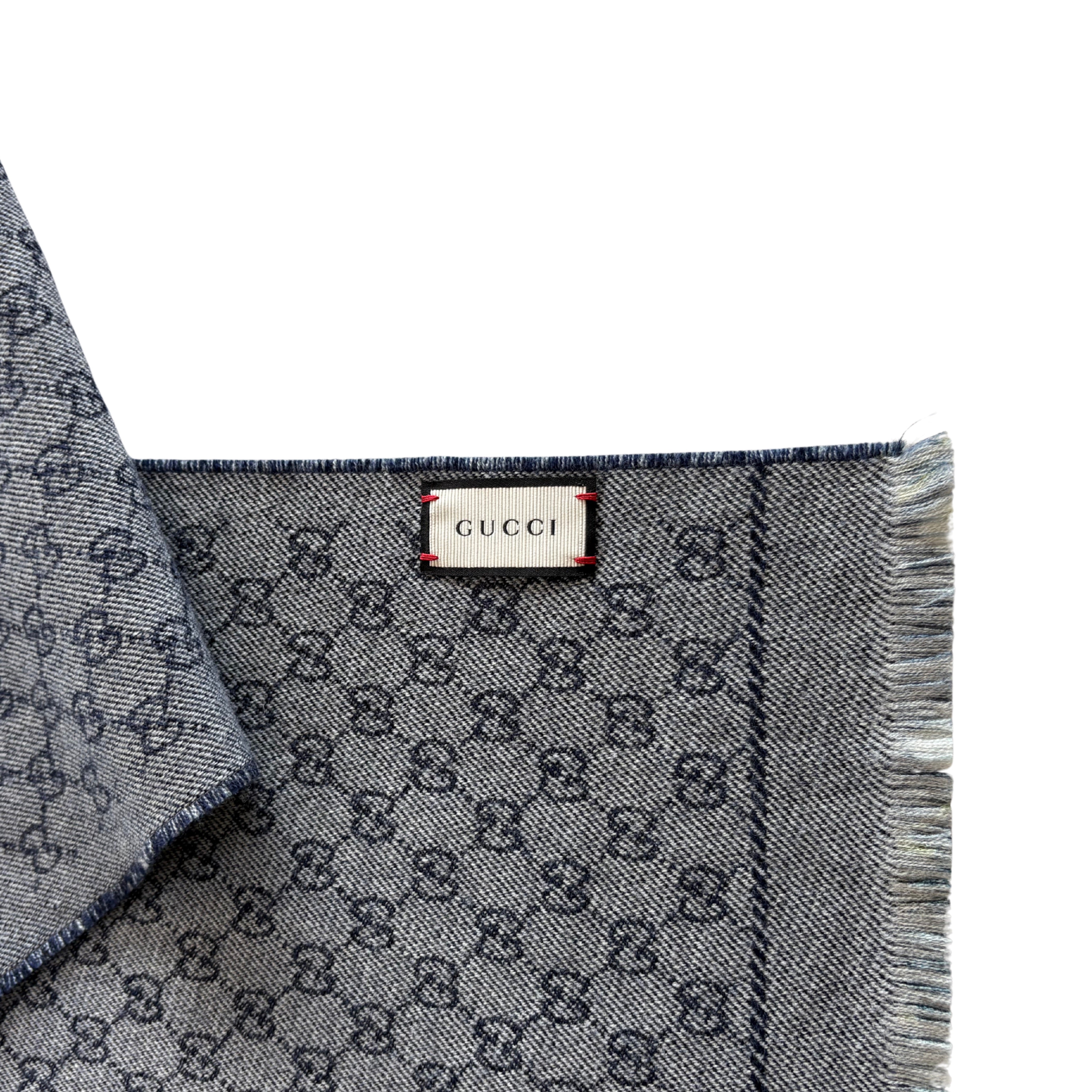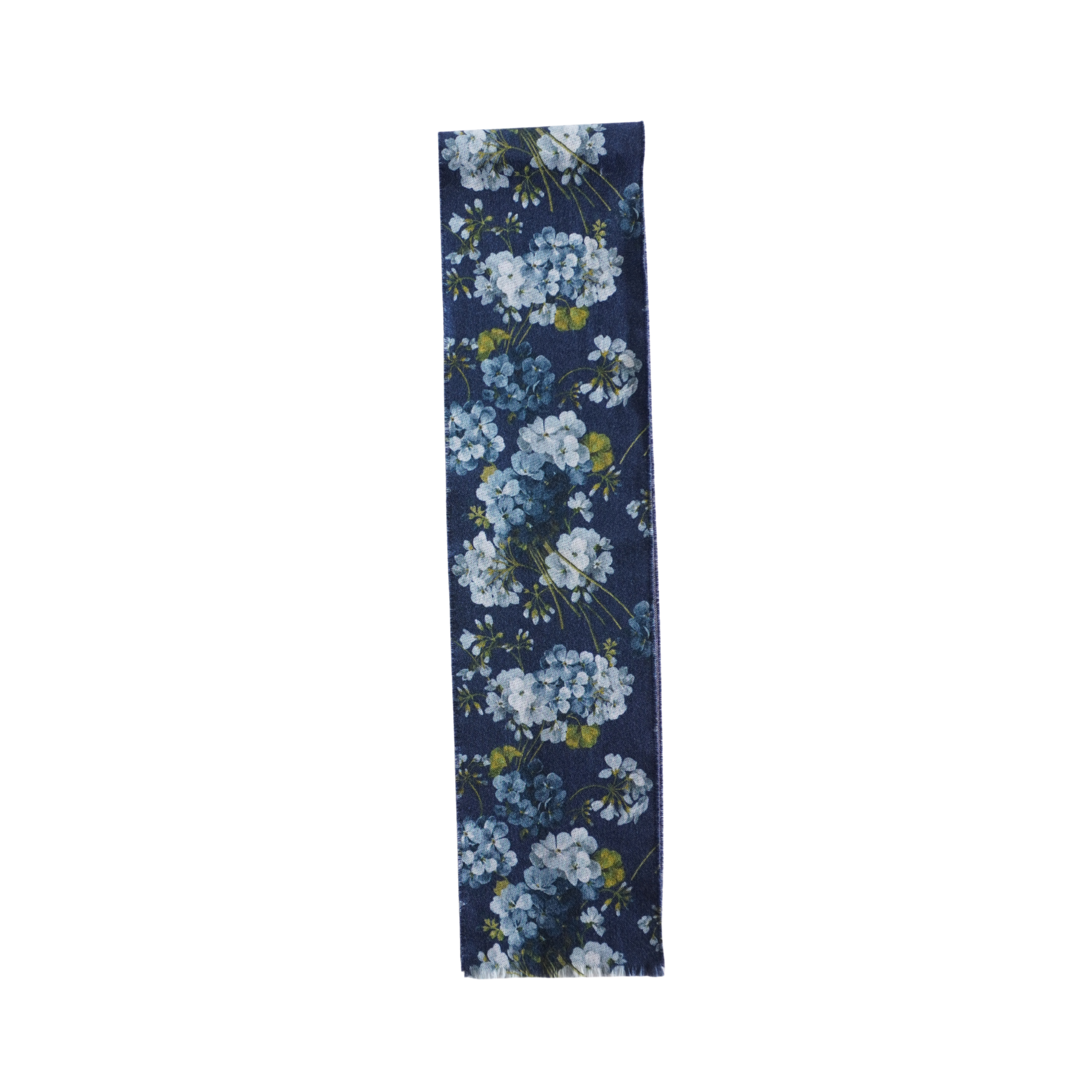 Gucci 'Bloom' scarf in navy wool with a green and blue floral pattern on one side, a monogram reverse, and a short fringe trim.
