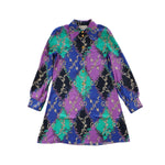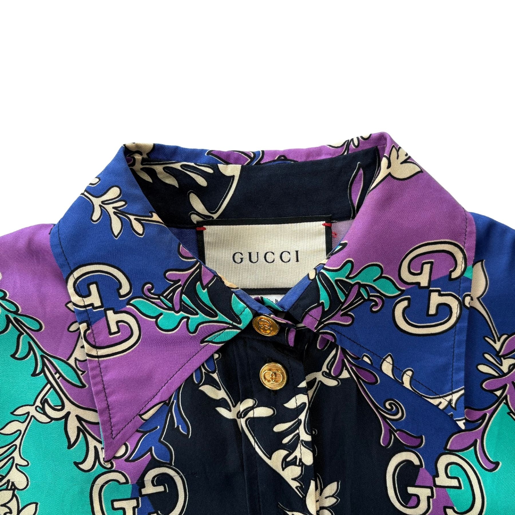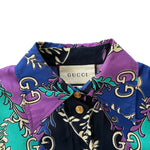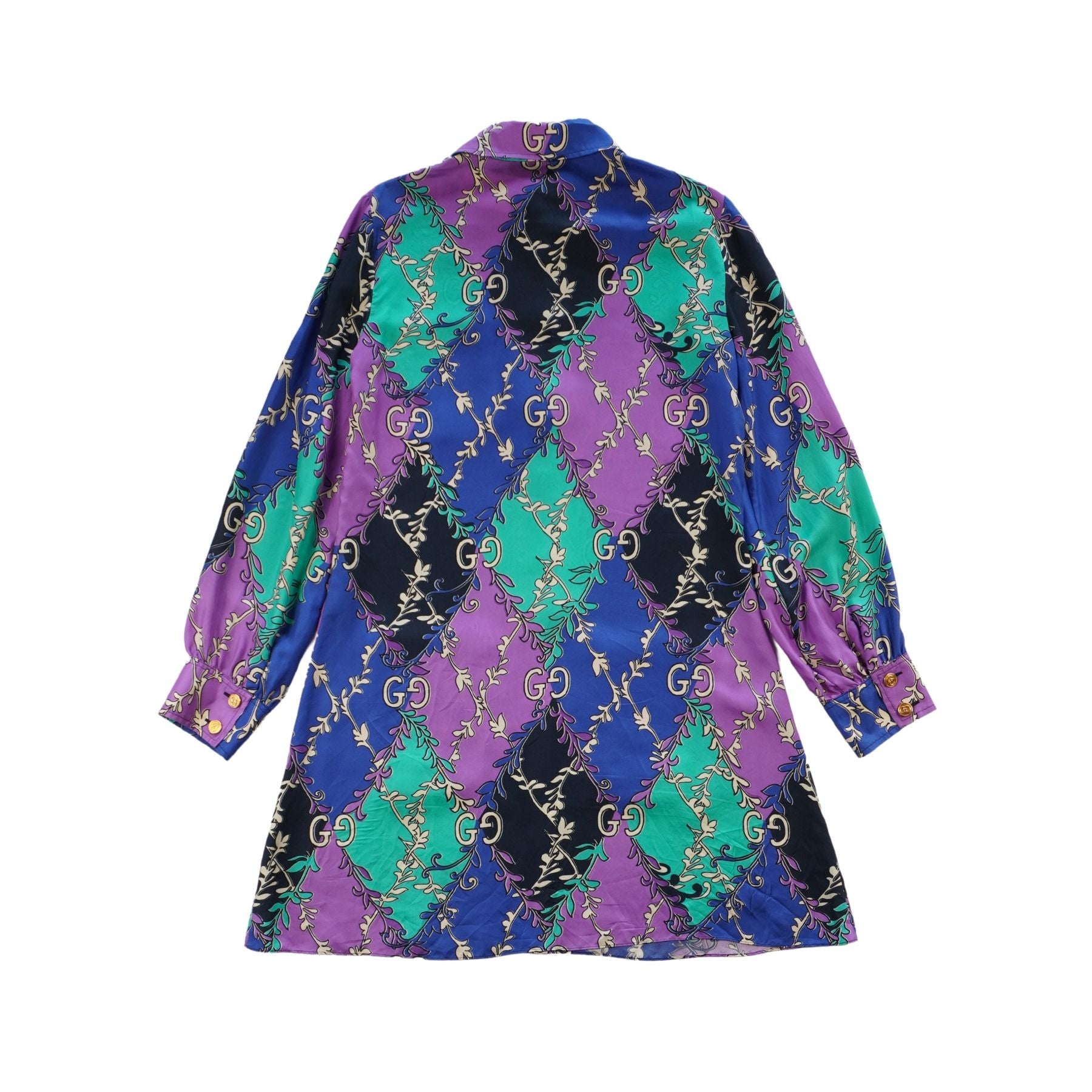 Gucci shirt dress in blue, purple and green rhombus diamond printed silk with an al-over GG logo print and interlocking GG button closure.