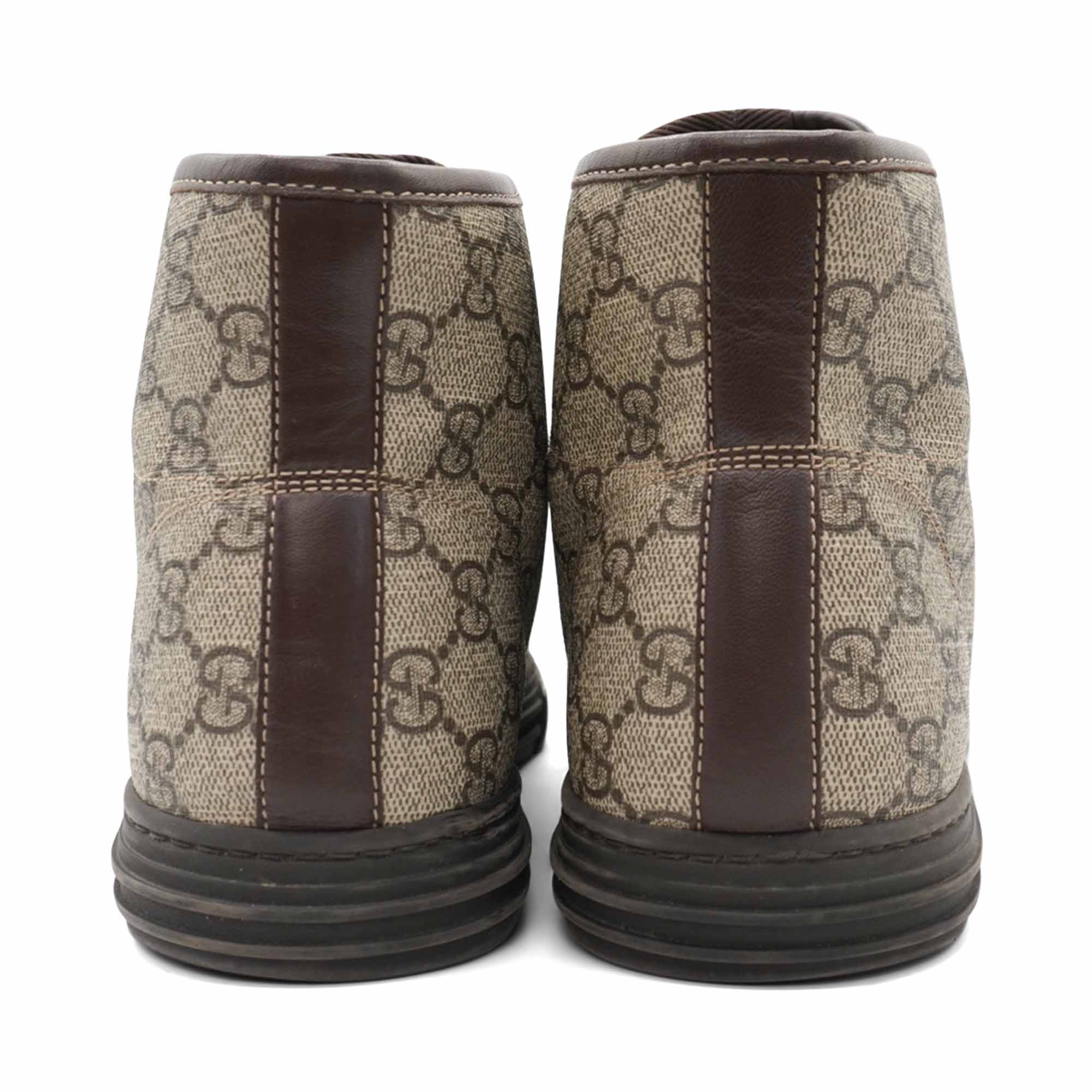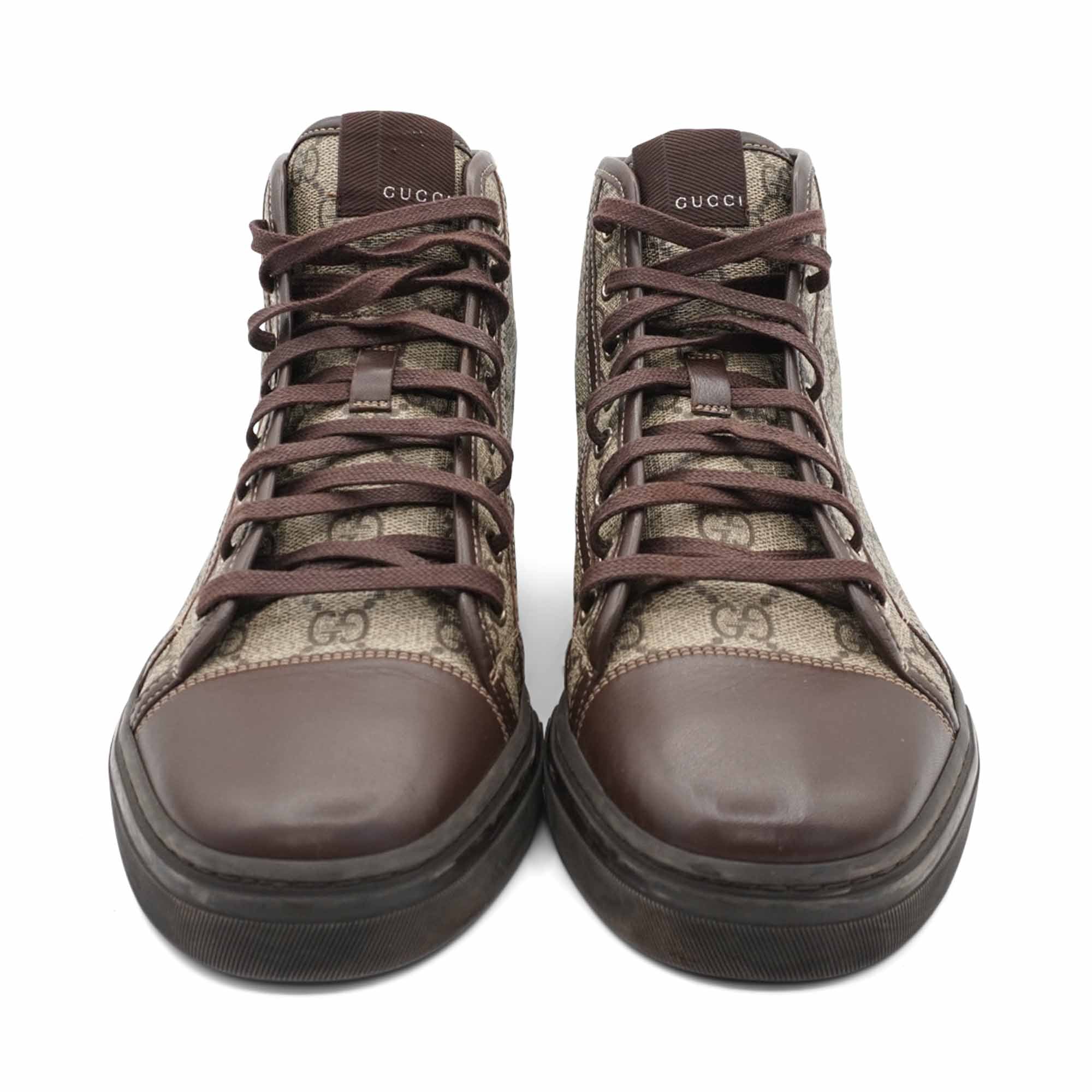 Gucci 'California' high-top sneakers in brown monogram printed coated canvas with brown leather trim, brown laces, and a brown rubber sole.