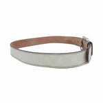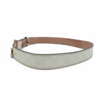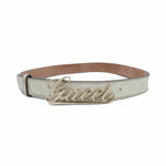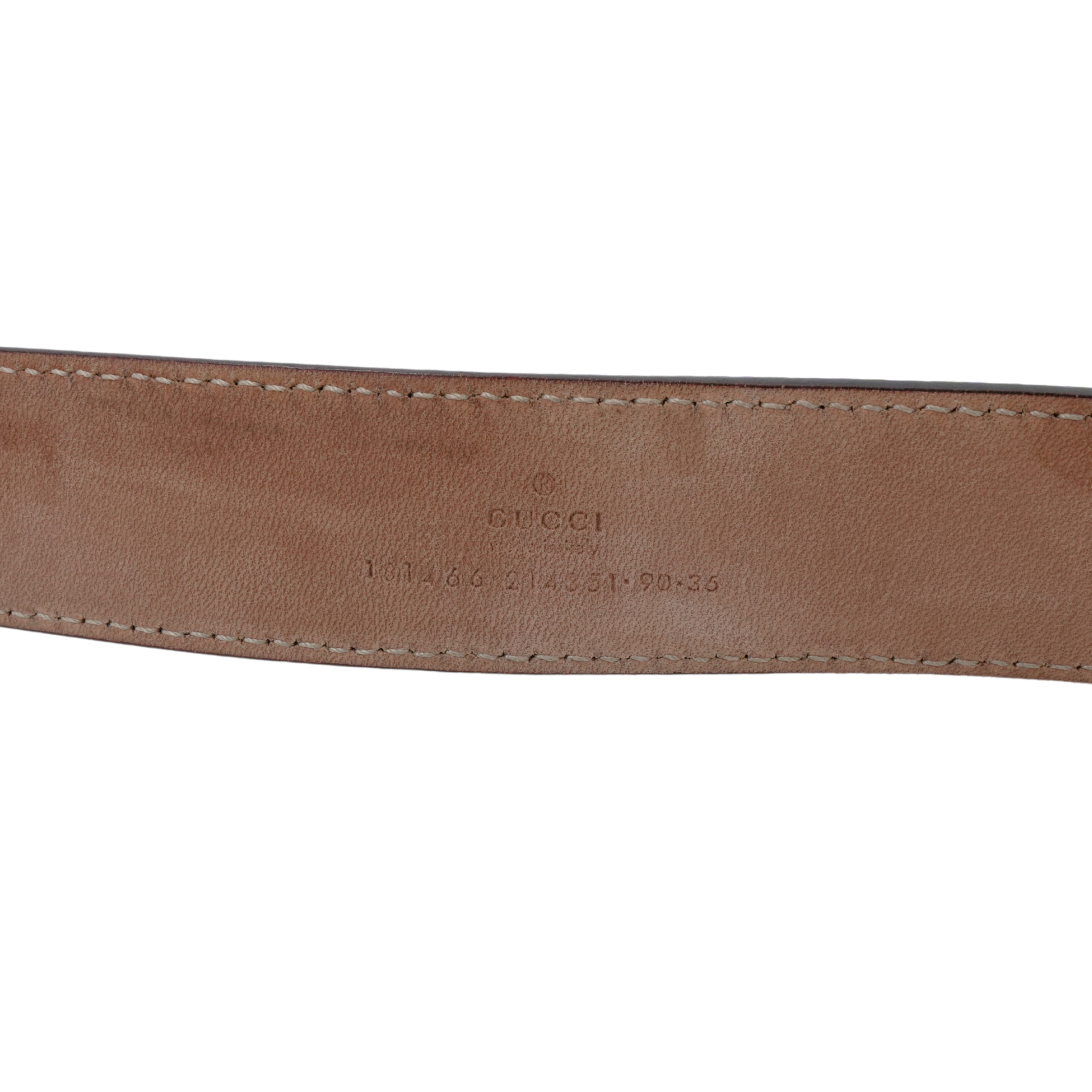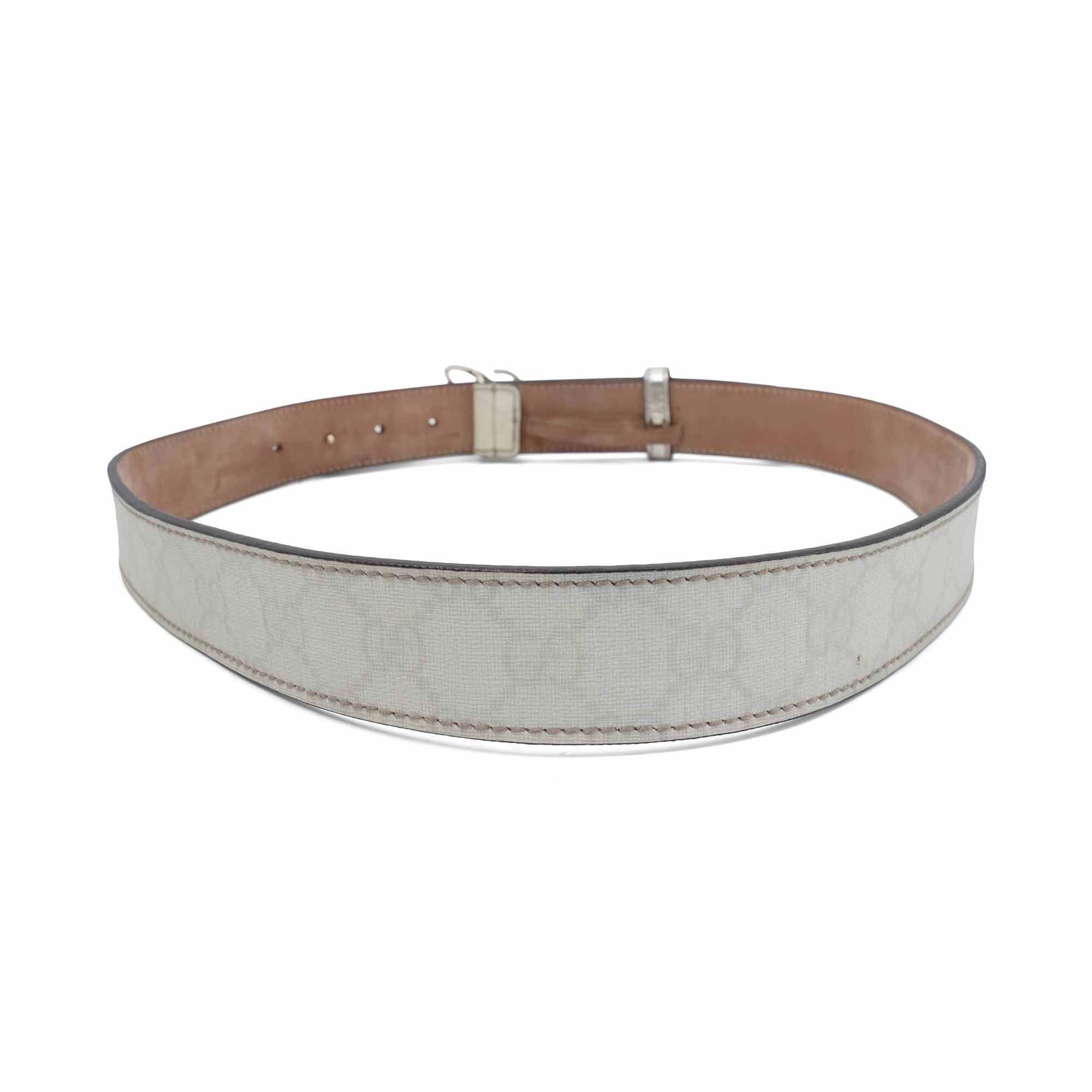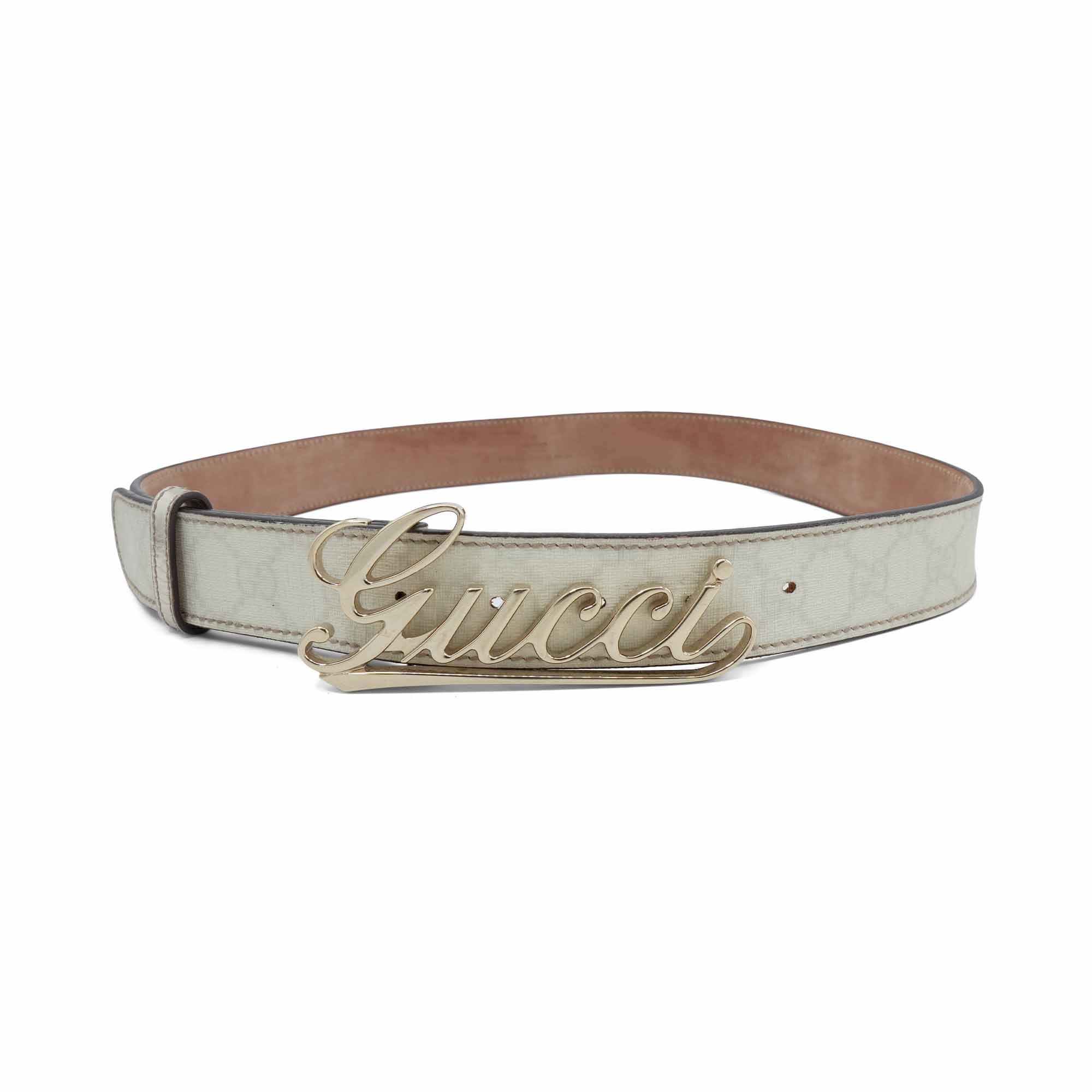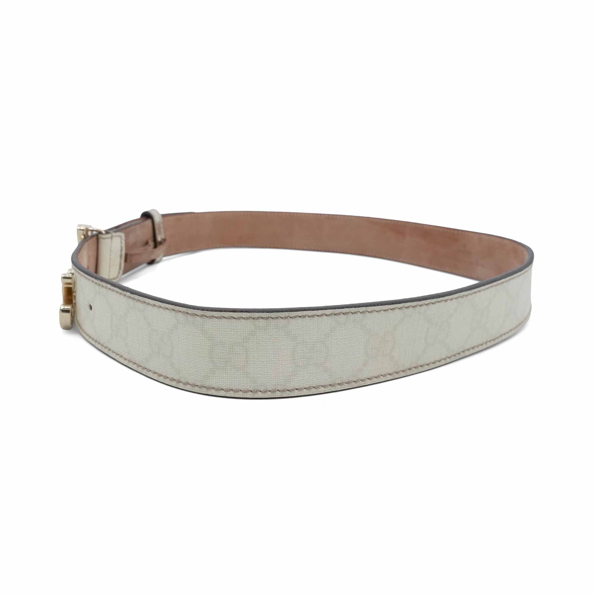 Gucci belt in cream 'GG' monogram coated canvas with a brown leather interior lining and a a soft gold cursive logo buckle.