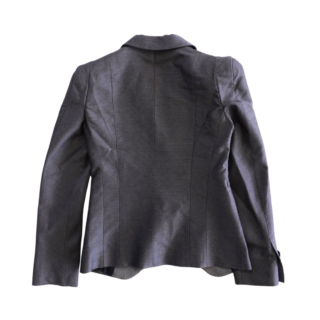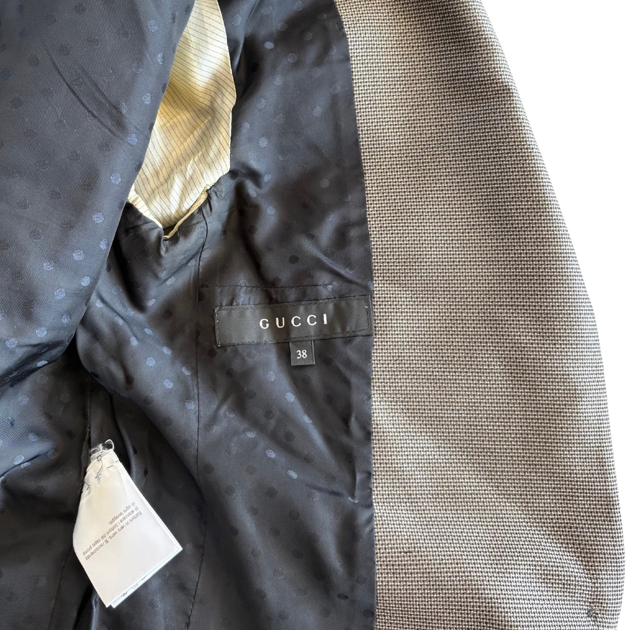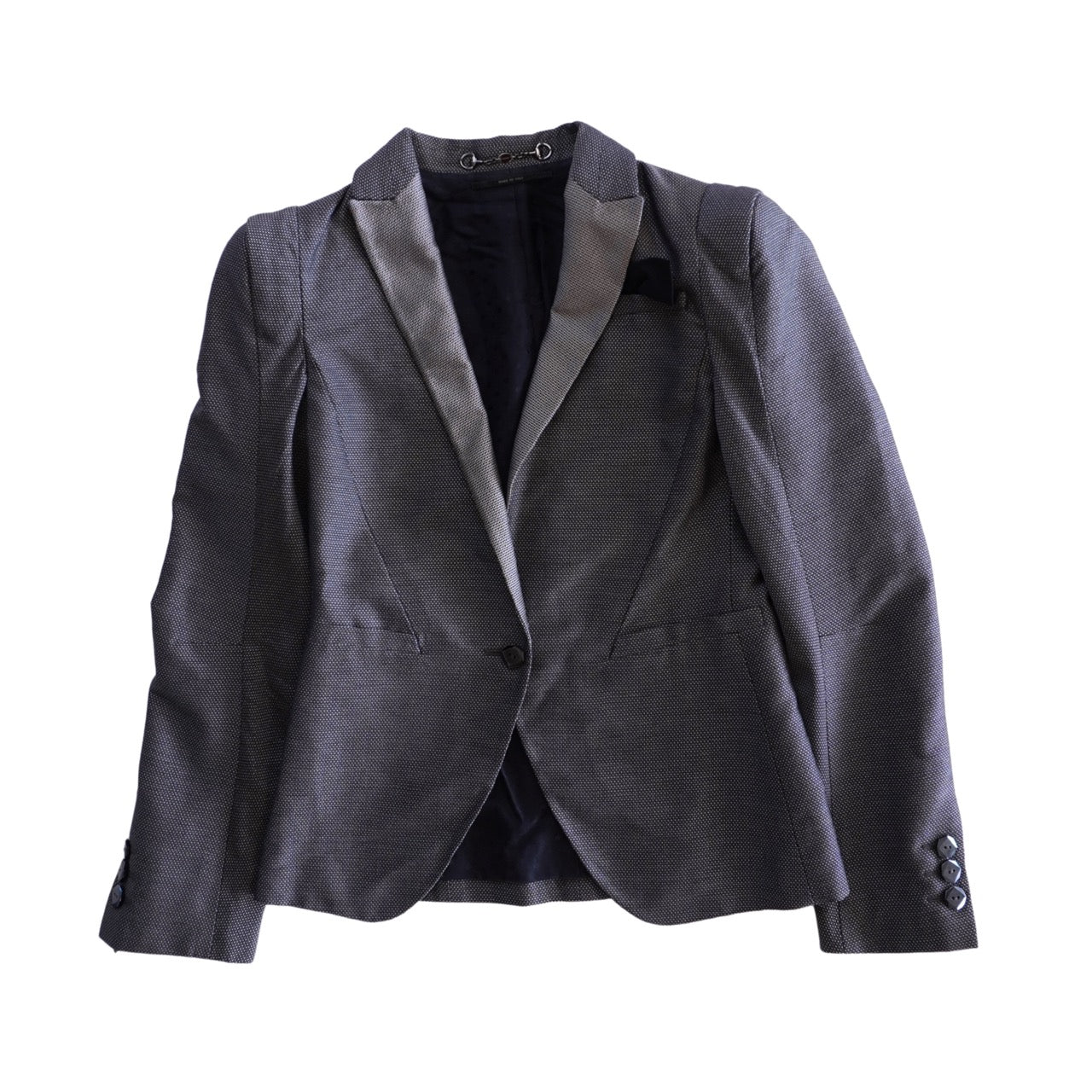 Gucci fitted blazer in grey woven wool with padded shoulders, single geometric glass button closure and curved hem. Featuring a silk handkerchief on the chest and two faux slip pockets on the front.