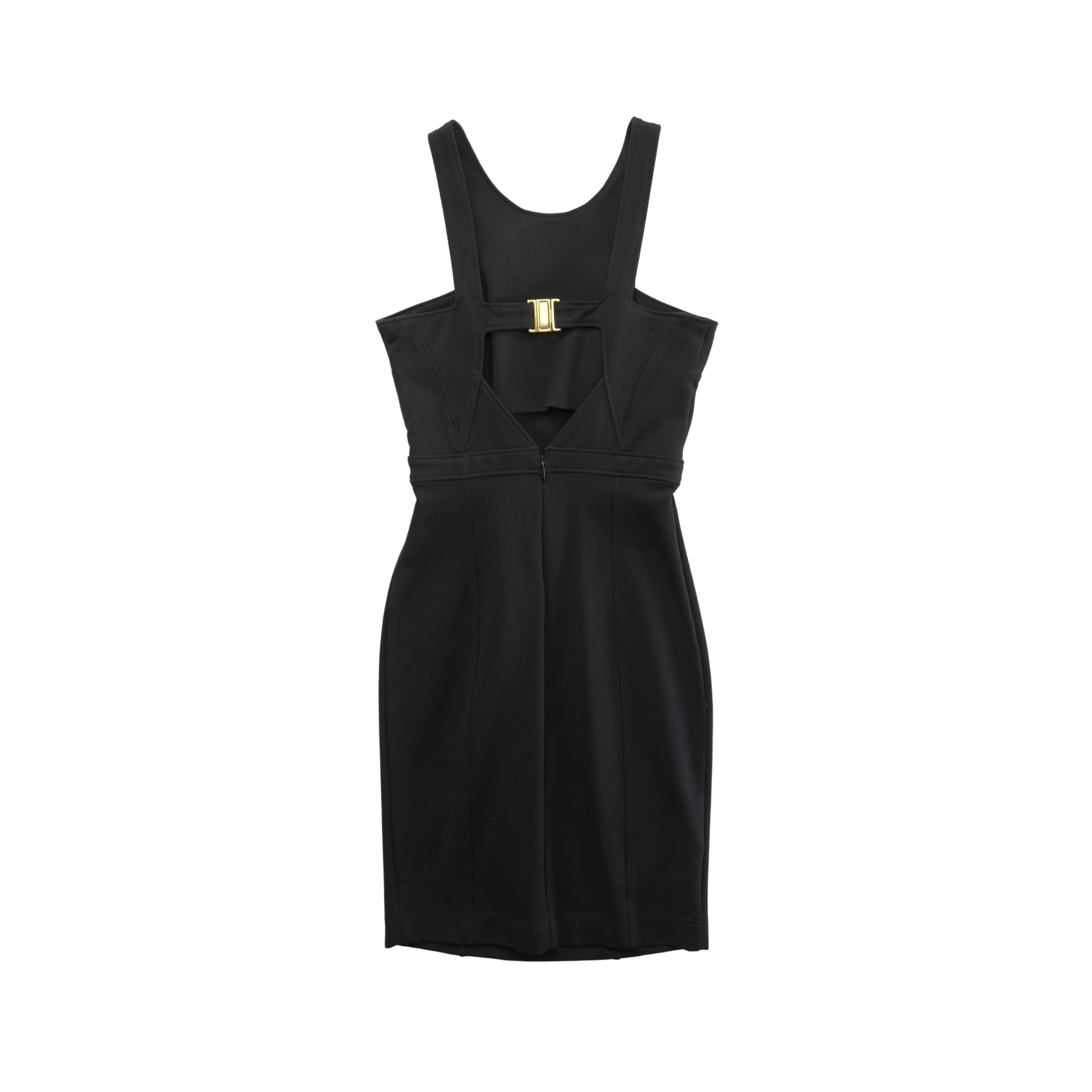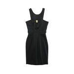 Gucci fitted knee-length dress in black stretch viscose with a halter style neckline and a gold buckle detail at the back.