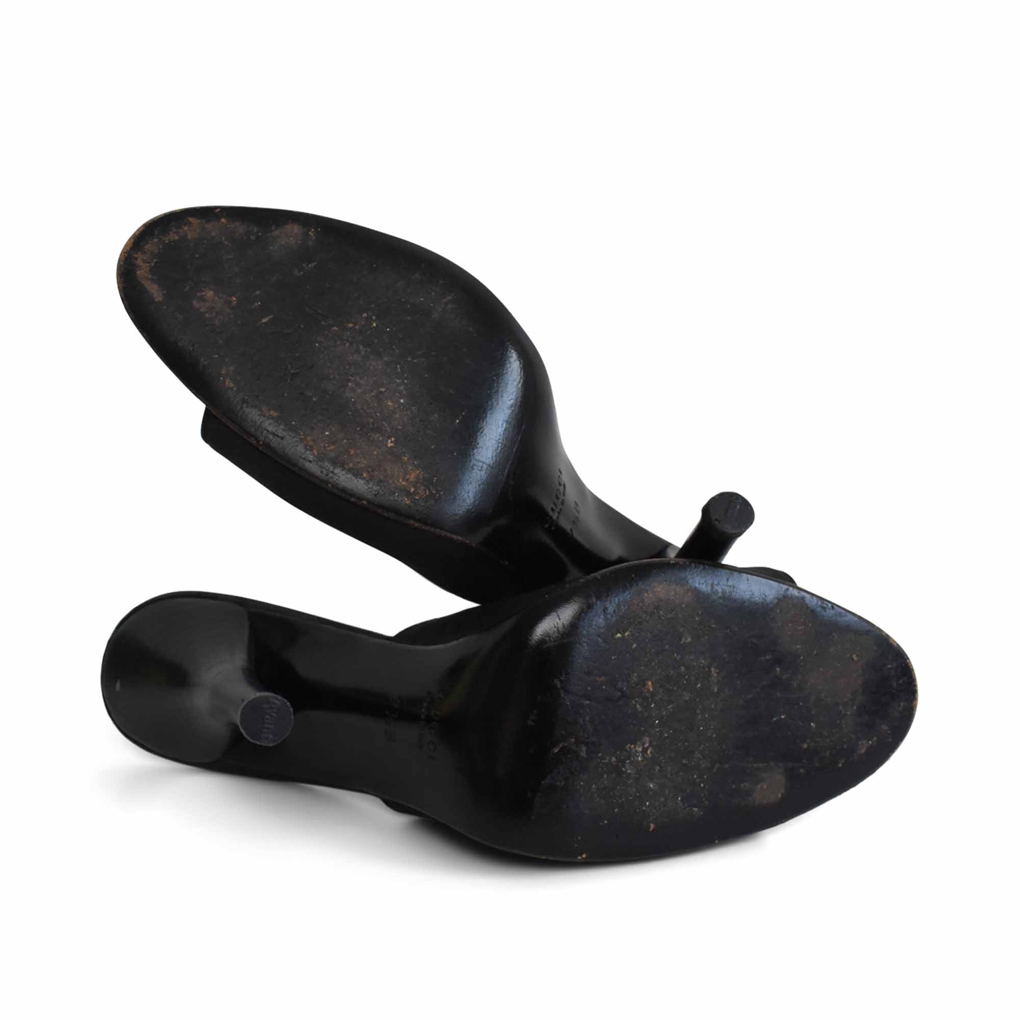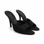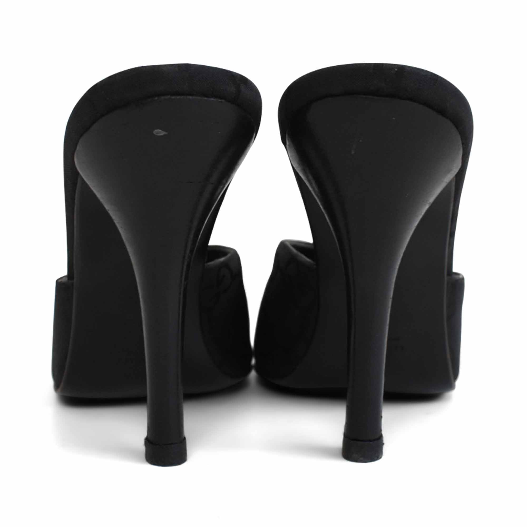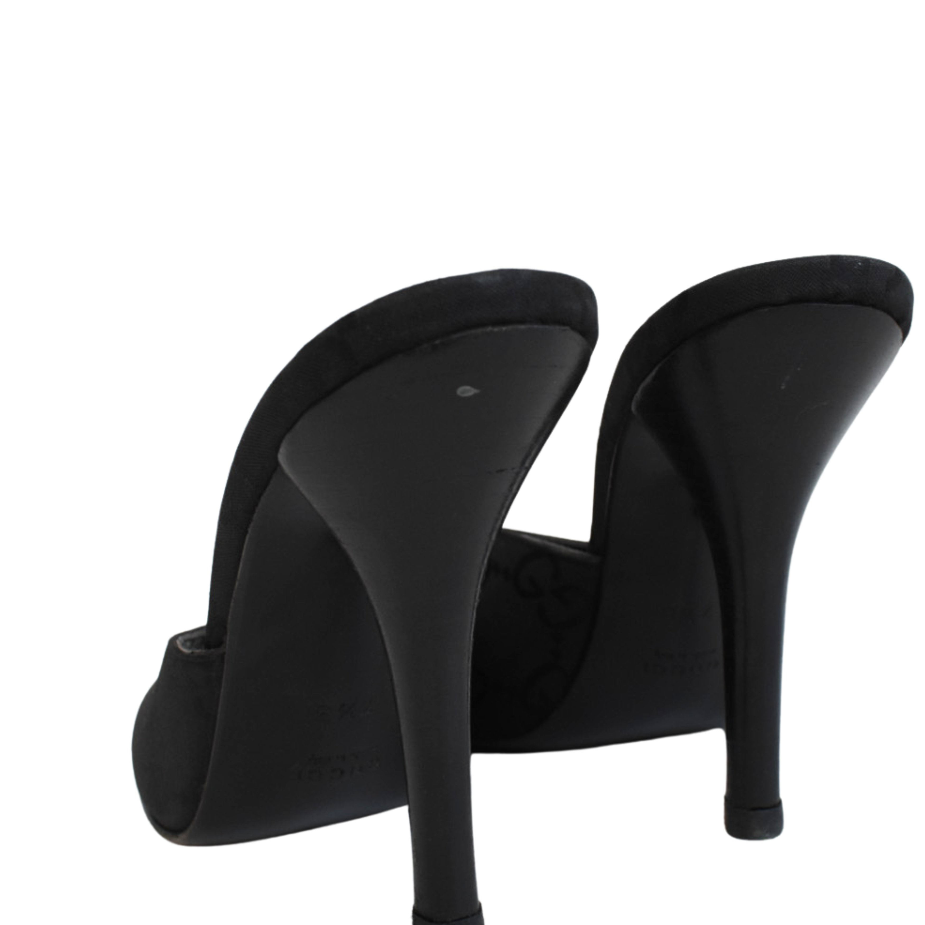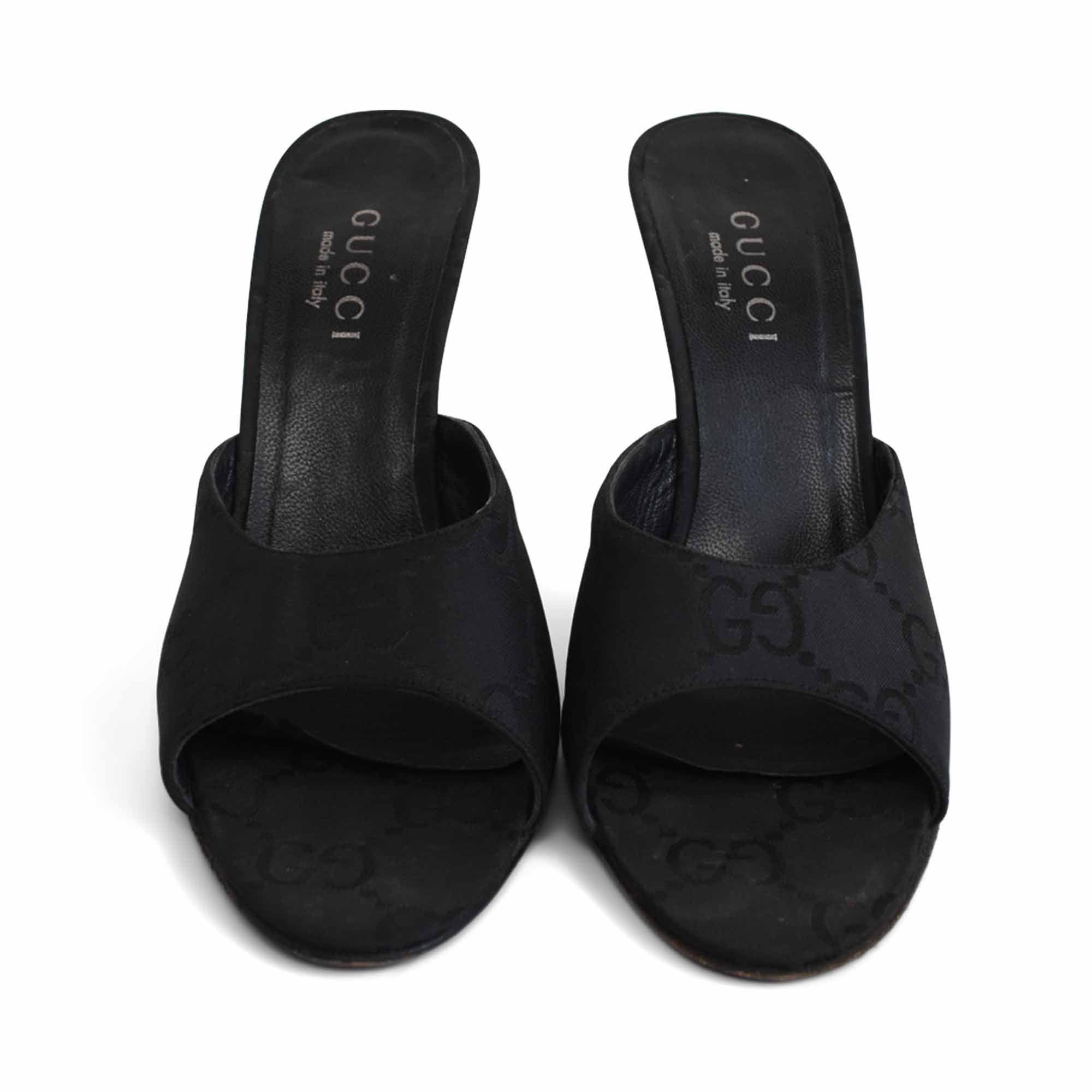 Gucci heeled mules in black monogram jacquard nylon with stacked wood heels.