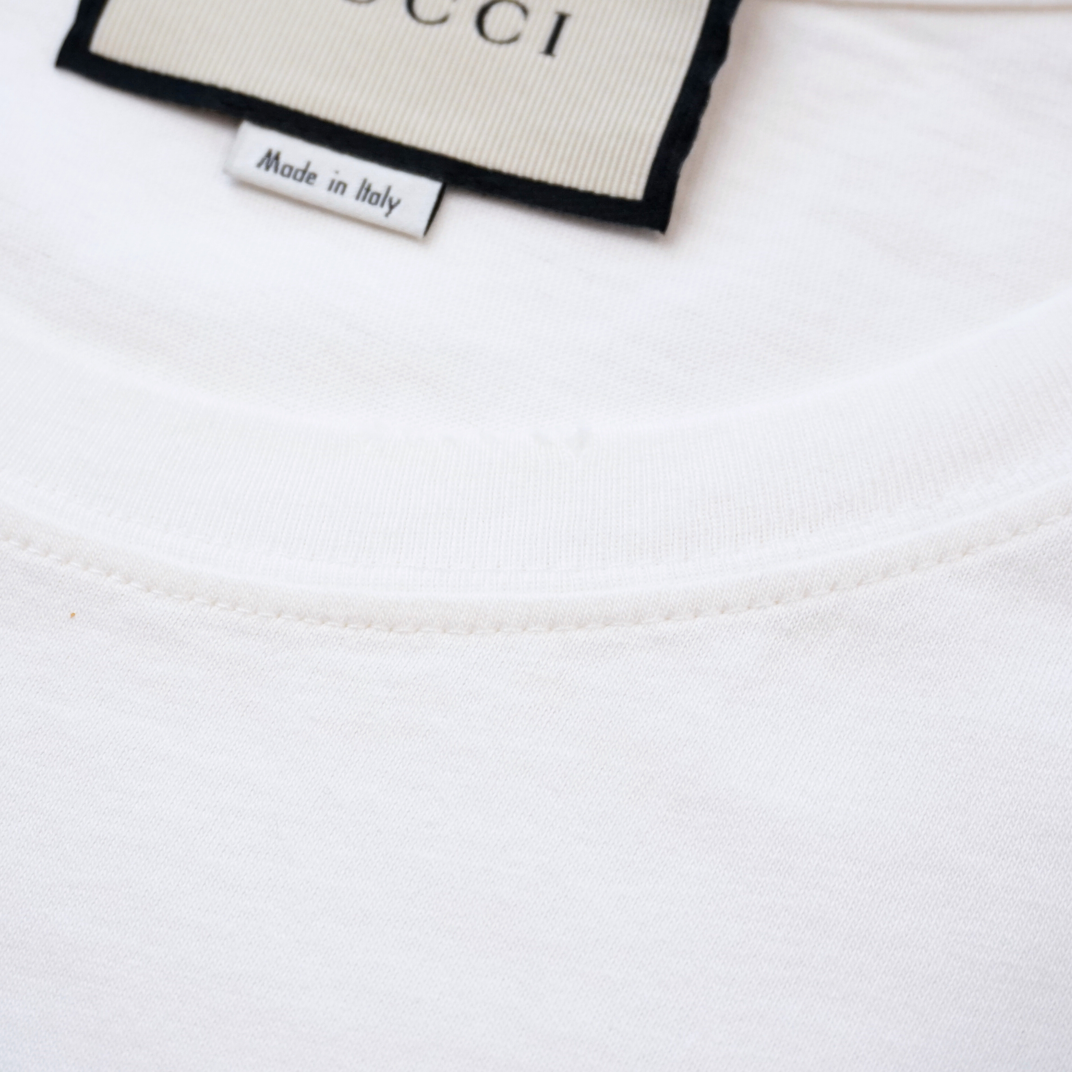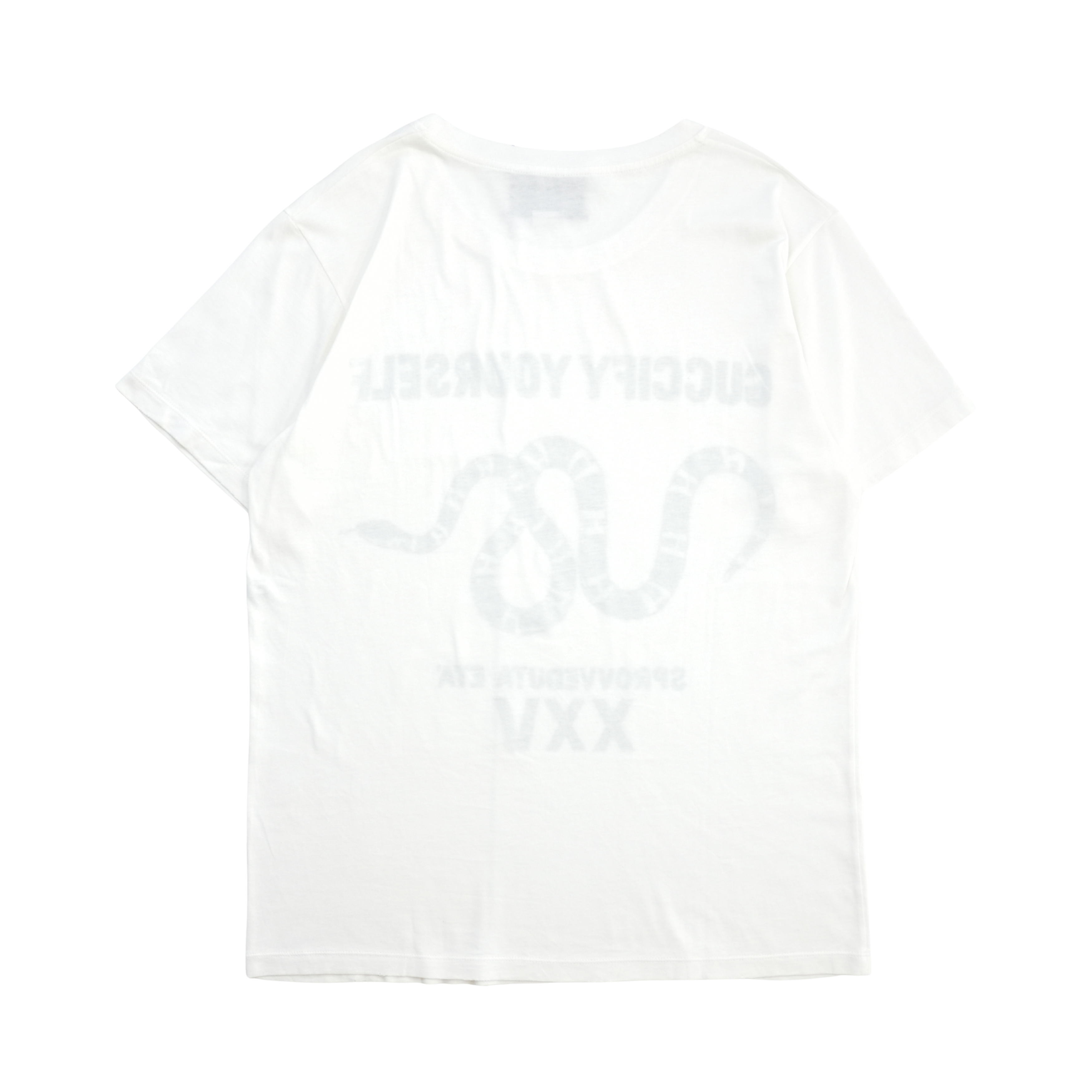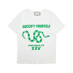 Gucci white t-shirt with green 'GUCCIFY YOURSELF' and king snake graphic on the chest.