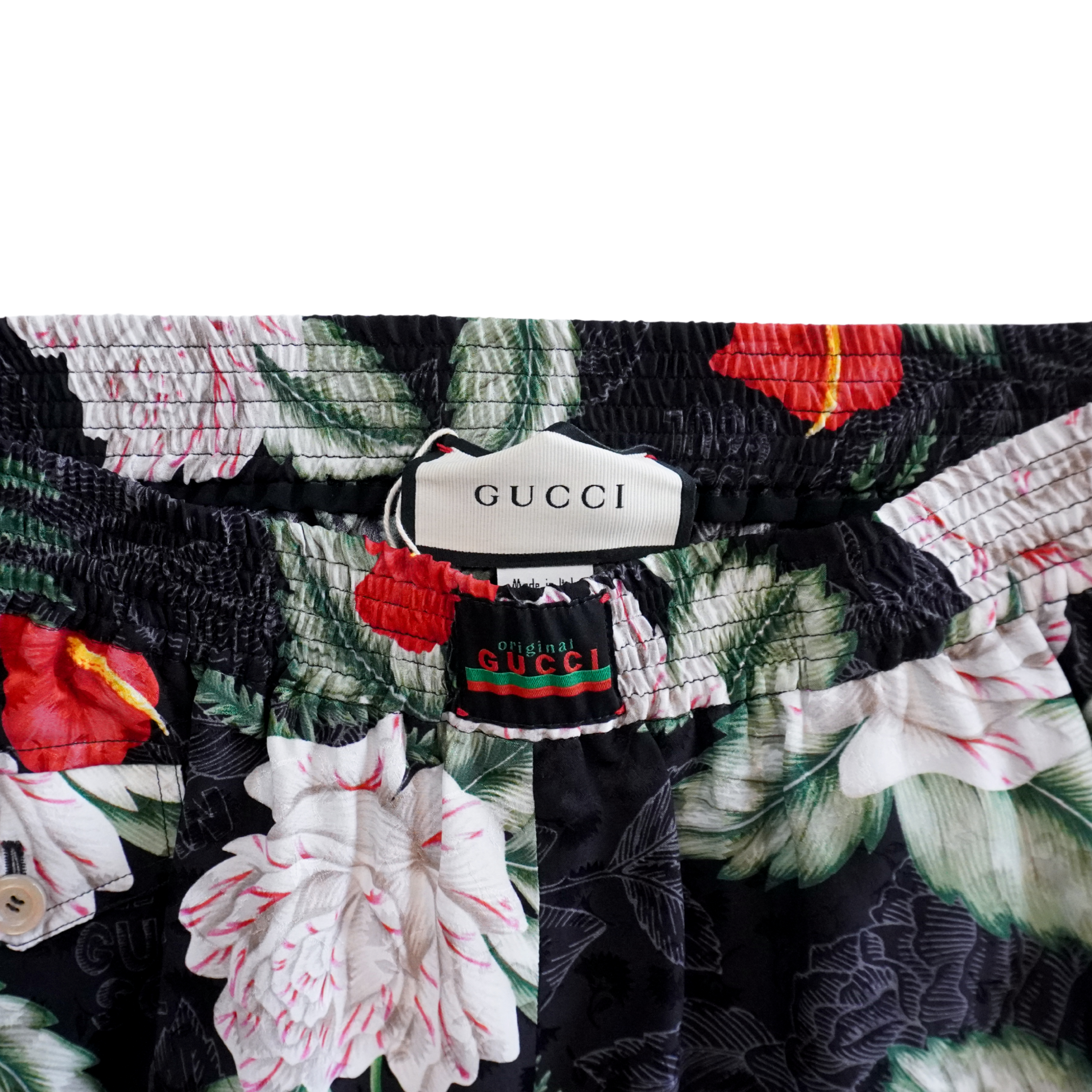 Gucci 'Hawaiian Dream' shorts in black silk with an all-over green, white and red tropical floral print, an elastic drawstring waistband, a side flap pocket, and a black logo patch at the centre waist.