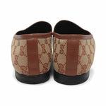 Gucci 'Jordaan' loafer in tan canvas with monogram GG all over print. Features gold horsebit detail and leather trim.