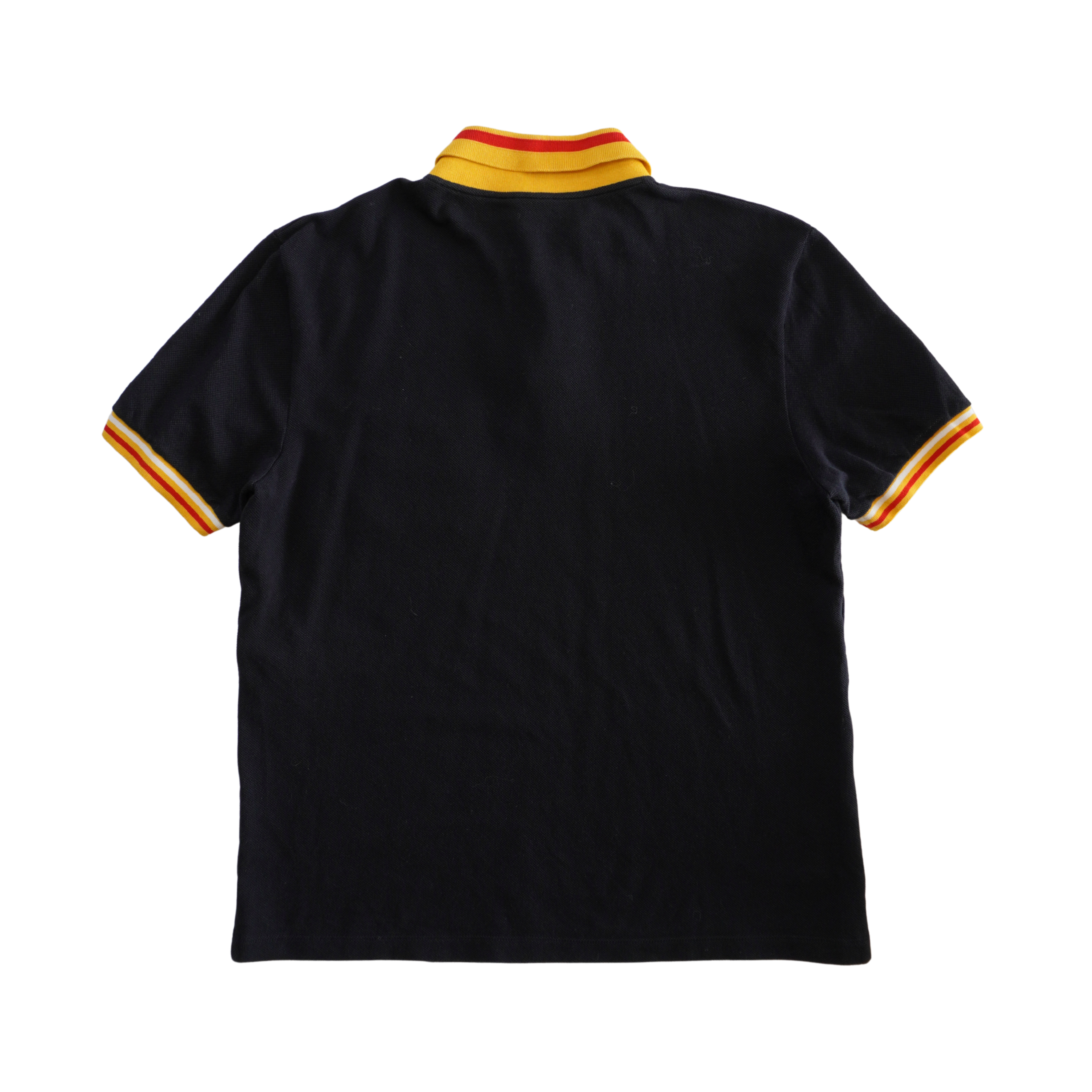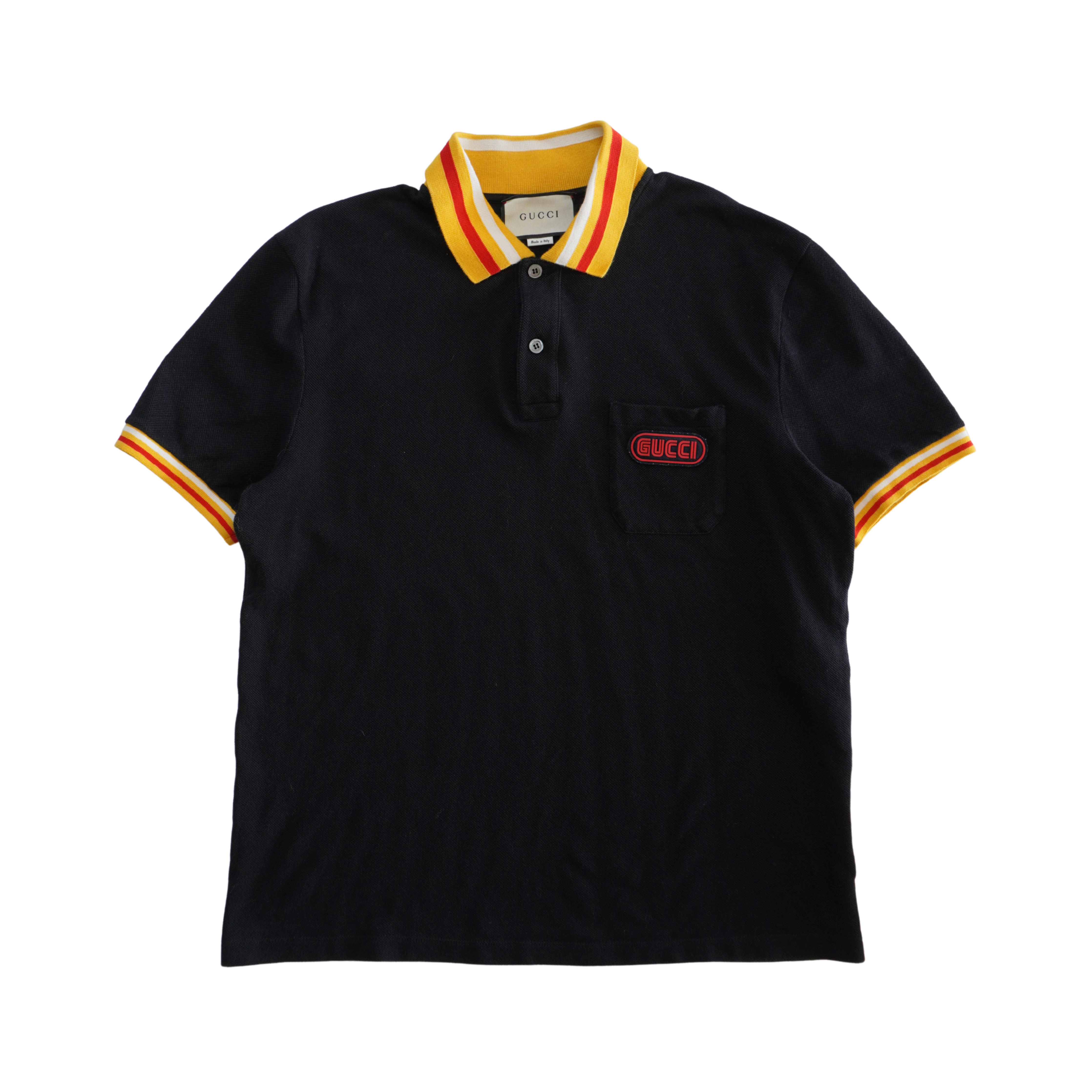 Gucci black polo shirt with a red rubberized logo patch on the chest and yellow, white, and red striped cuffs and collar.