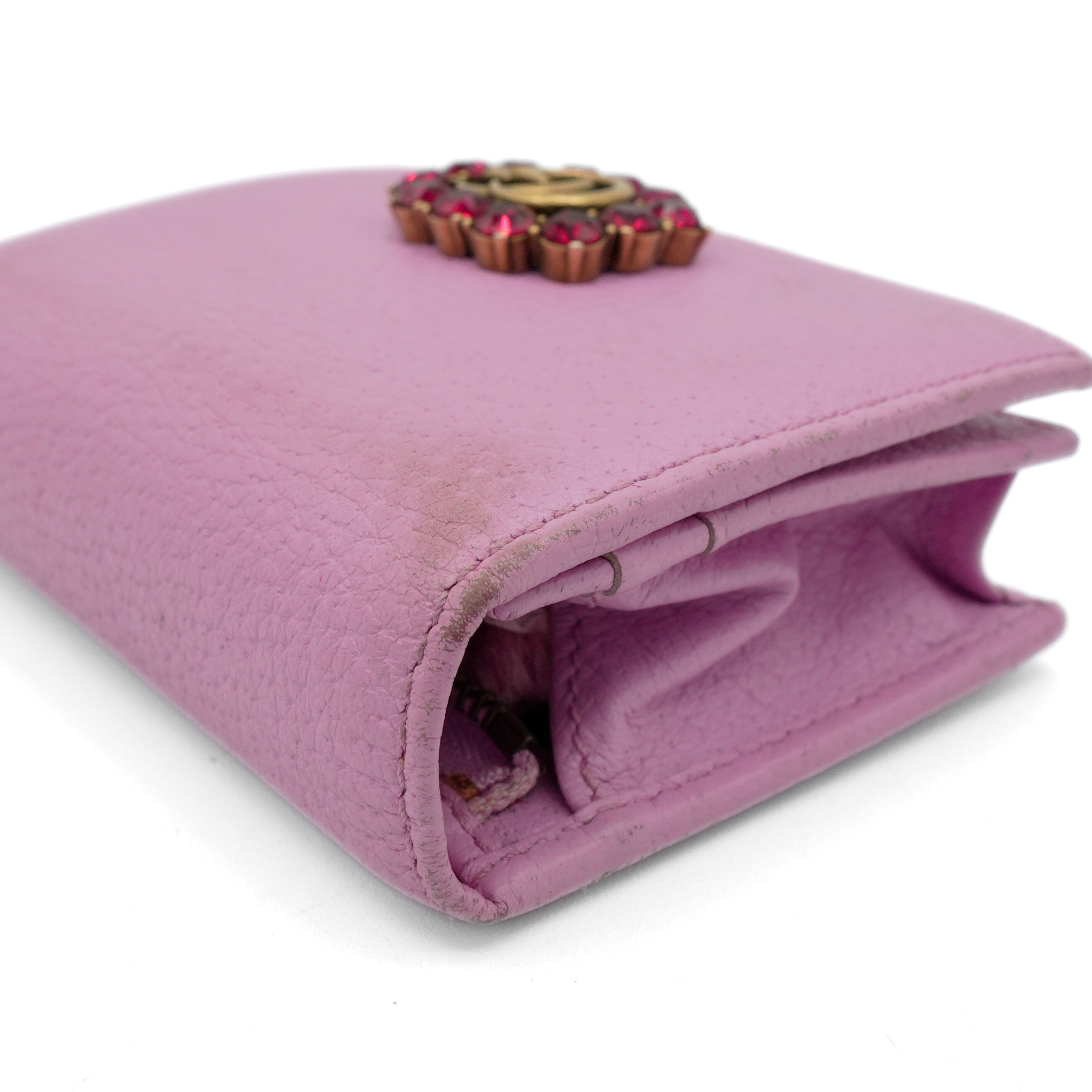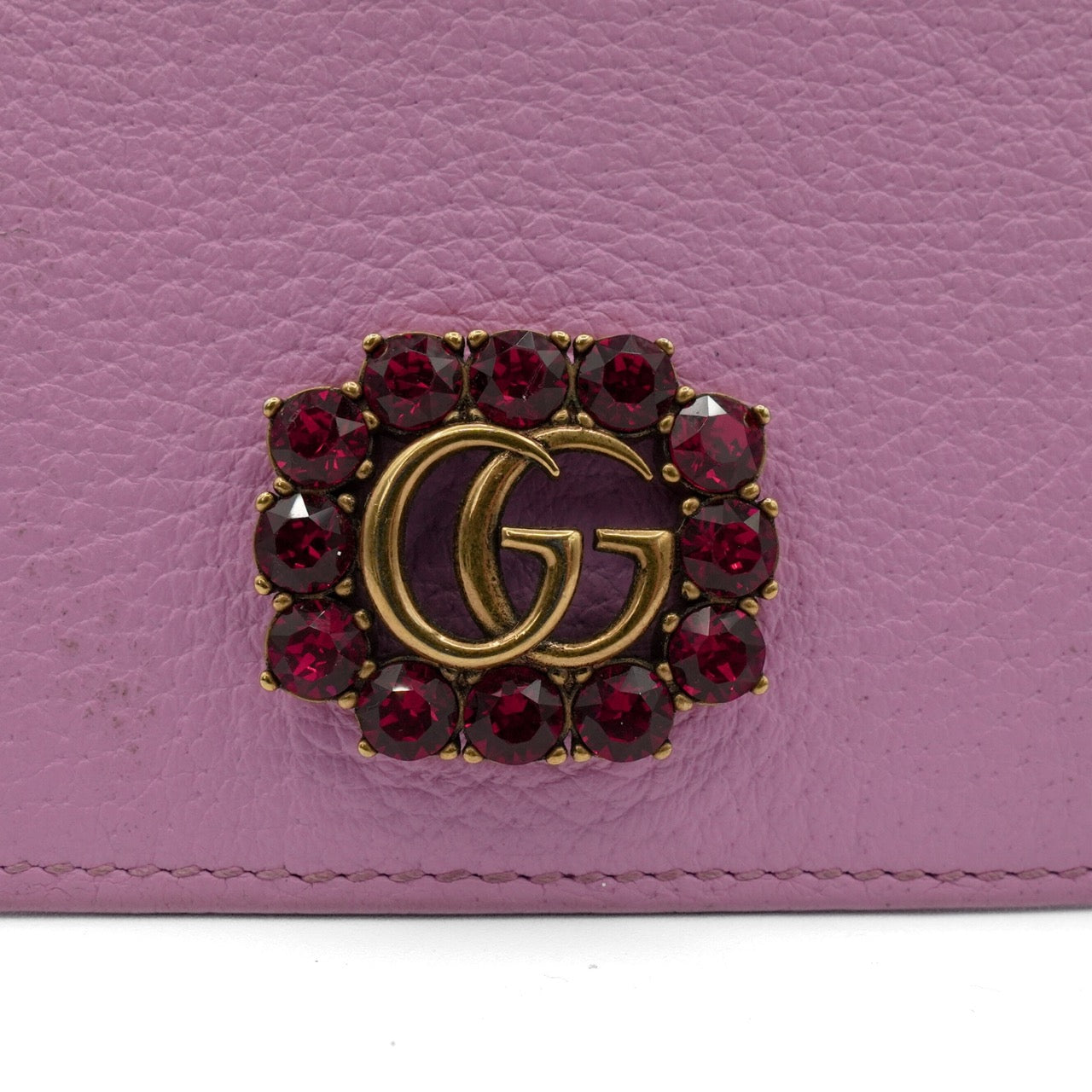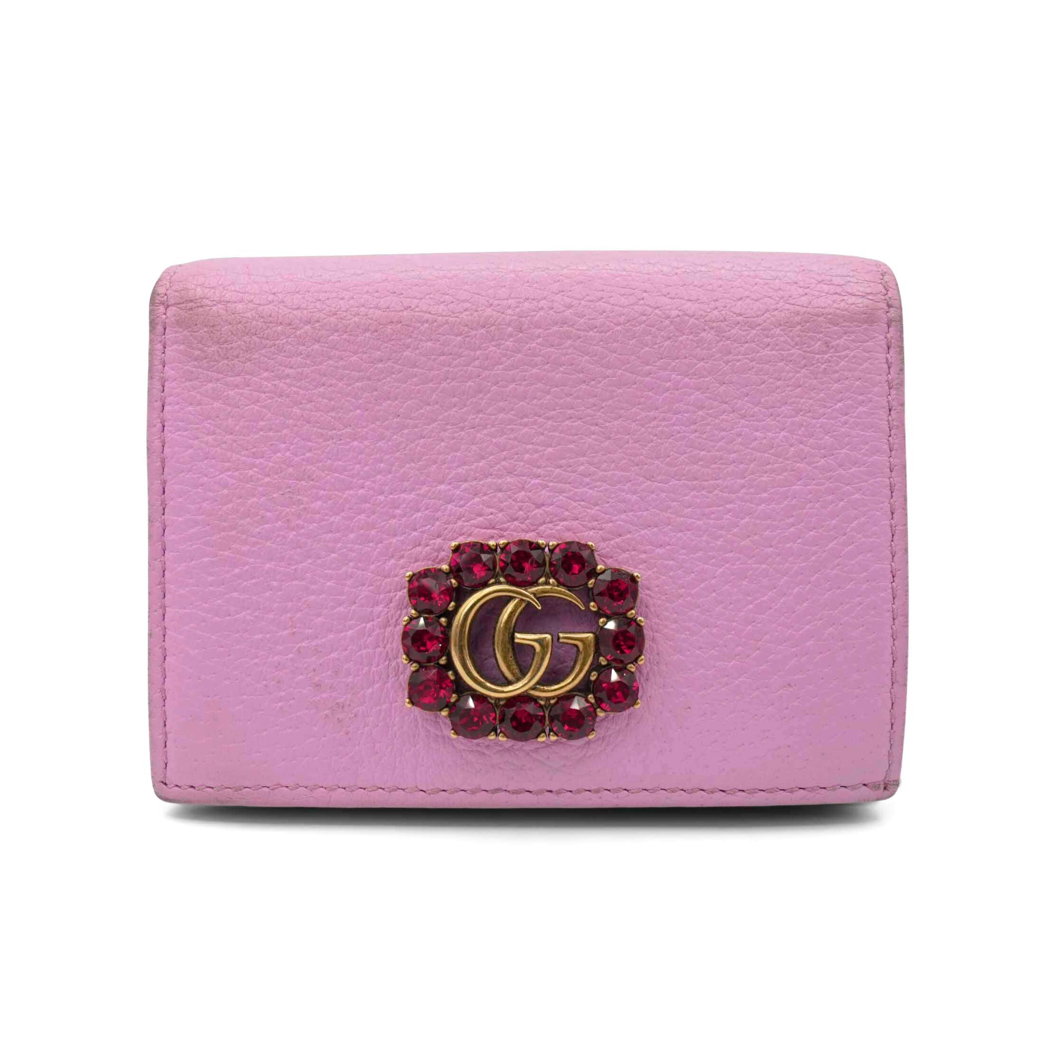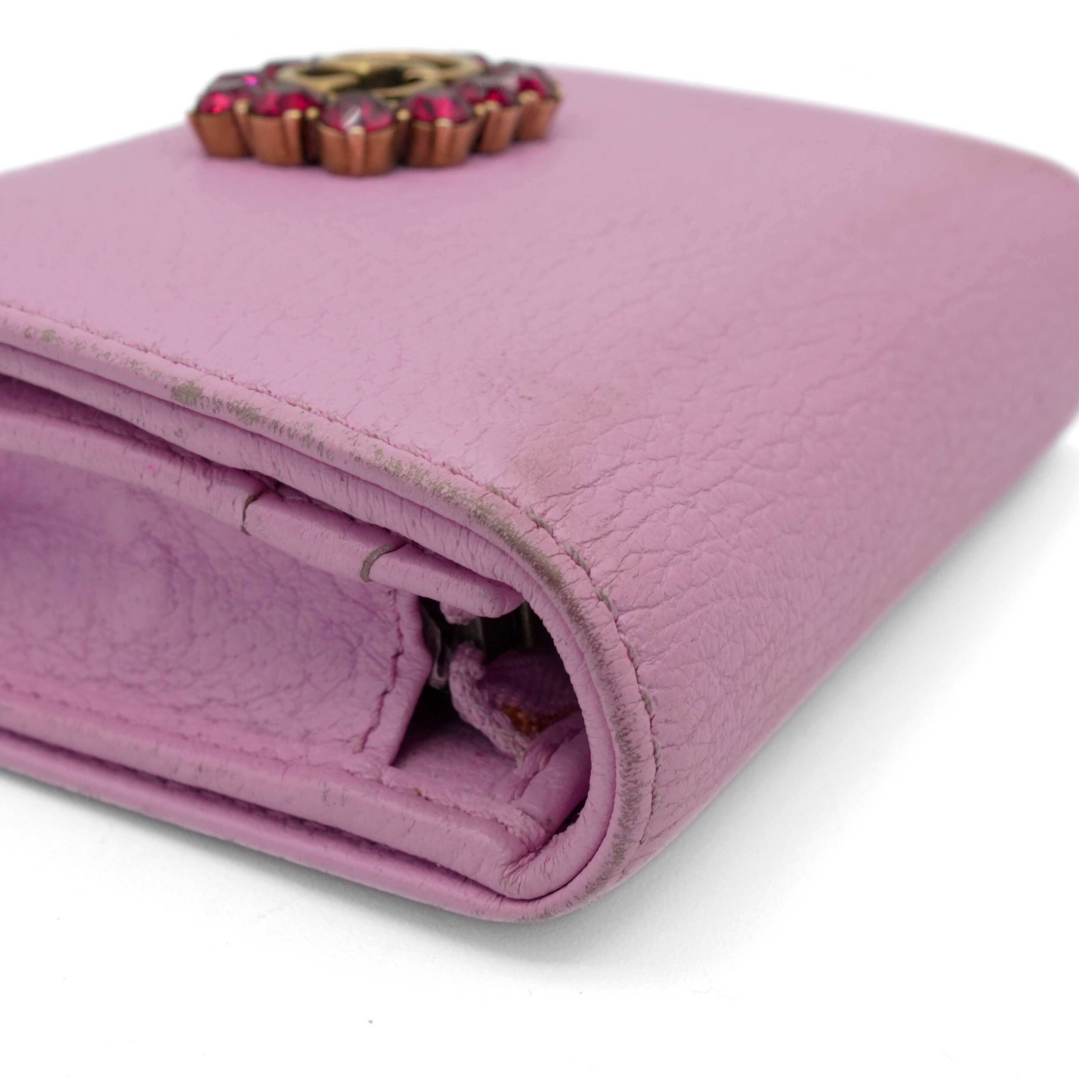 Gucci bi-fold wallet in bijou pink leather with a brushed gold 'Marmont' logo with red rhinestone trim and a snap button closure. Featuring 5 card slots, cash compartment and zip coin pocket.