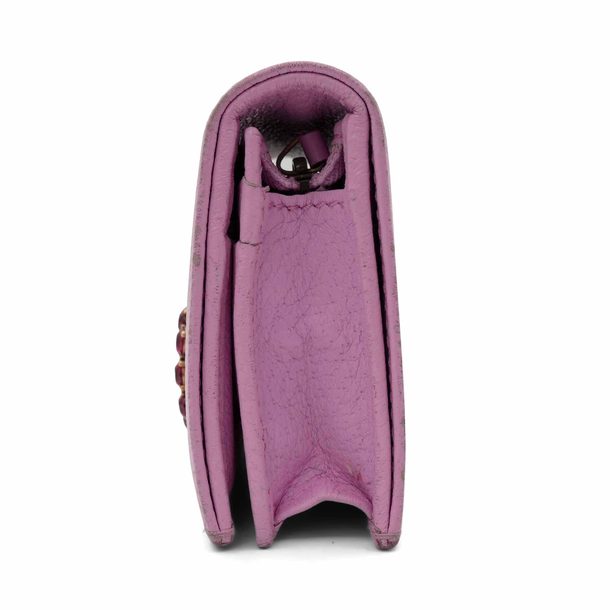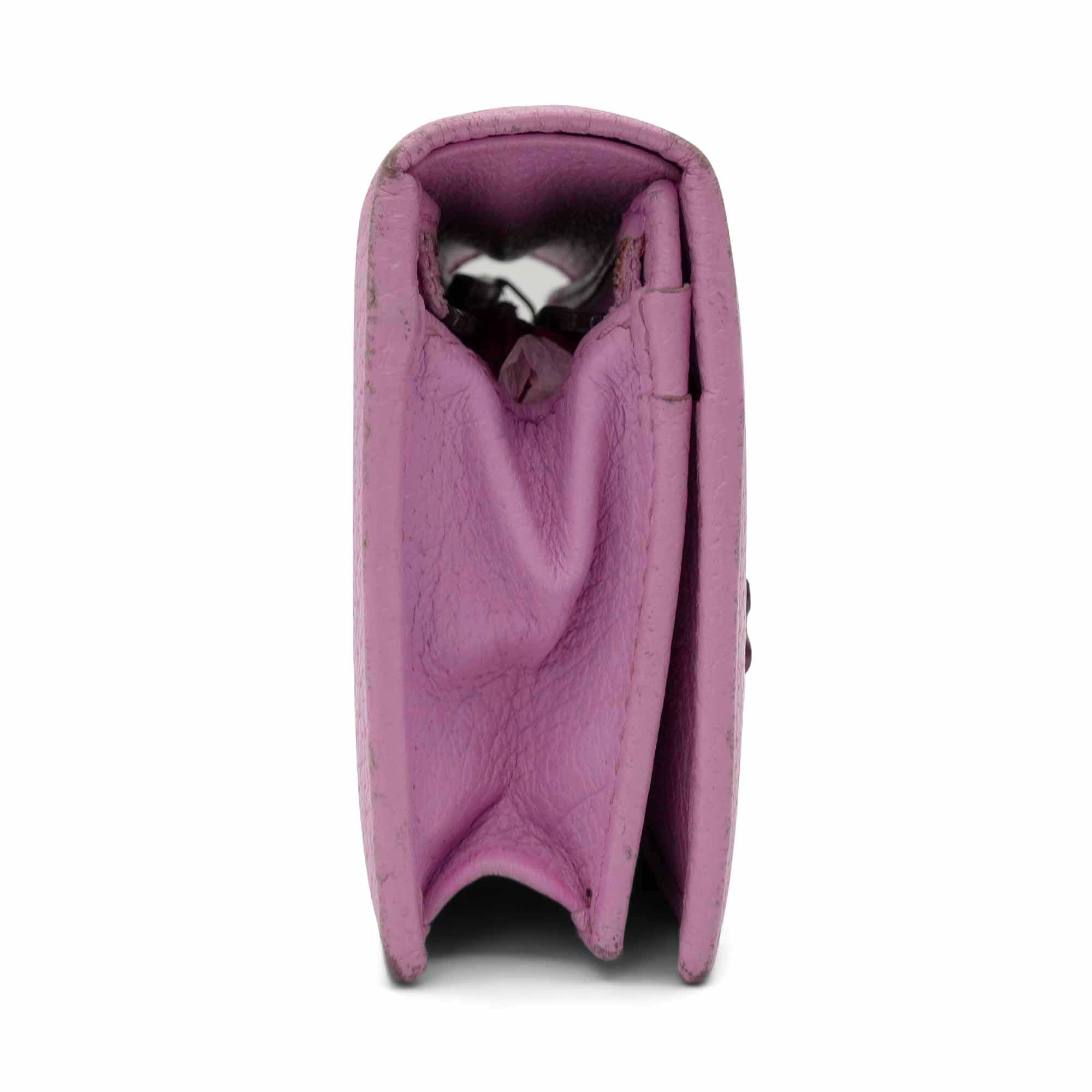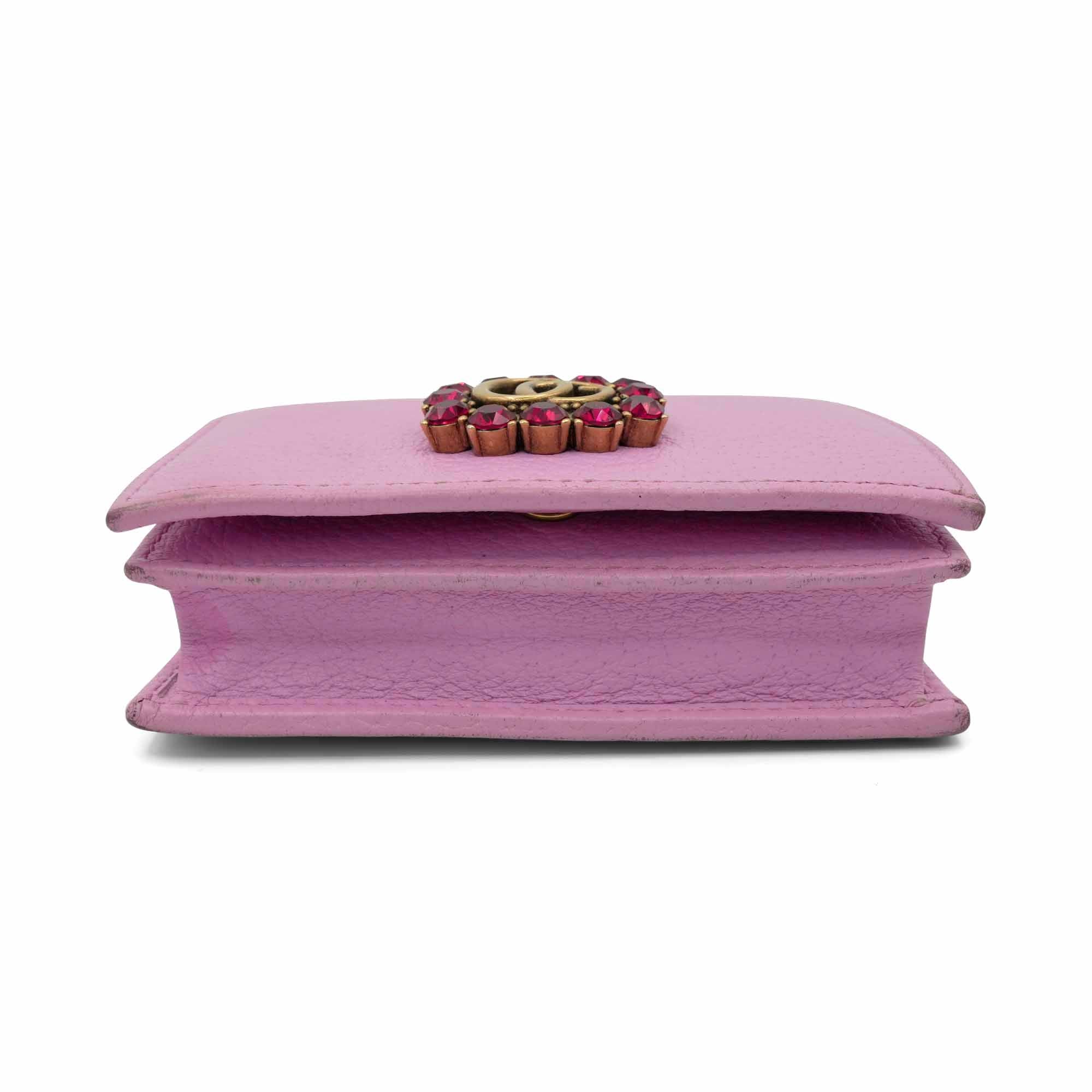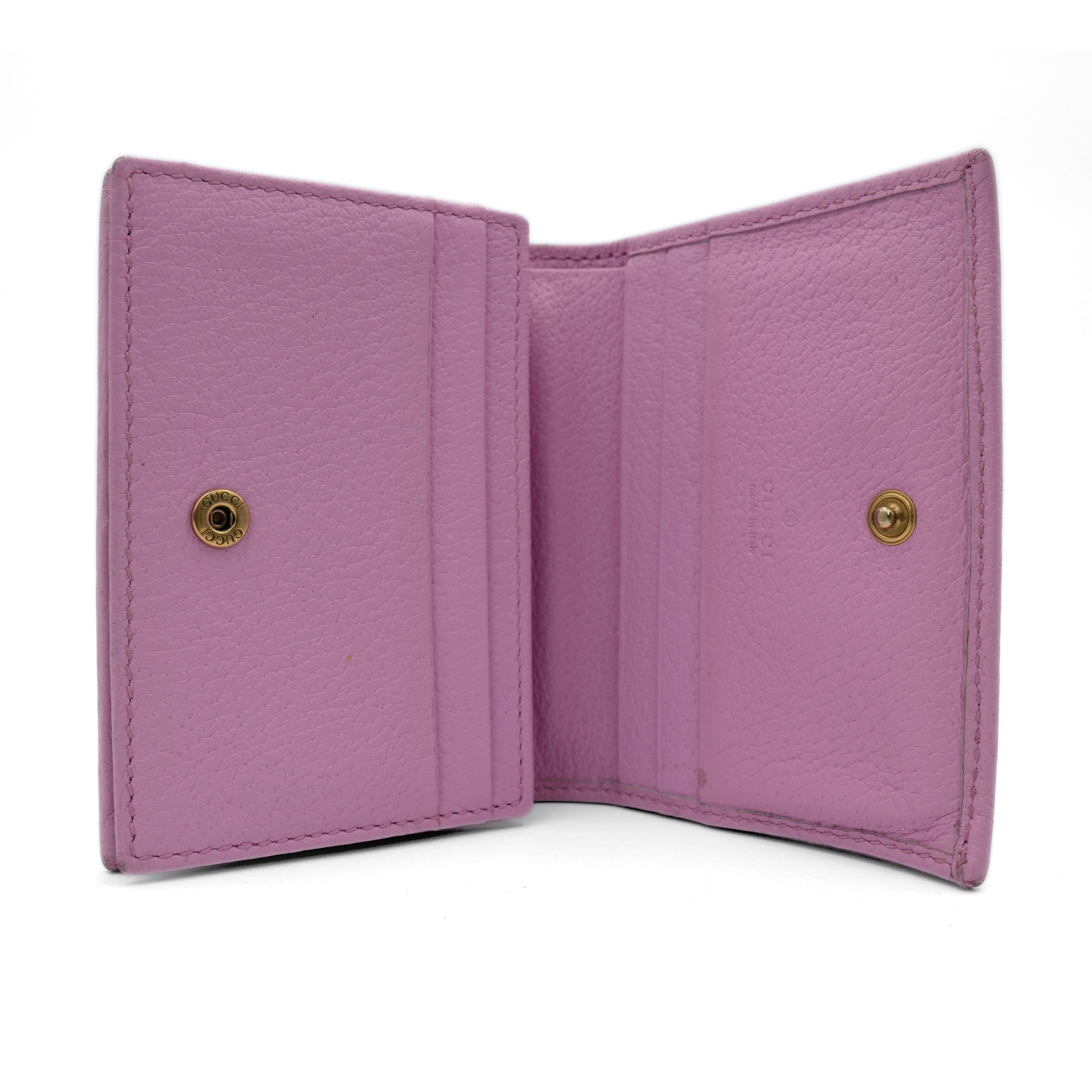 Gucci bi-fold wallet in bijou pink leather with a brushed gold 'Marmont' logo with red rhinestone trim and a snap button closure. Featuring 5 card slots, cash compartment and zip coin pocket.