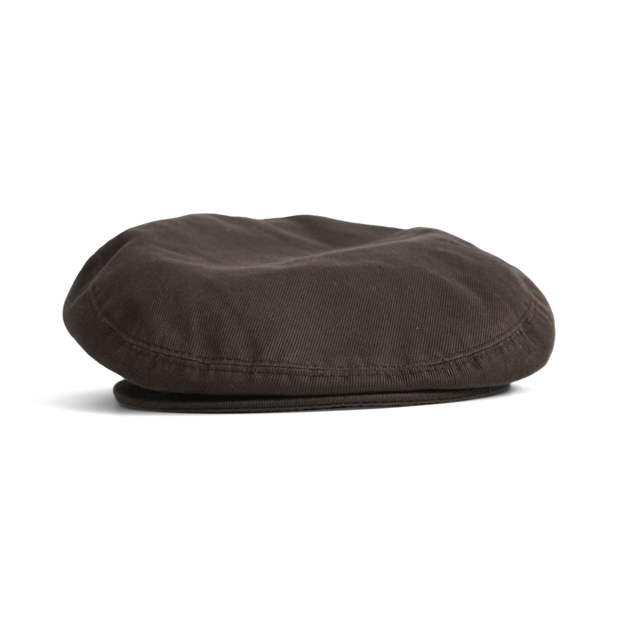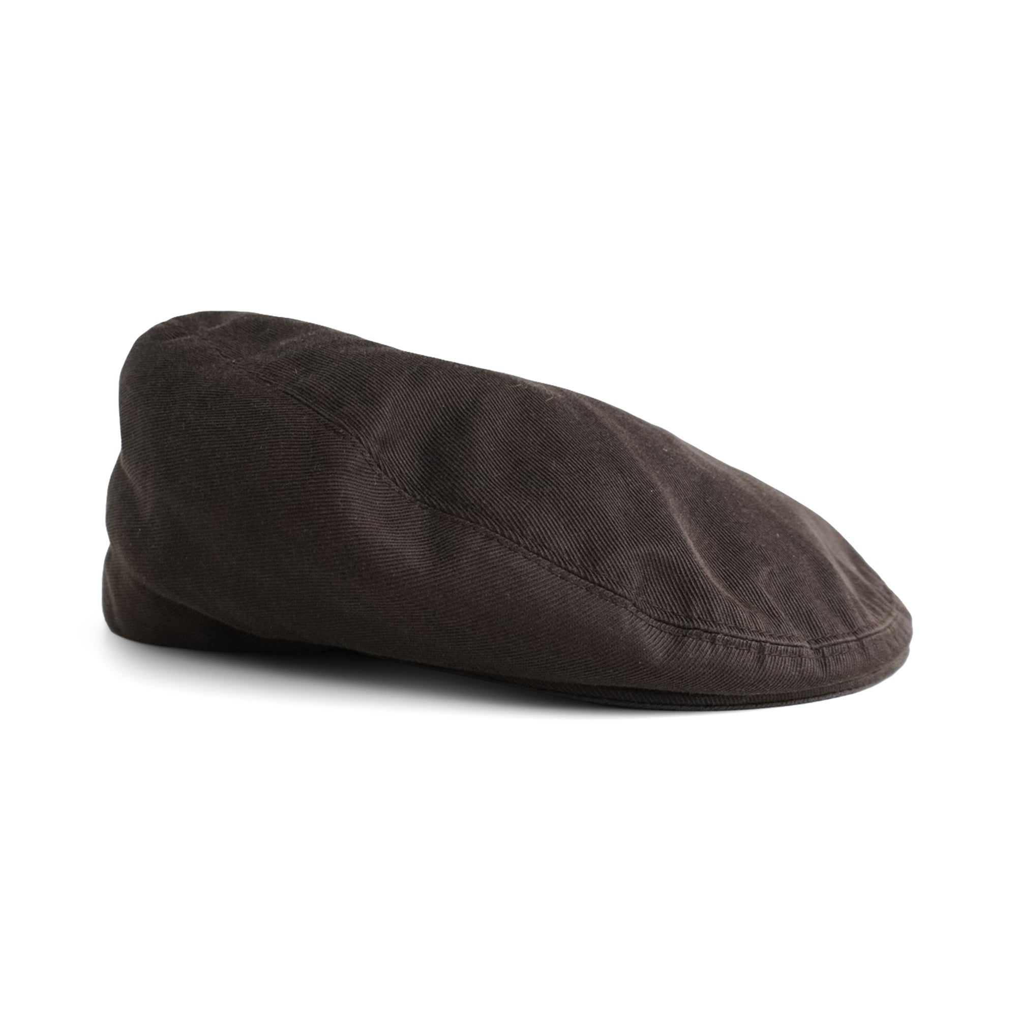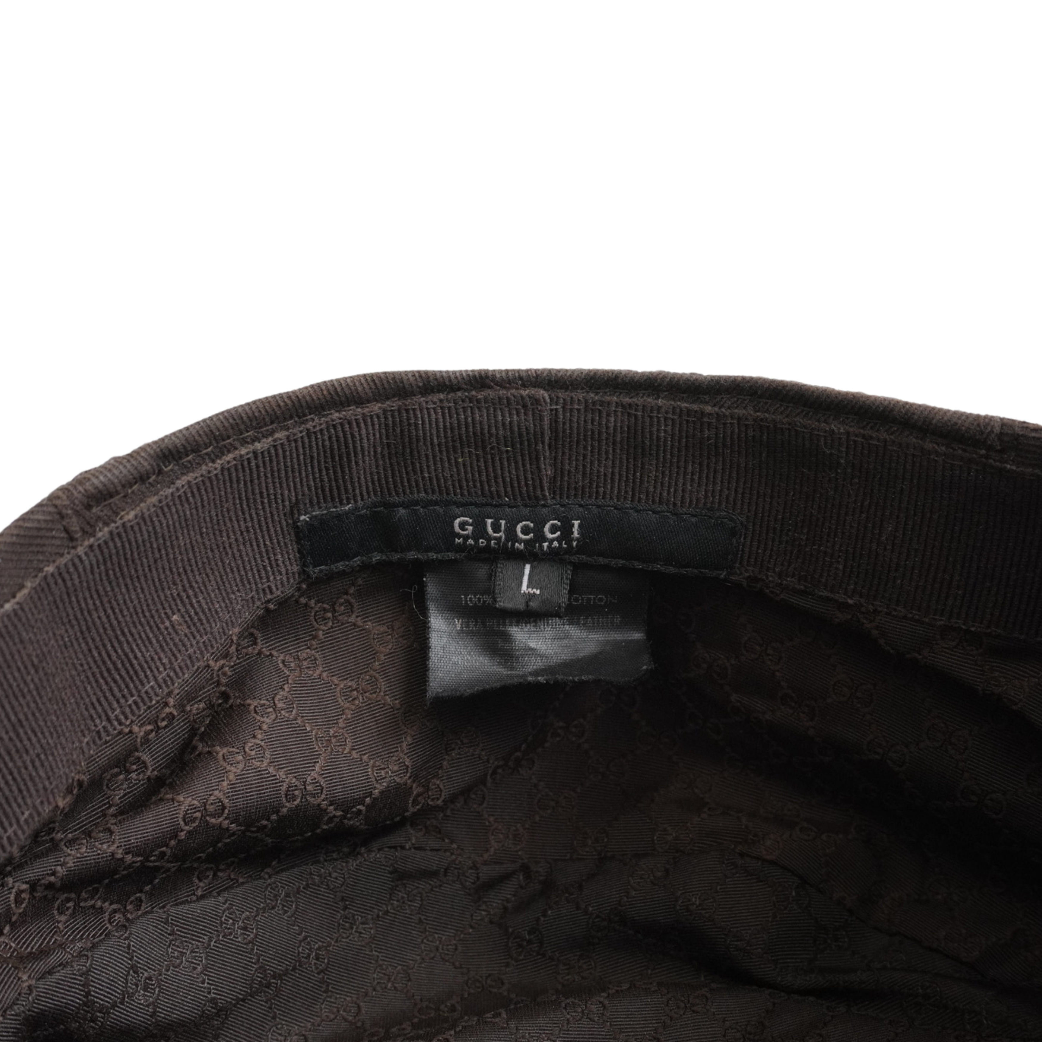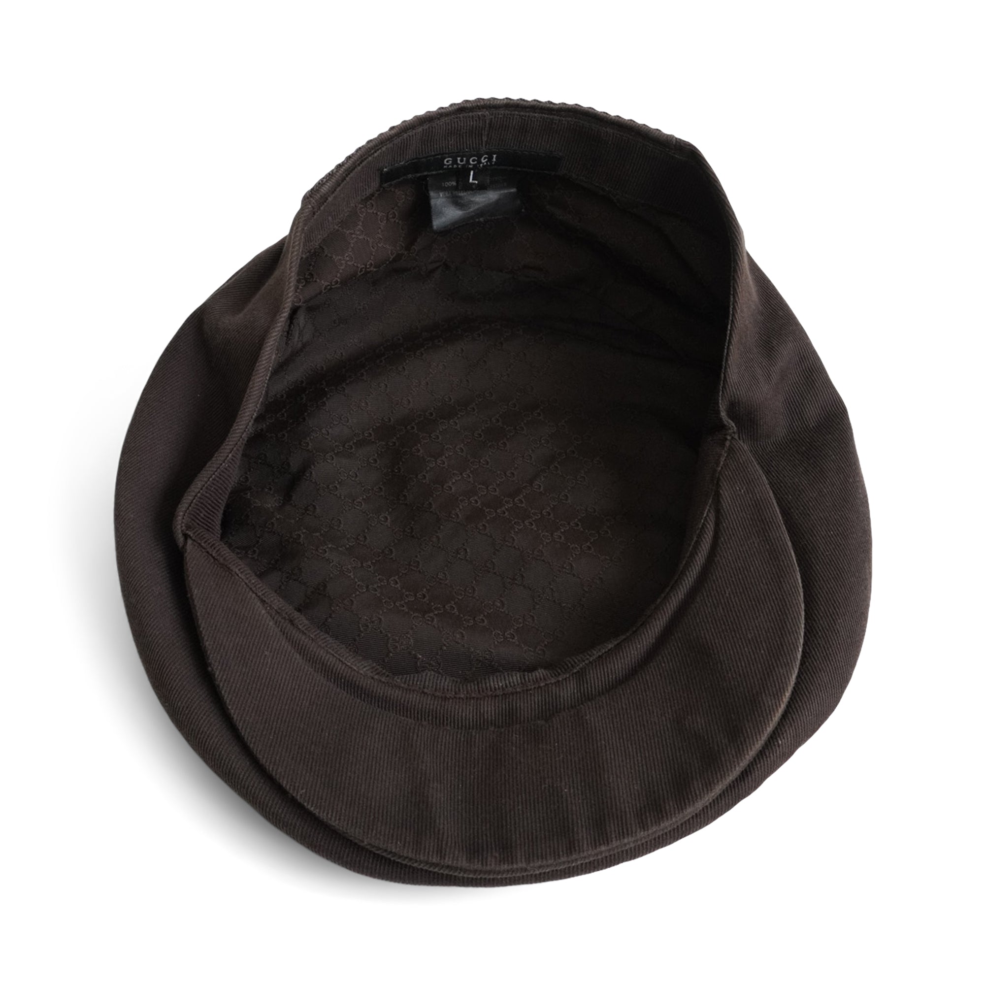 Gucci paper boy cap in cool brown cotton with a taupe and gold canvas racing stripe on the back and dual snap buttons on the brim.