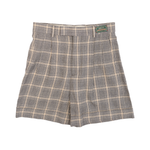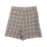 Gucci shorts in tonal beige and navy plaid with pleated front, four pocket styling, tortoise buttons and gucci logo patch.