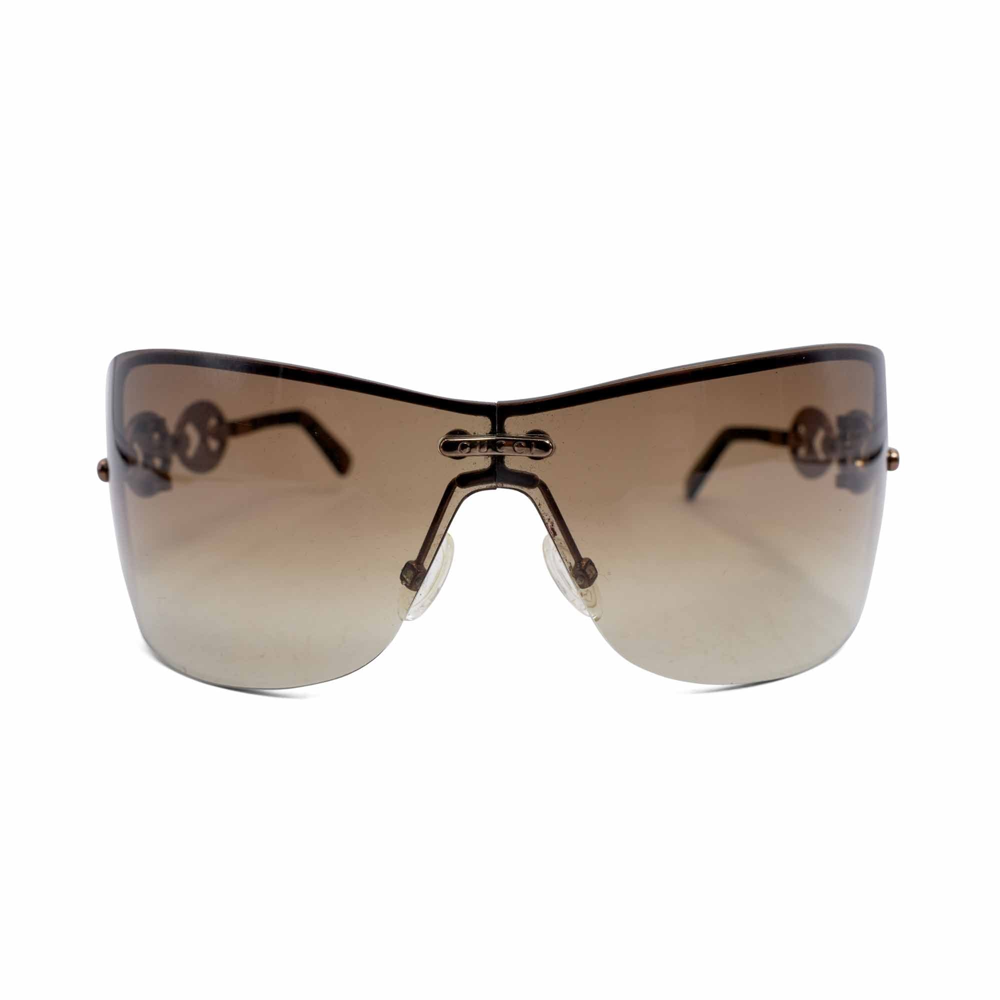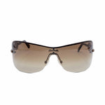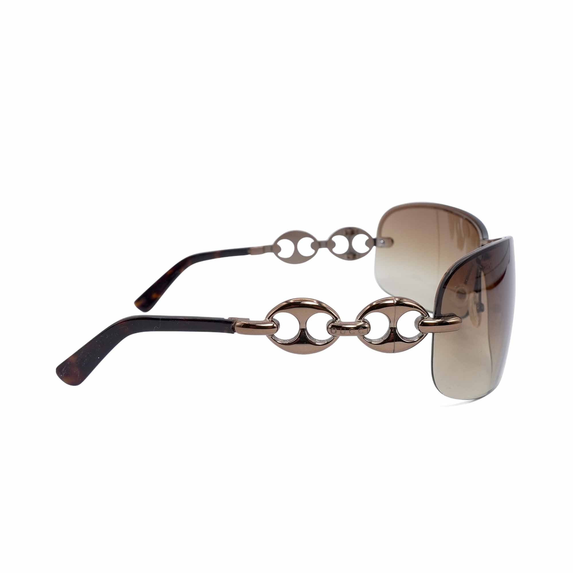 Gucci frameless shield sunglasses with brown ombre lenses and gold mariner link arms.