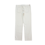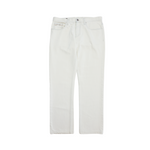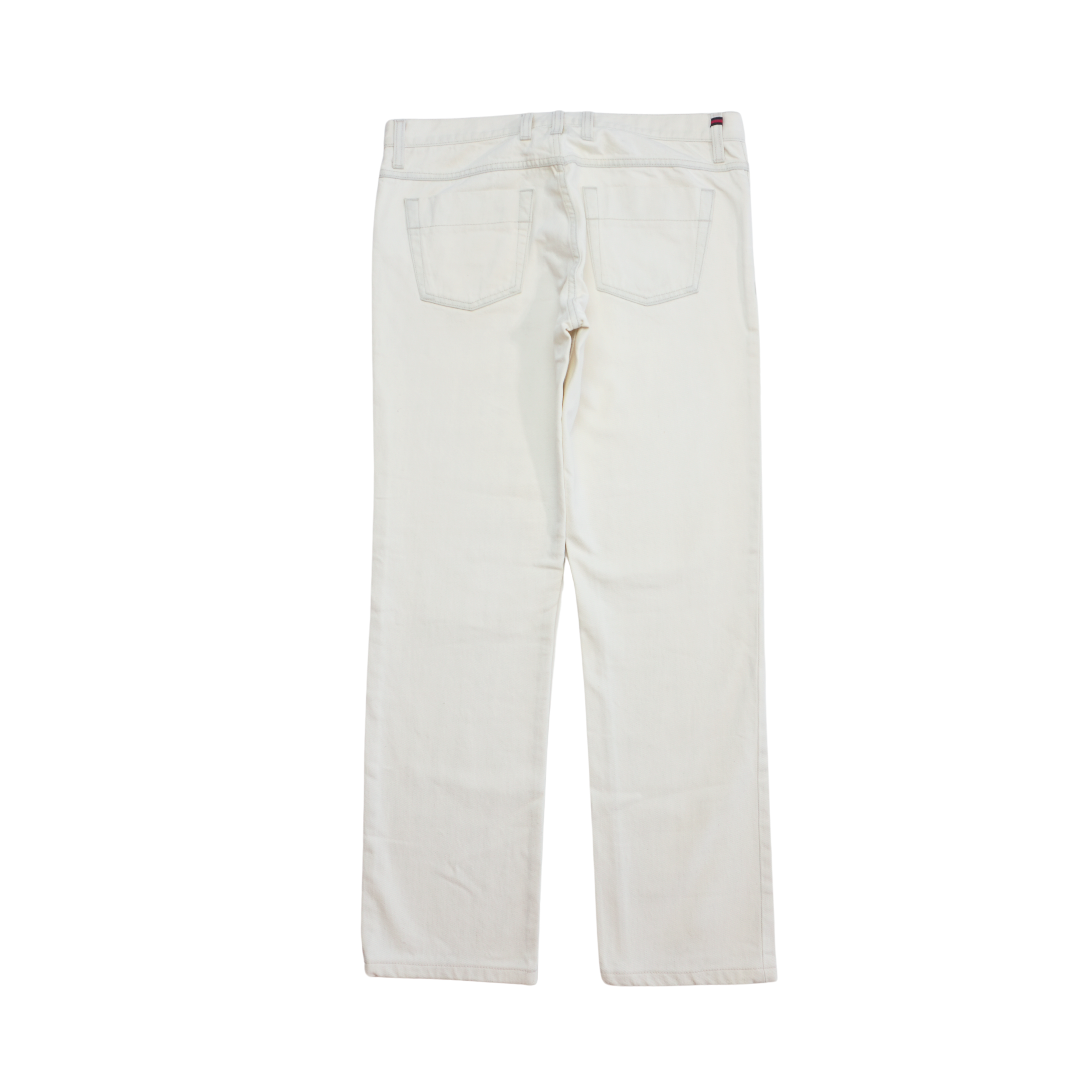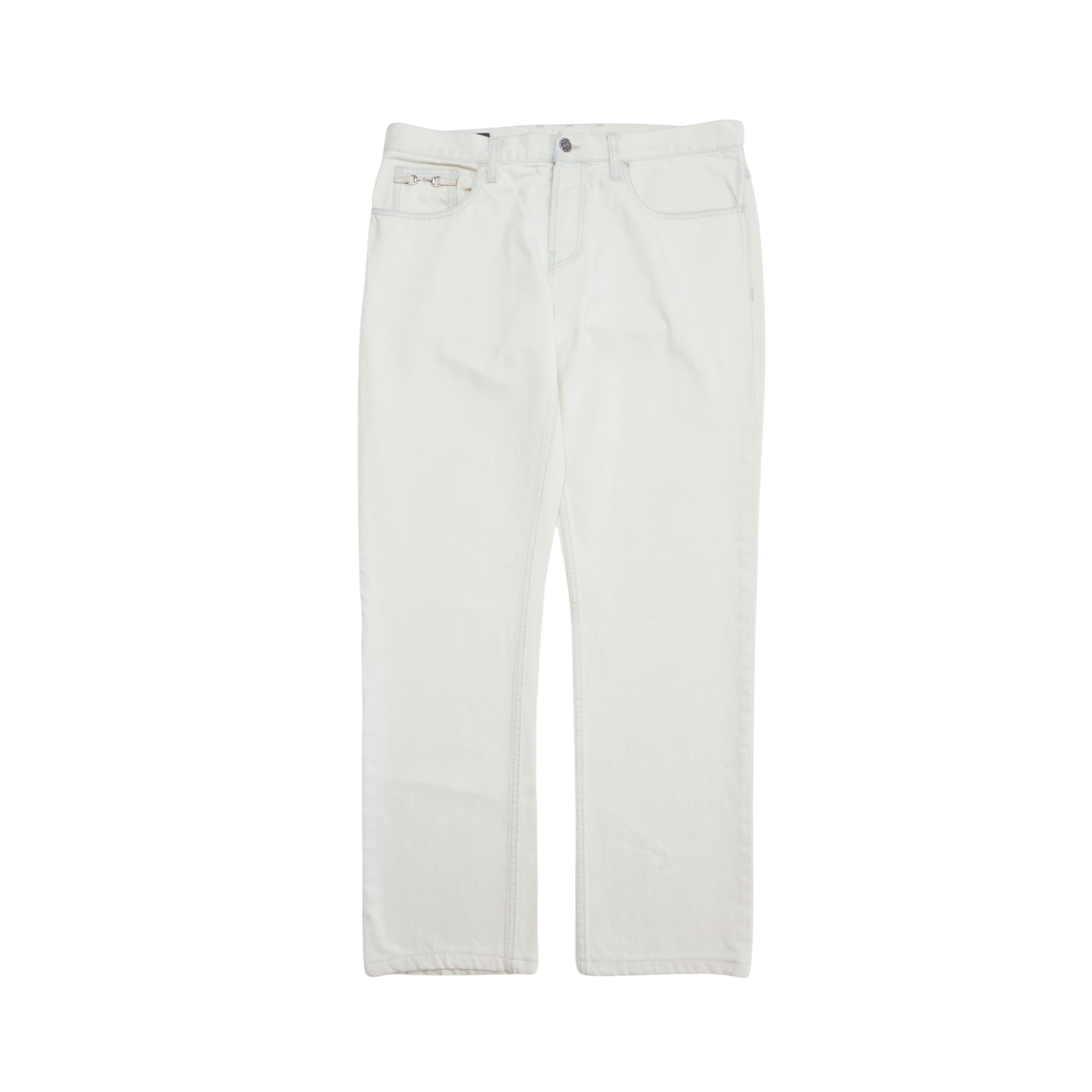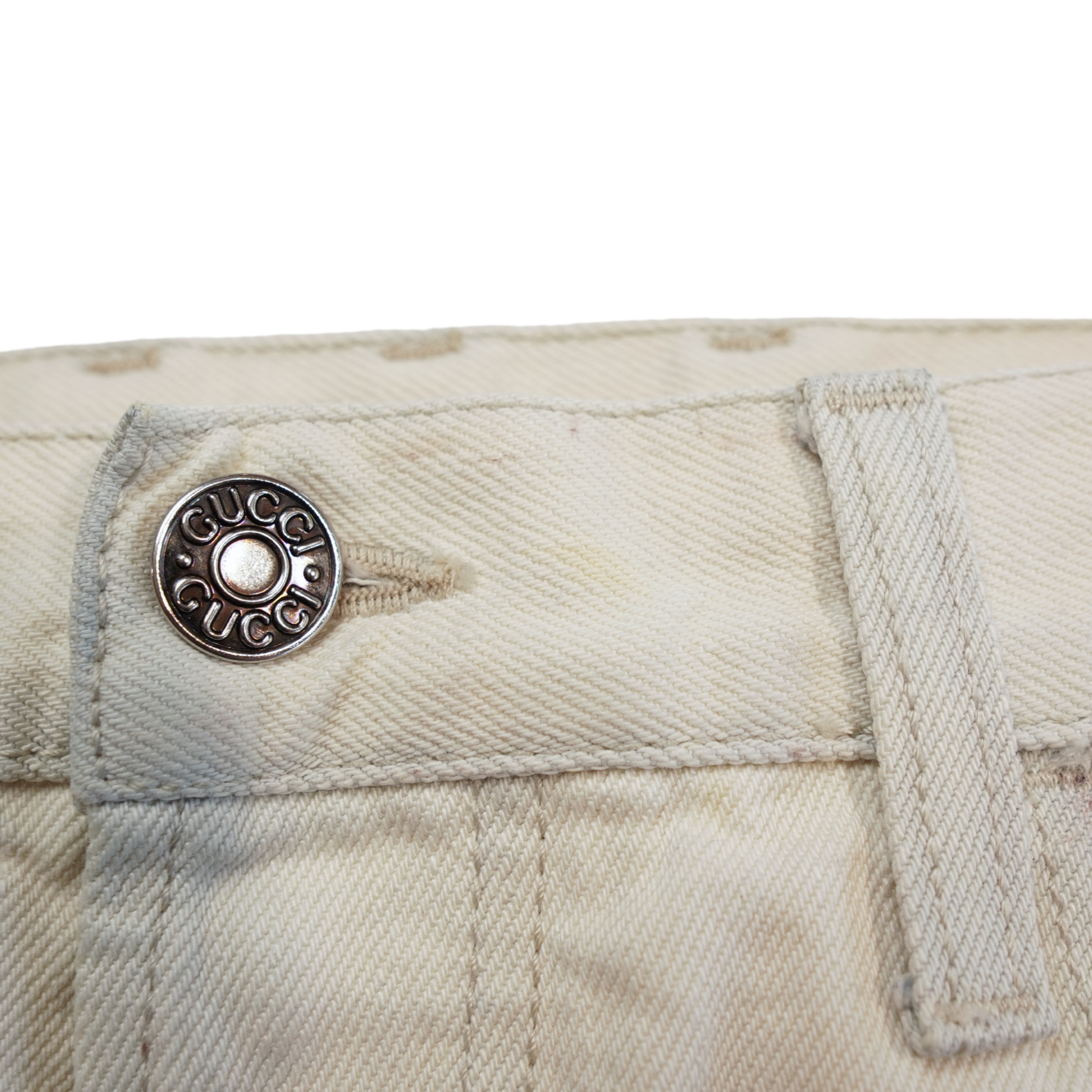 Gucci slim-fit jeans in cream denim with a silver horsebit buckle detail at the front pocket, a small red and blue racing stripe tab on the back waistband, and a cropped leg fit.
