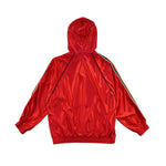 Gucci 'Track' hoodie in red shiny polyester with navy trim, a red, green and cream racing stripe down the sleeves, a drawstring hood, and a small vintage logo patch on the chest. From the spring-summer 2021 collection.