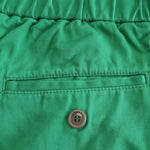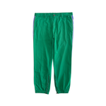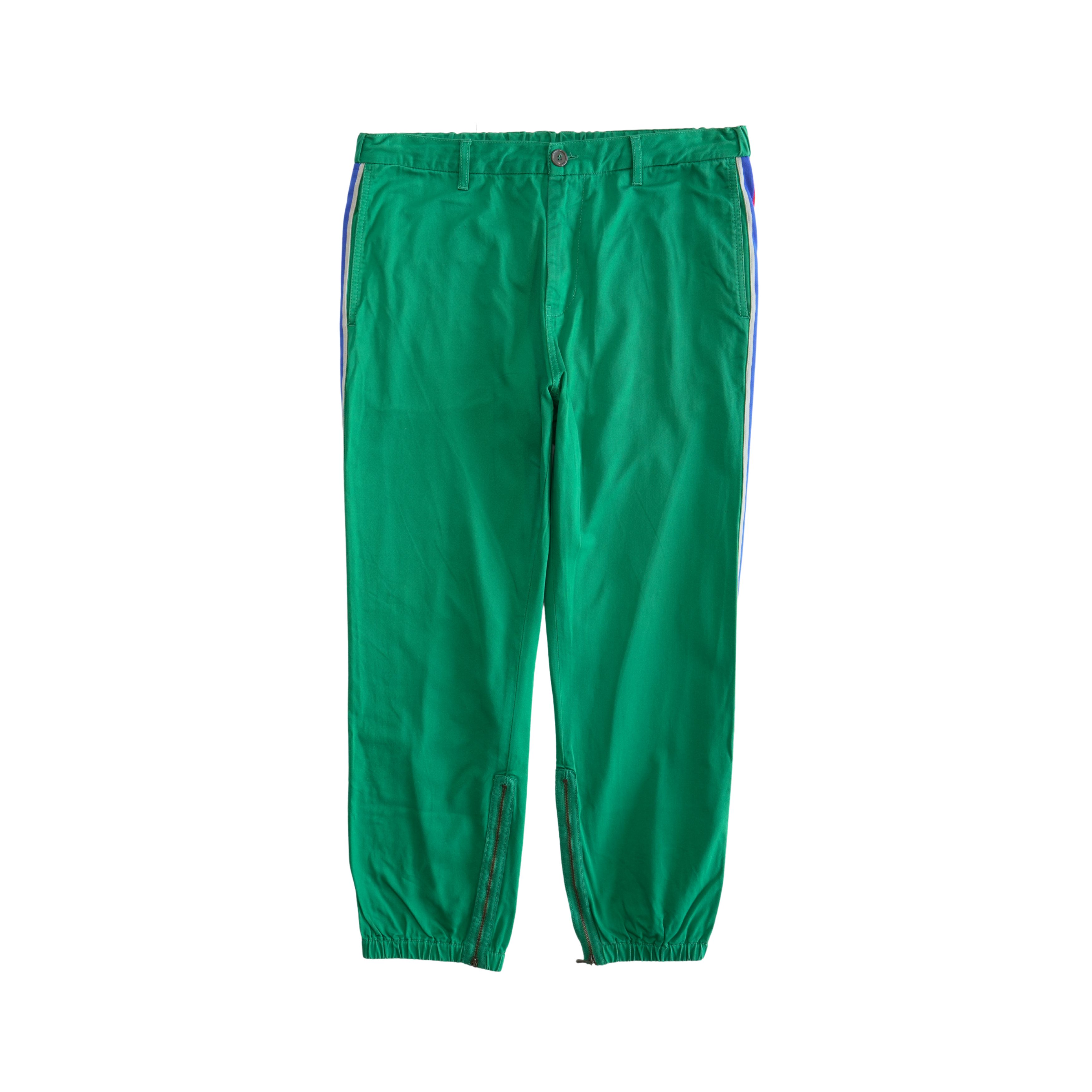 Gucci straight-leg pants in bright green cotton with a red, blue and cream racing stripe down the side seams and elastic hems with a gold zip opening.