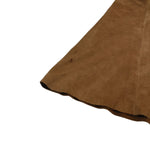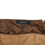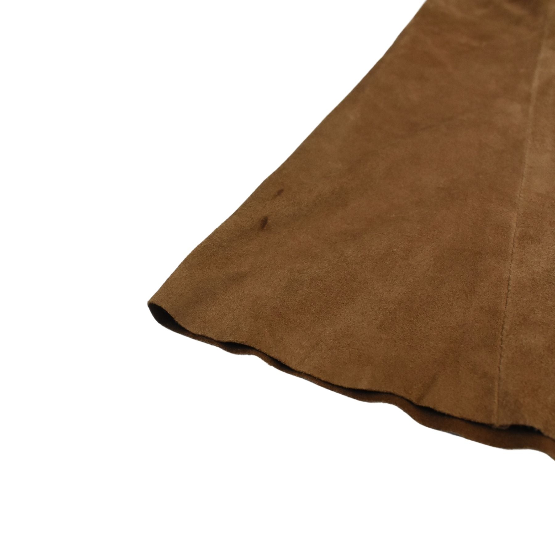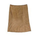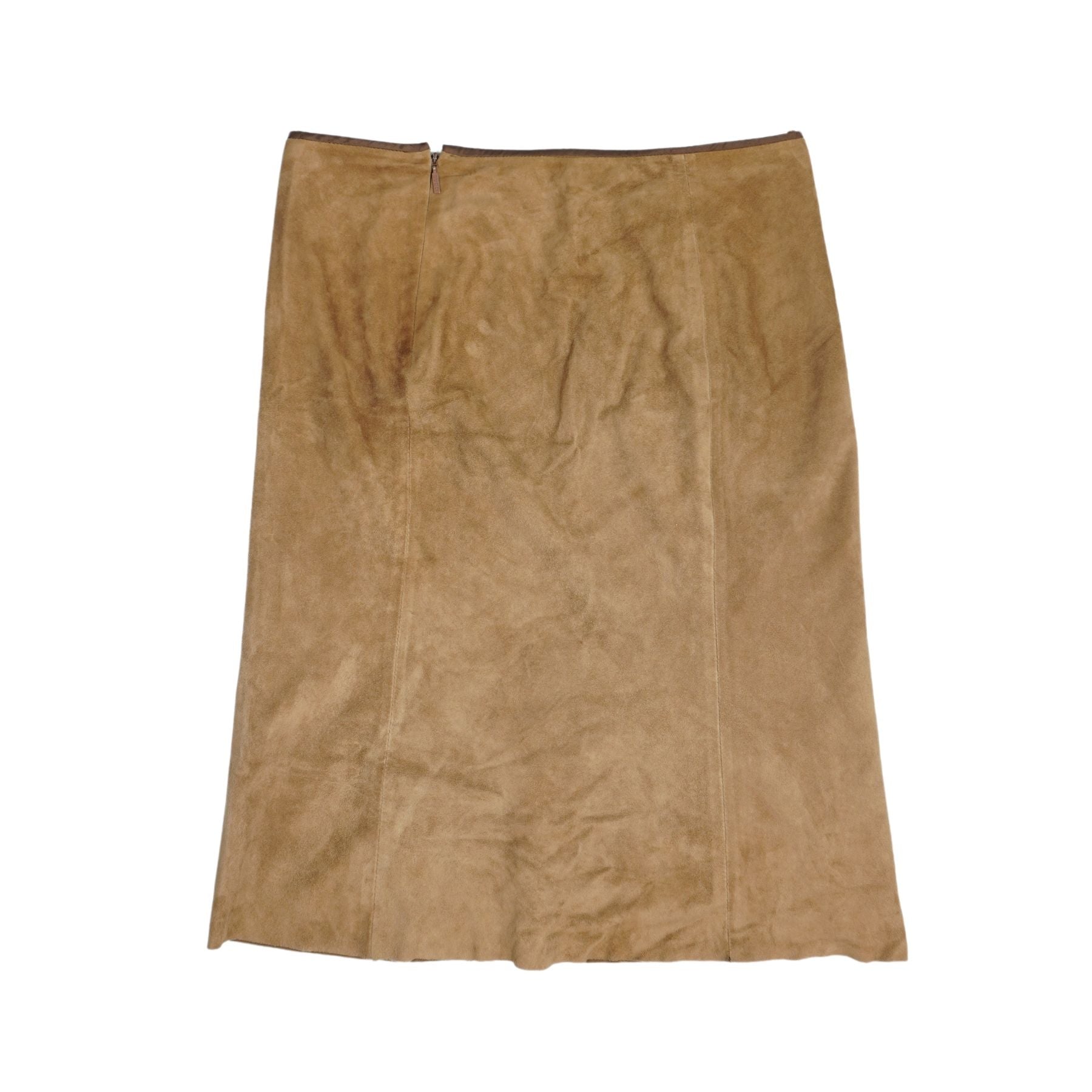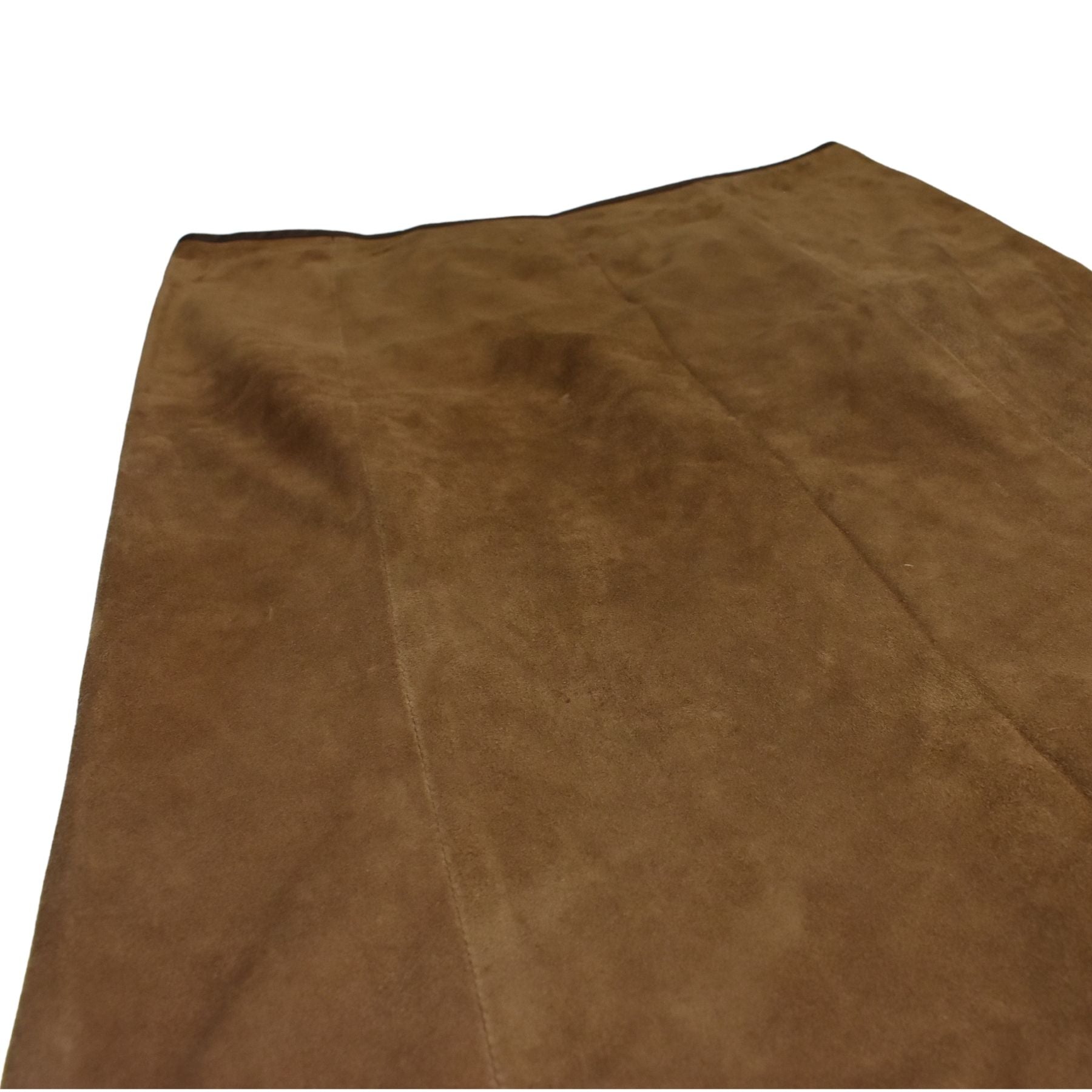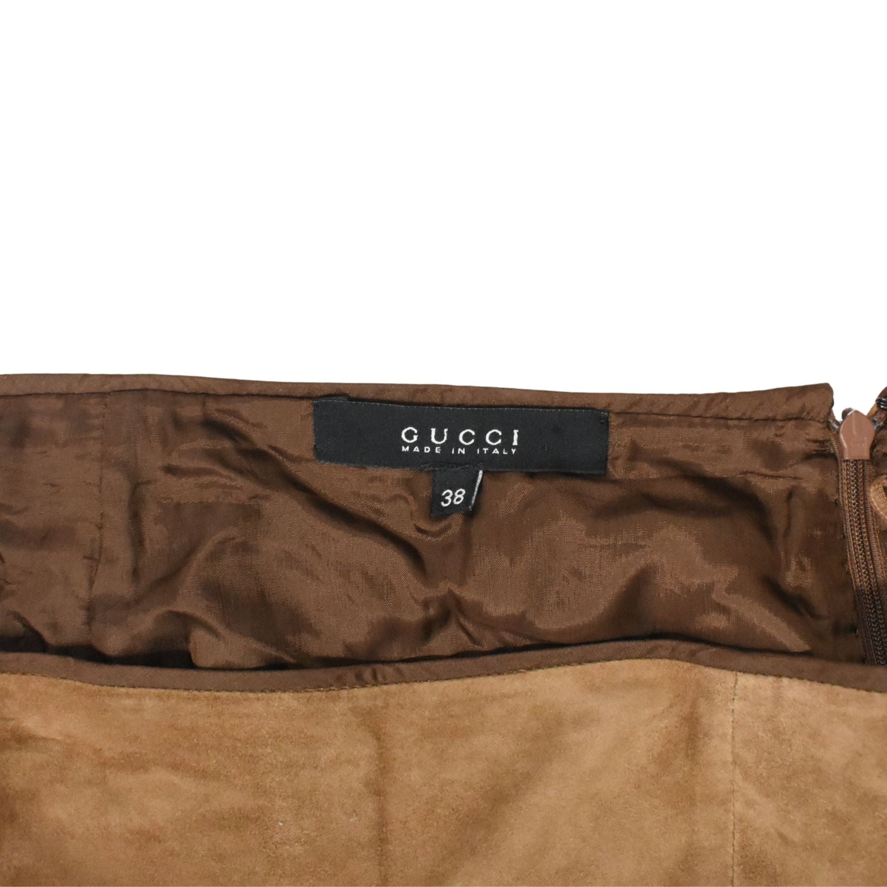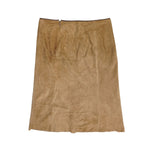 Gucci midi-length straight skirt in brown suede with brown satin trim at the waist and a hidden zip closure.