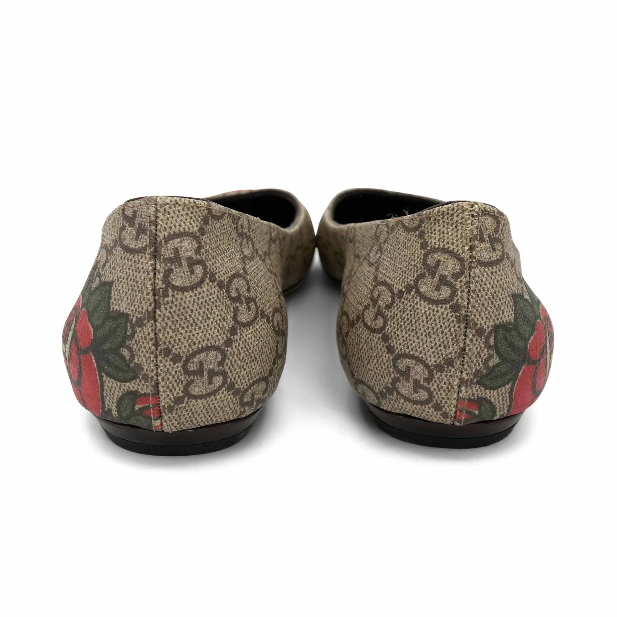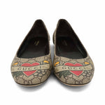 Gucci 'Tattoo' ballet flats in beige brown 'GG Supreme' printed coated canvas with red and green tattoo graphics at the heel and toe.