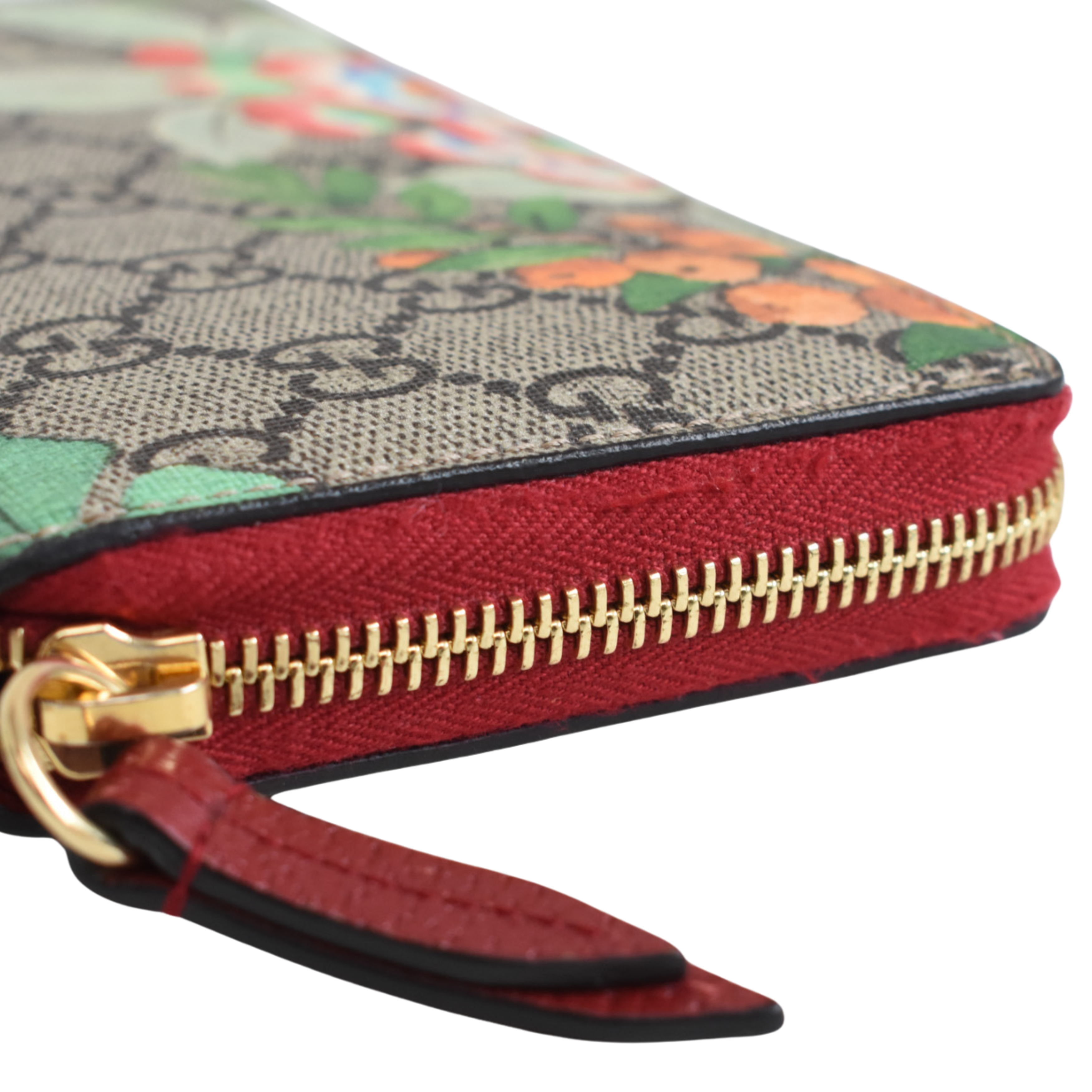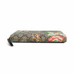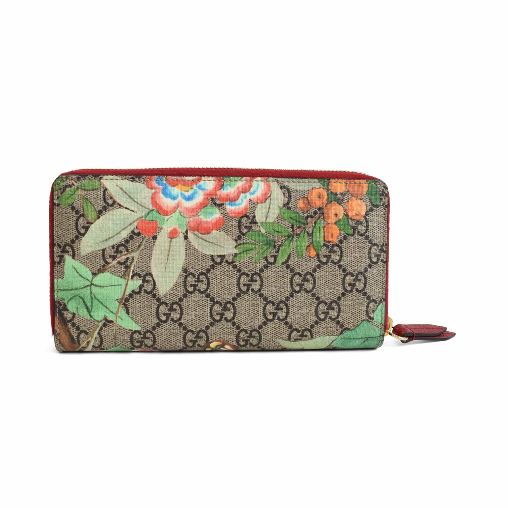 Gucci 'Tian Supreme GG Monogram' continental zip around wallet in beige monogram coated canvas with tropical print and red zipper tape. Features a red leather lining with 12 card slots, 3 divided pockets, and a zip pocket.